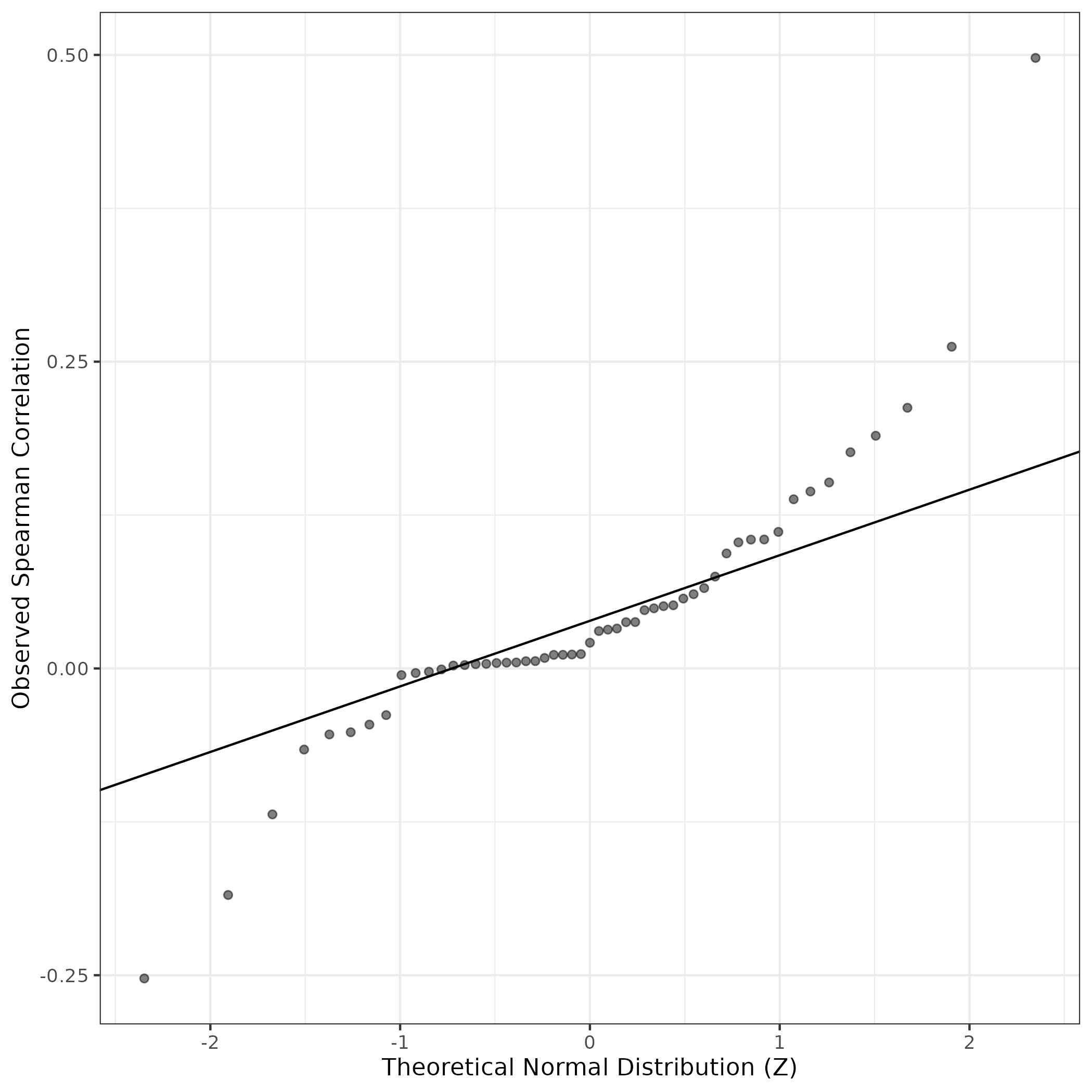 QQ-plot of gene loadings, averaged over both independent splits of the data