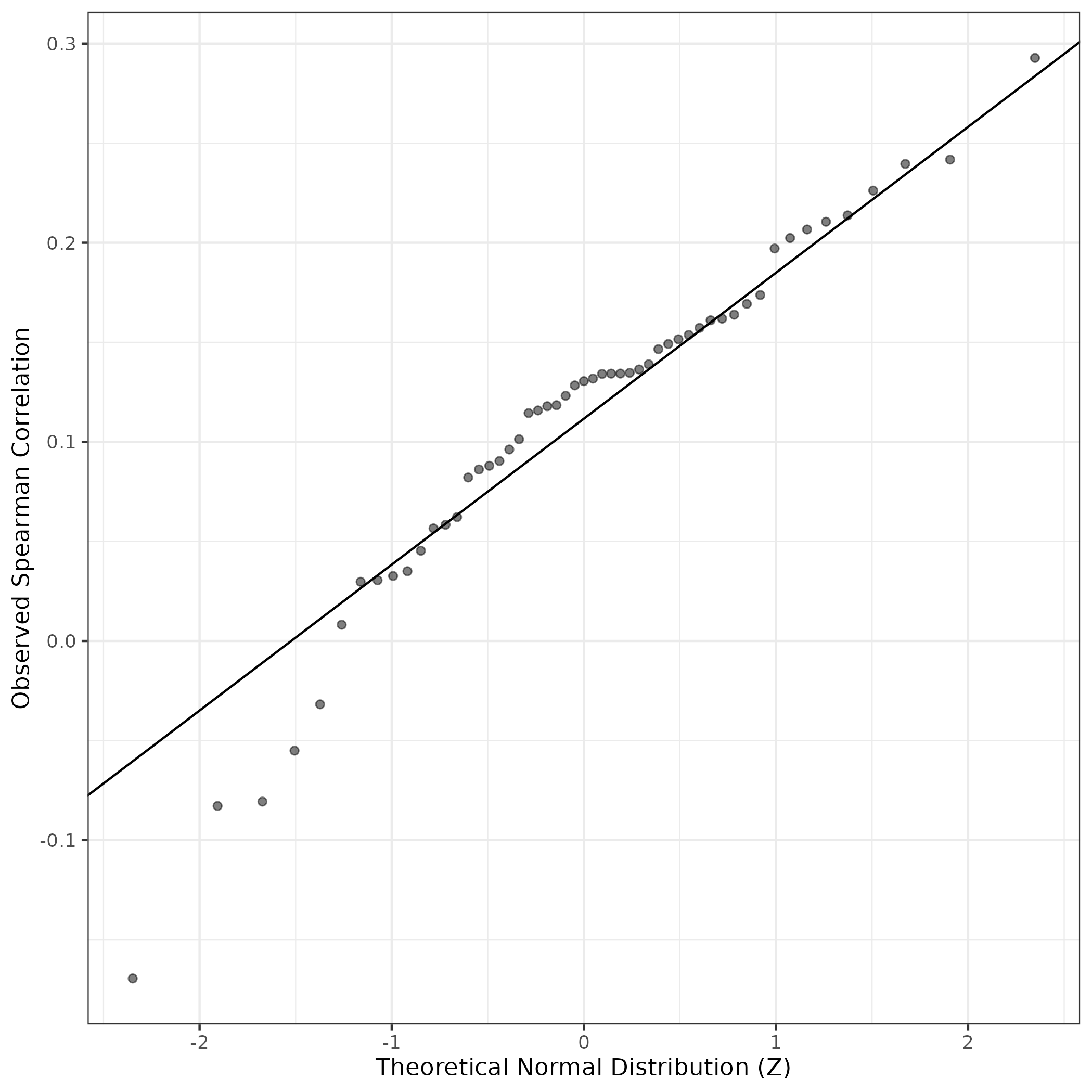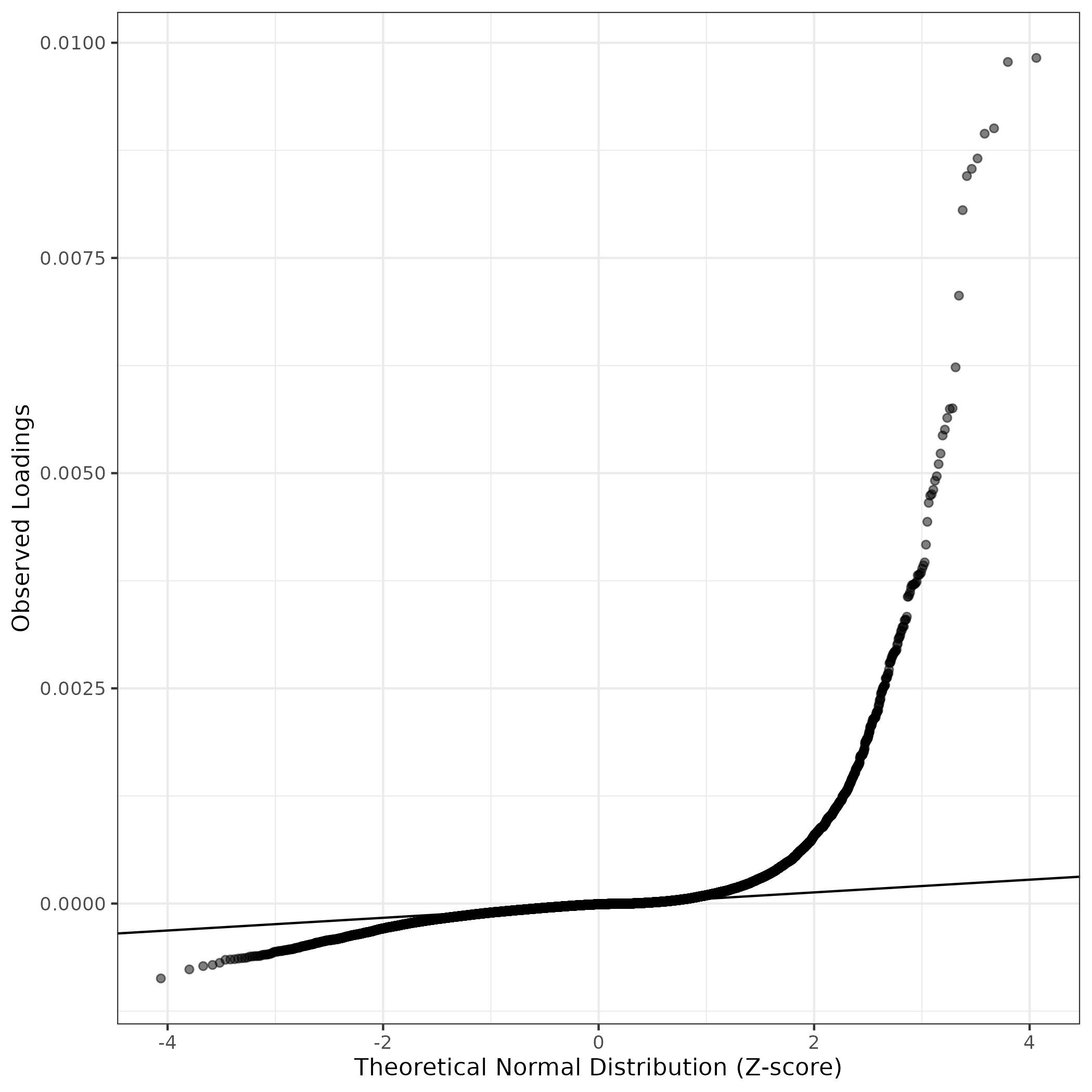 QQ-plot of gene loadings, averaged over both independent splits of the data
