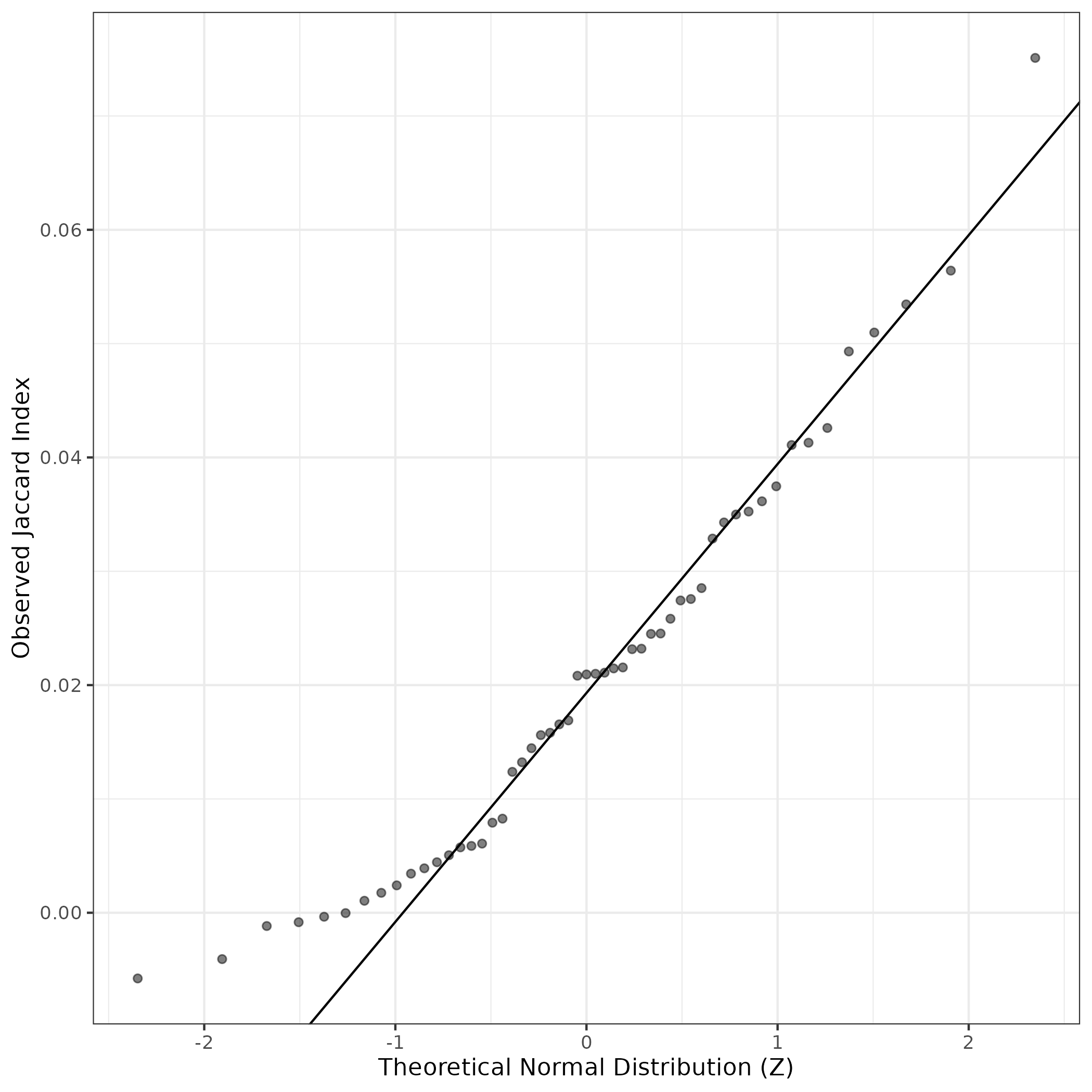 A similar QQ-plot as above, but only for instances where the H value is e.g. > 25, i.e. we are confident that the expression program is active above noise. Agreemenet between these binary vectors is tested using the Jaccard Index, with the P-values calculated by an exact test: