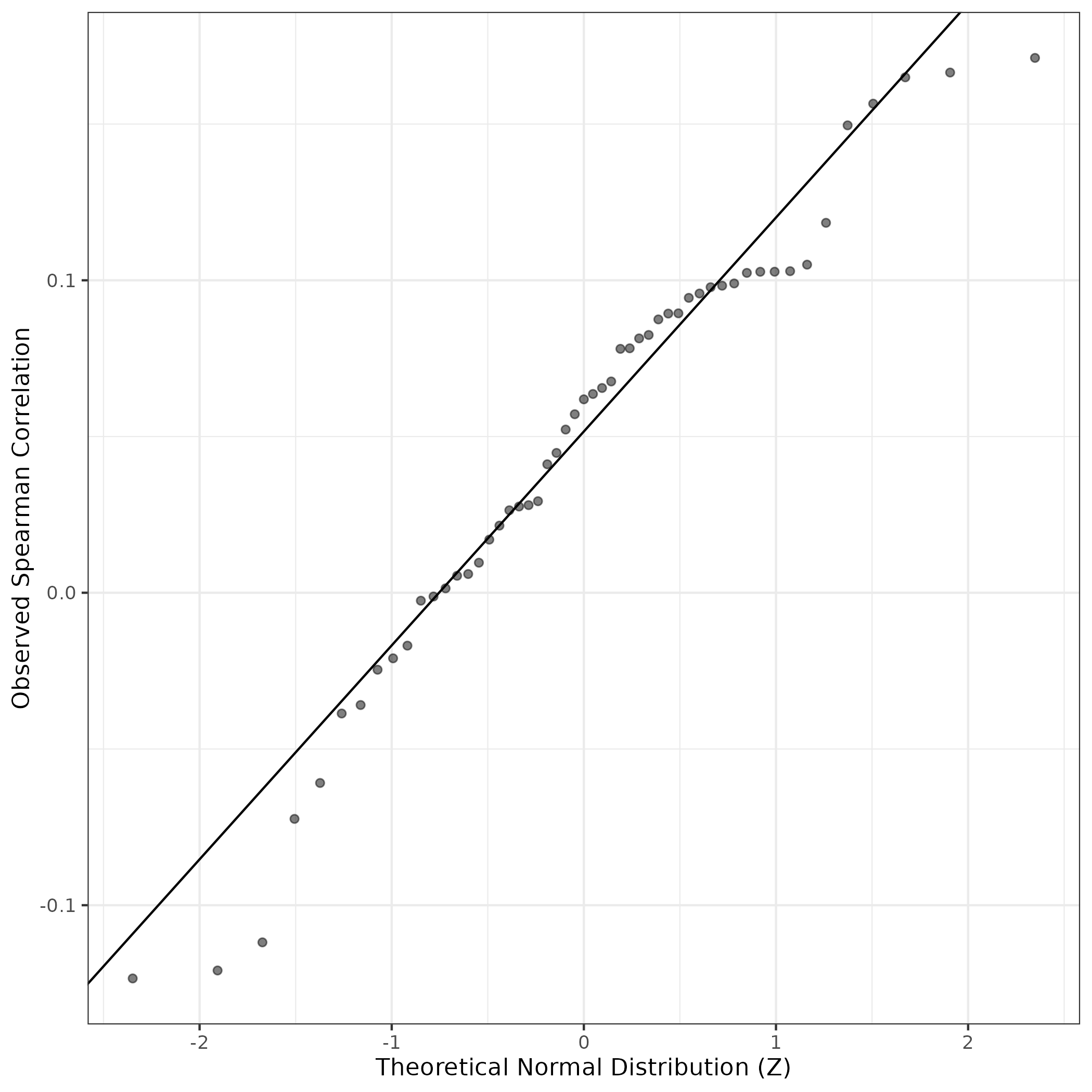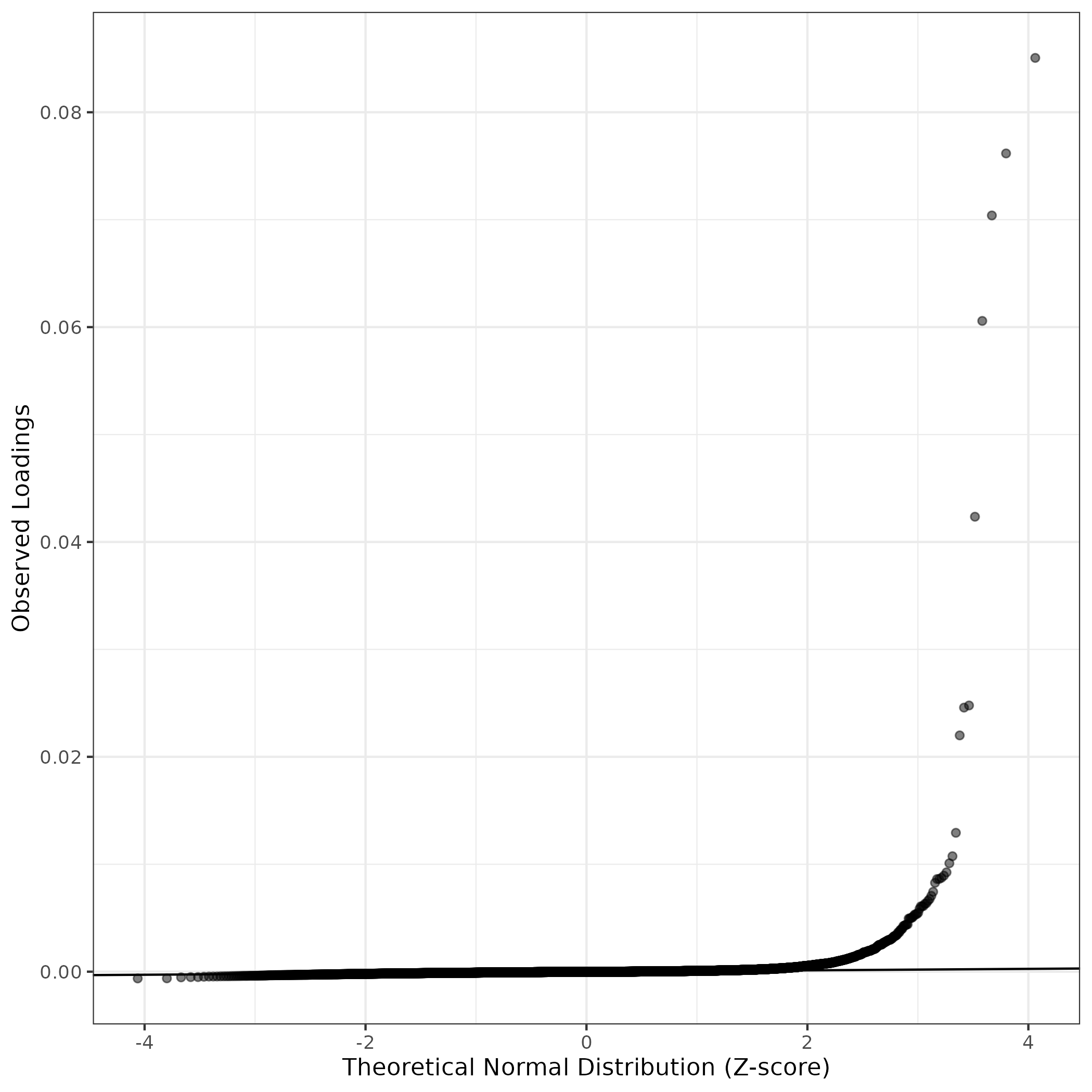 QQ-plot of gene loadings, averaged over both independent splits of the data