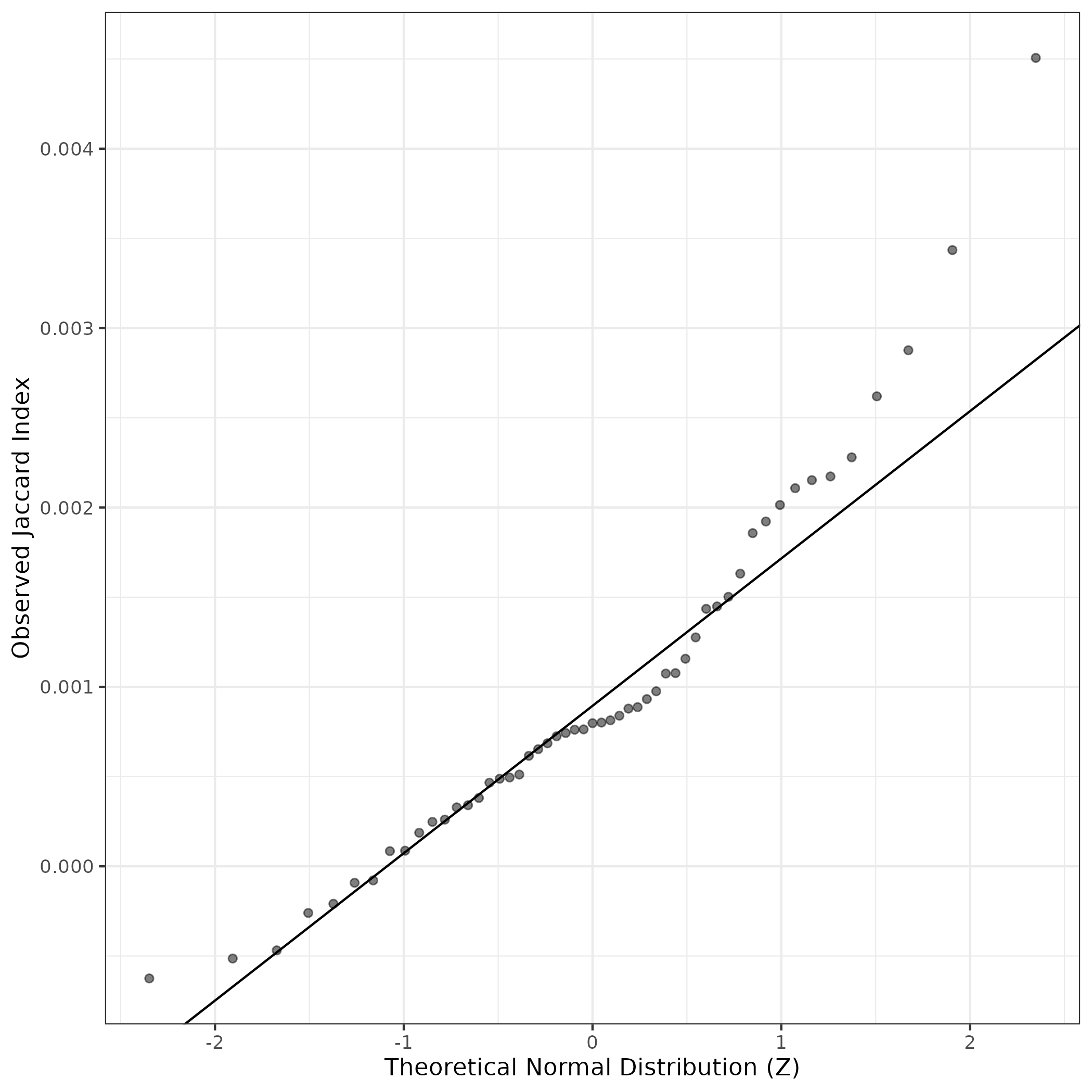 A similar QQ-plot as above, but only for instances where the H value is e.g. > 25, i.e. we are confident that the expression program is active above noise. Agreemenet between these binary vectors is tested using the Jaccard Index, with the P-values calculated by an exact test: