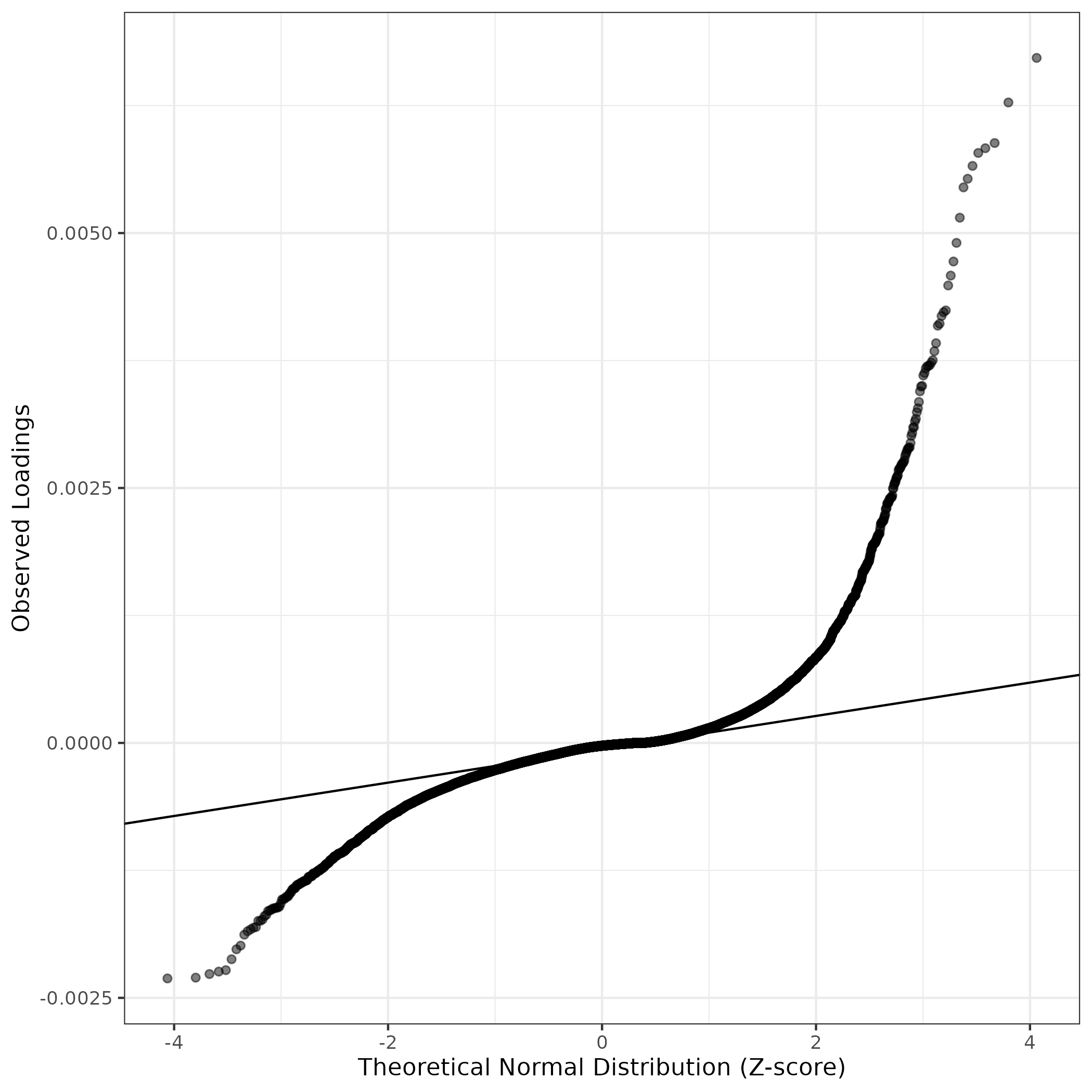 A similar QQ-plot as above, but only for instances where the H value is e.g. > 25, i.e. we are confident that the expression program is active above noise. Agreemenet between these binary vectors is tested using the Jaccard Index, with the P-values calculated by an exact test: