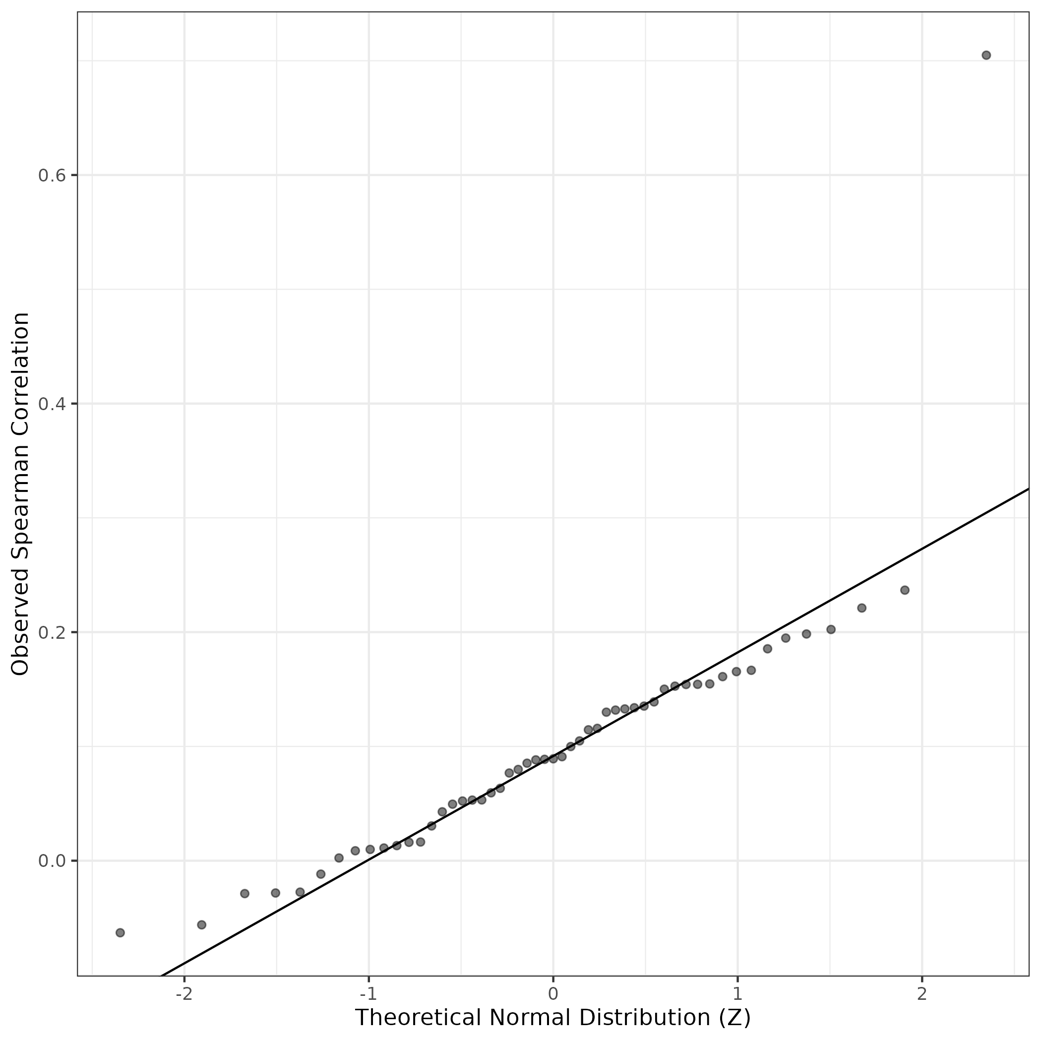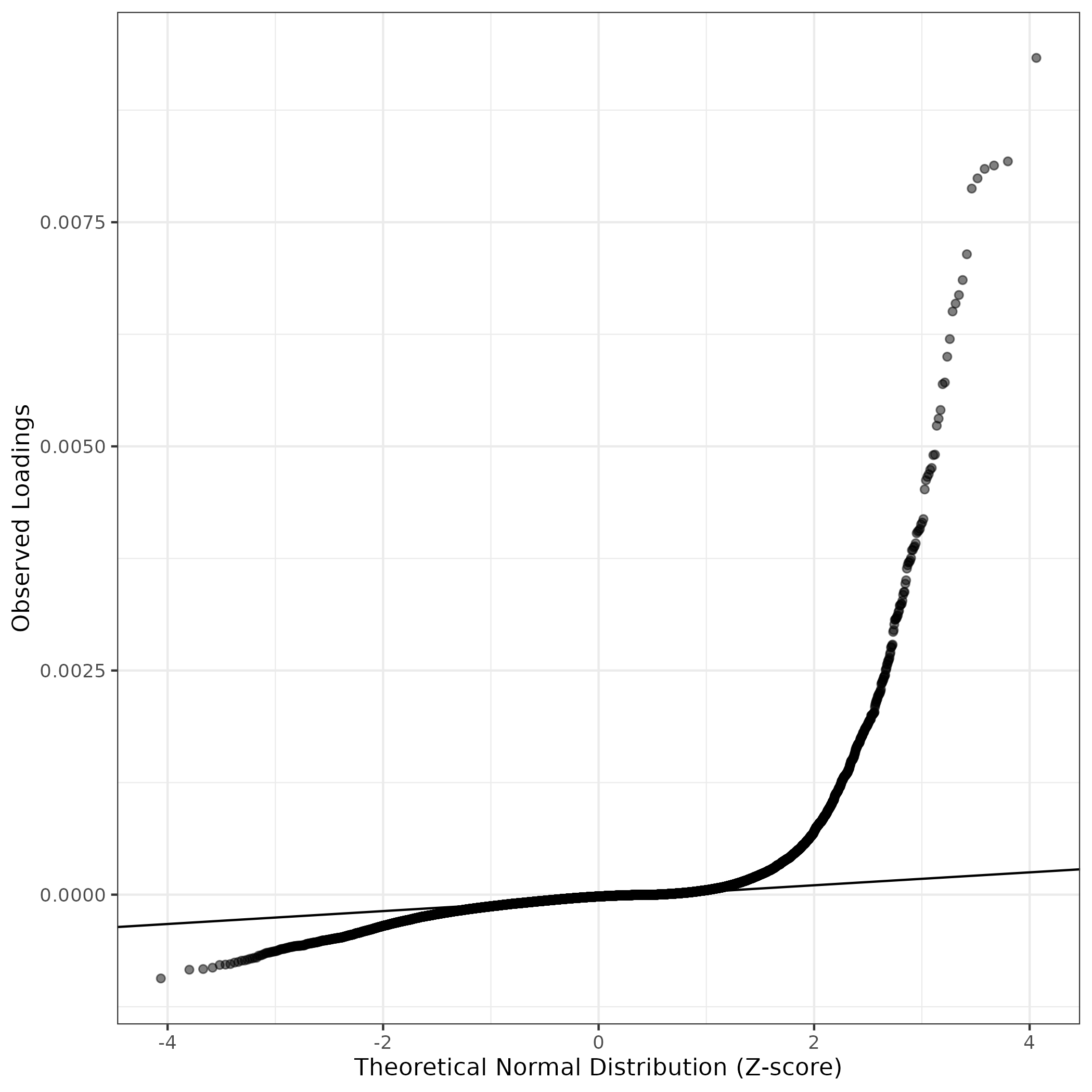 QQ-plot of gene loadings, averaged over both independent splits of the data