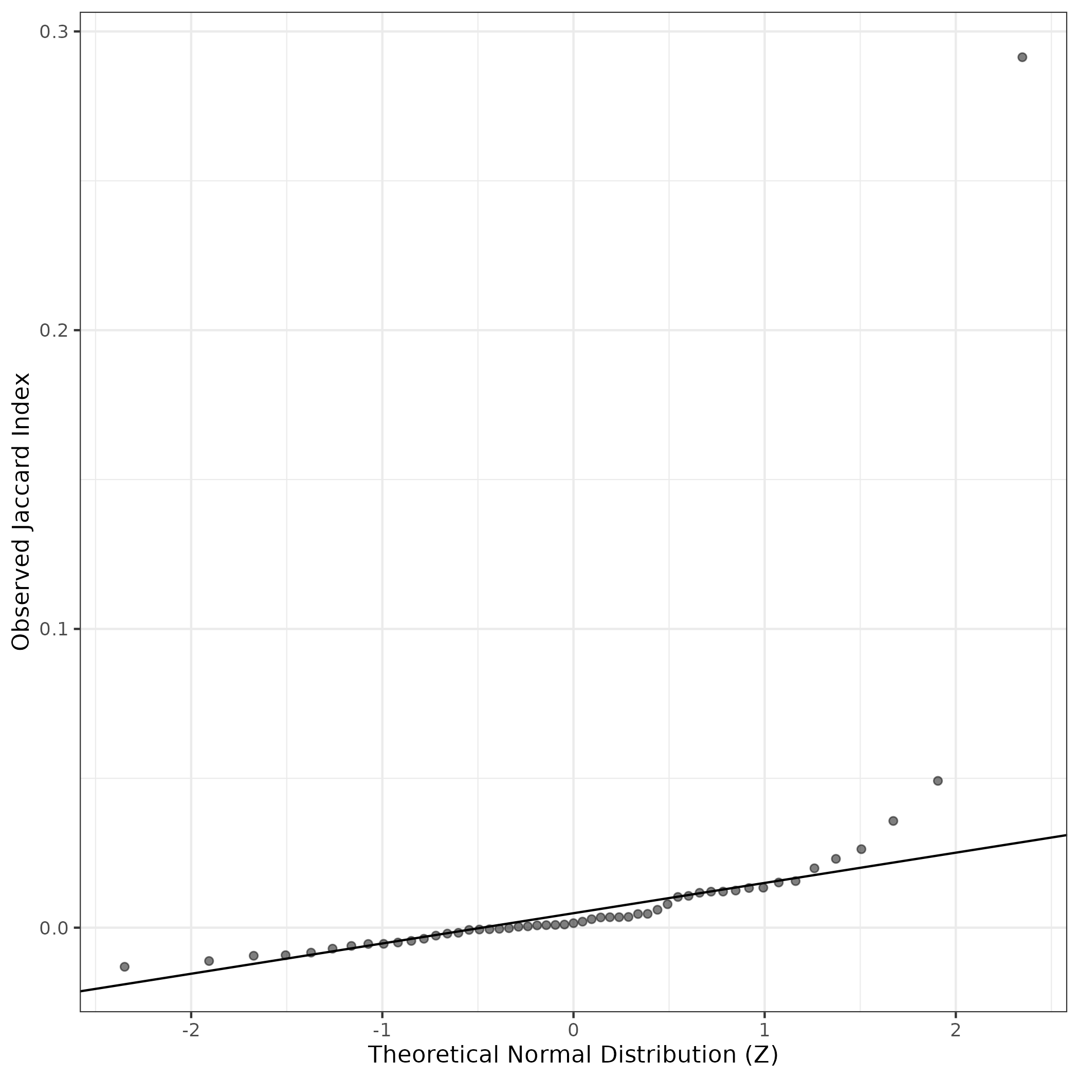 A similar QQ-plot as above, but only for instances where the H value is e.g. > 25, i.e. we are confident that the expression program is active above noise. Agreemenet between these binary vectors is tested using the Jaccard Index, with the P-values calculated by an exact test: