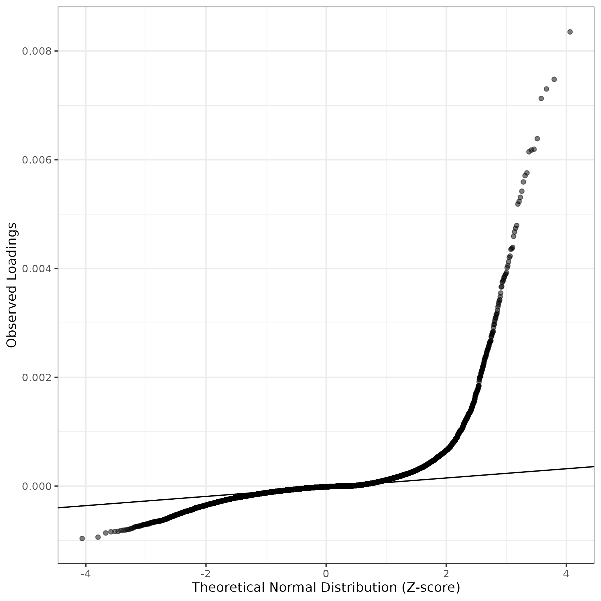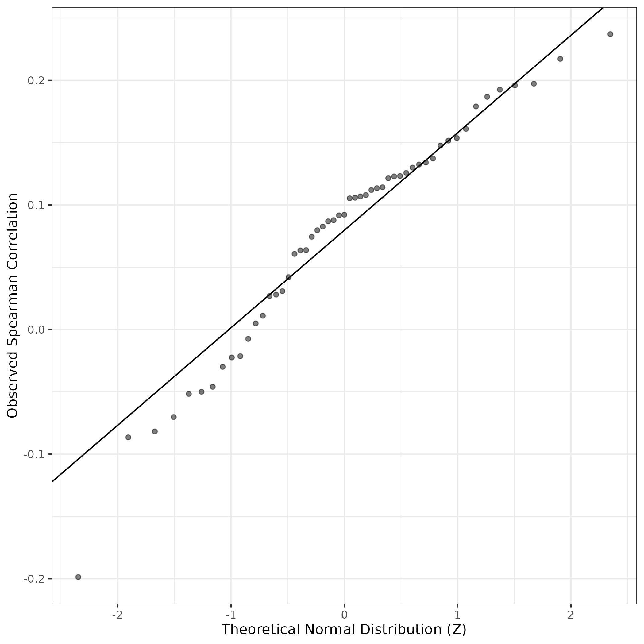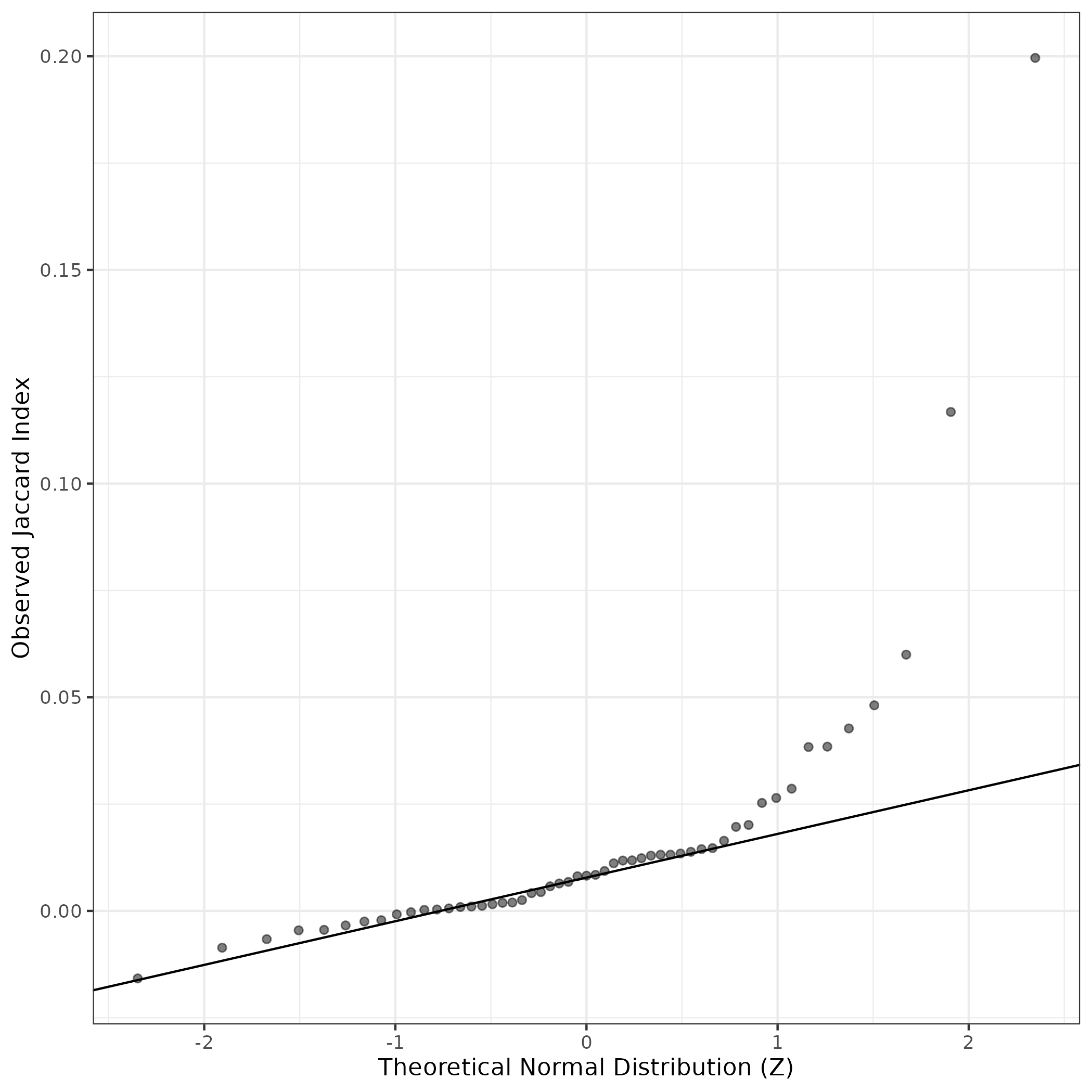 A similar QQ-plot as above, but only for instances where the H value is e.g. > 25, i.e. we are confident that the expression program is active above noise. Agreemenet between these binary vectors is tested using the Jaccard Index, with the P-values calculated by an exact test: