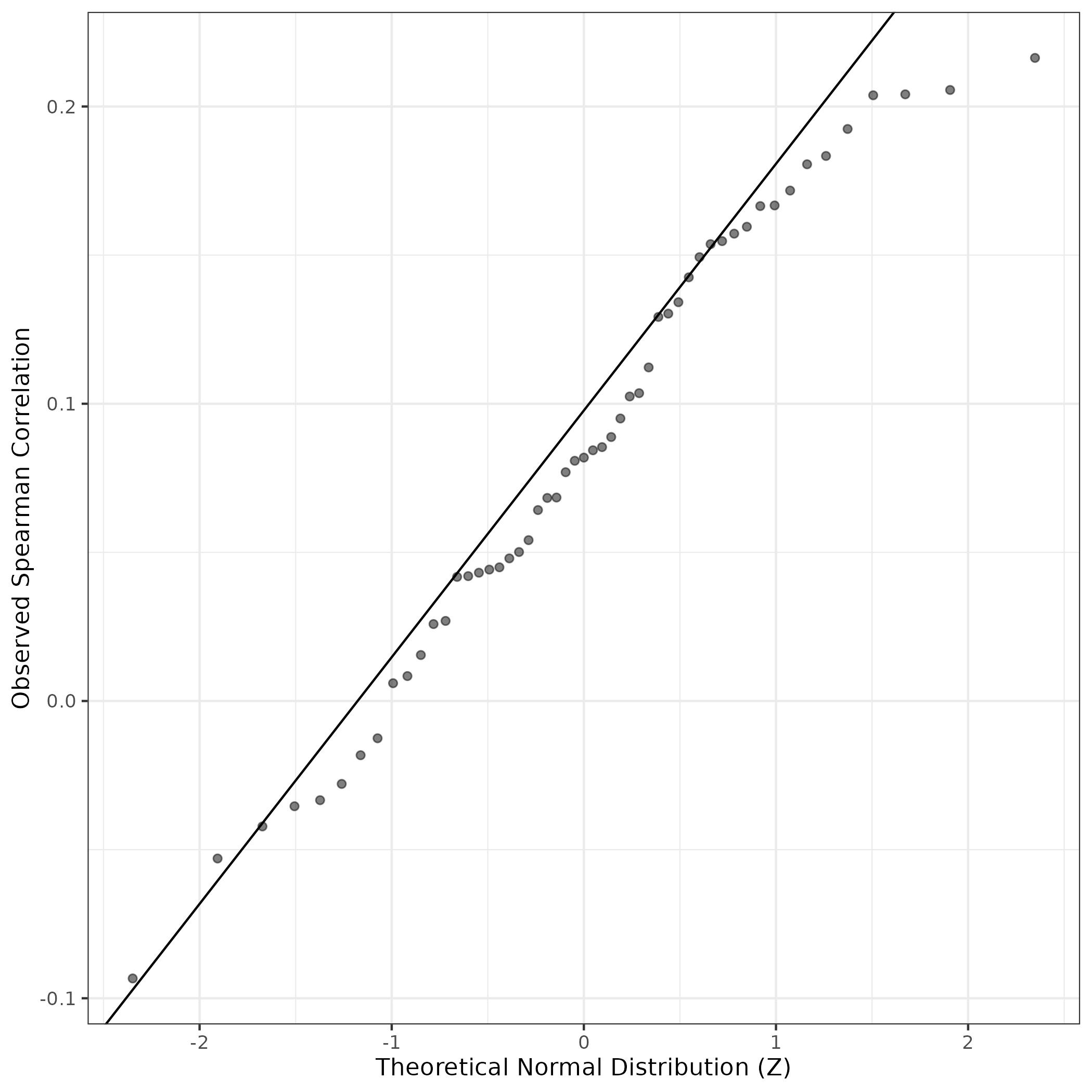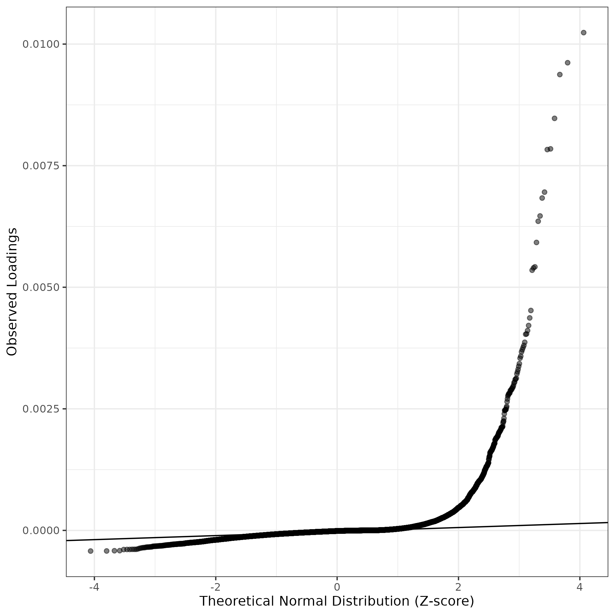 QQ-plot of gene loadings, averaged over both independent splits of the data