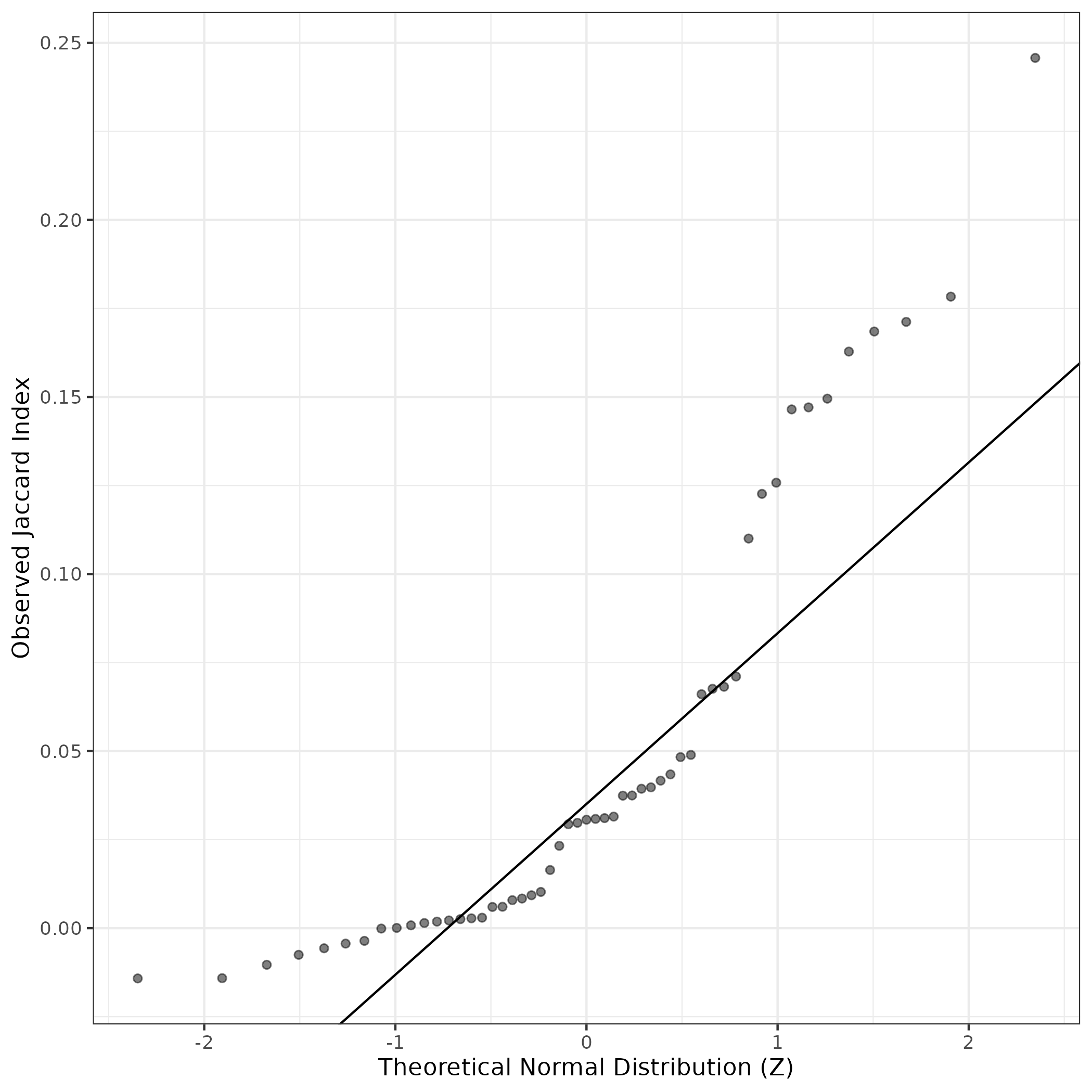 A similar QQ-plot as above, but only for instances where the H value is e.g. > 25, i.e. we are confident that the expression program is active above noise. Agreemenet between these binary vectors is tested using the Jaccard Index, with the P-values calculated by an exact test: