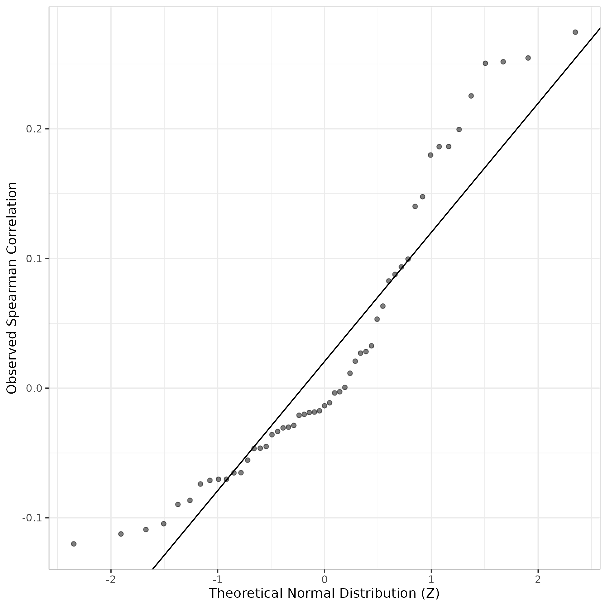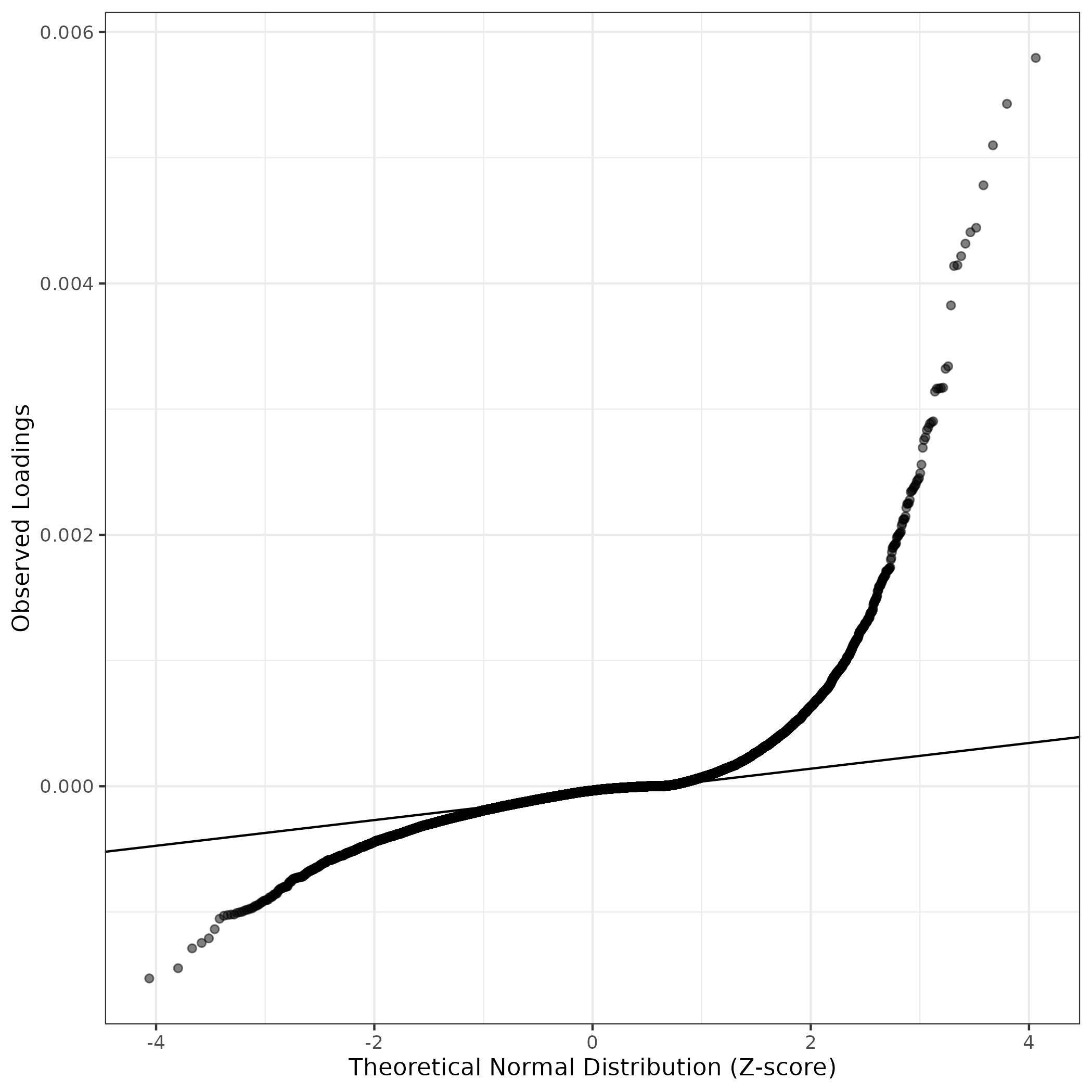 QQ-plot of gene loadings, averaged over both independent splits of the data