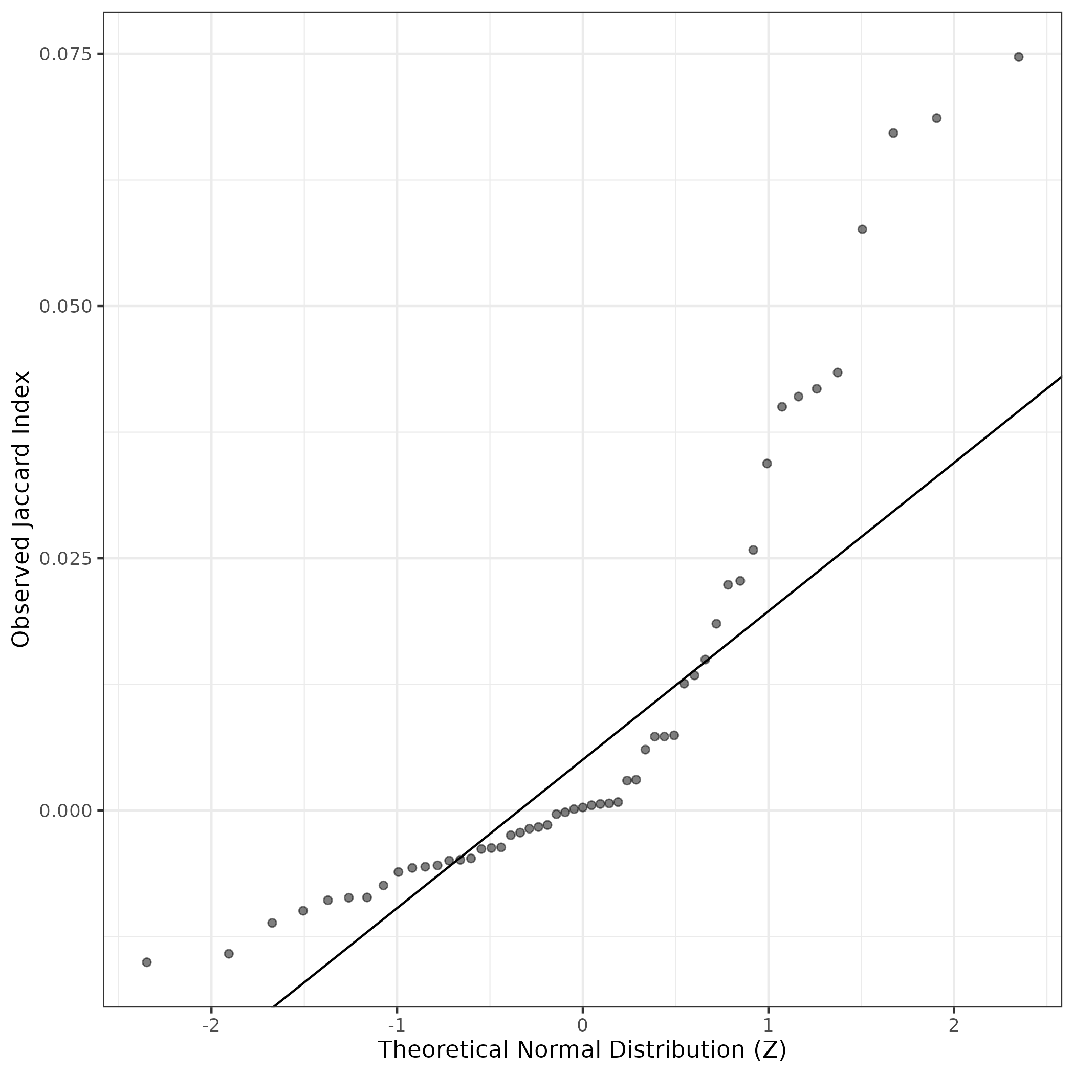 A similar QQ-plot as above, but only for instances where the H value is e.g. > 25, i.e. we are confident that the expression program is active above noise. Agreemenet between these binary vectors is tested using the Jaccard Index, with the P-values calculated by an exact test: