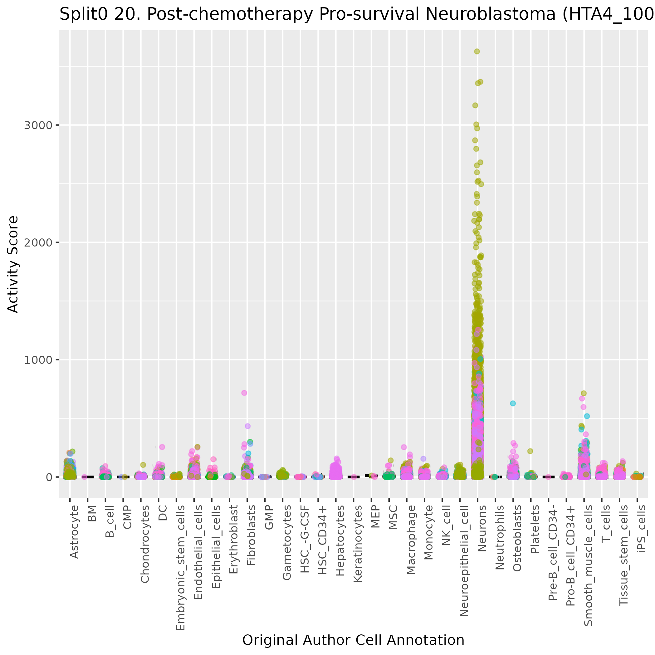 Normal Schwann cell precurors, but not Neuroblastoma Scps (Olsen) Based on their neuroblastoma data and stated on page 6 of the main text of Olsen et al. https://www.biorxiv.org/content/10.1101/2020.05.04.077057v1: Wilcoxon ranksum test P-value for gene set overrepresentation: 9.78e-01 Mean rank of genes in gene set: 18785 Rank on gene expression program of genes in gene set: