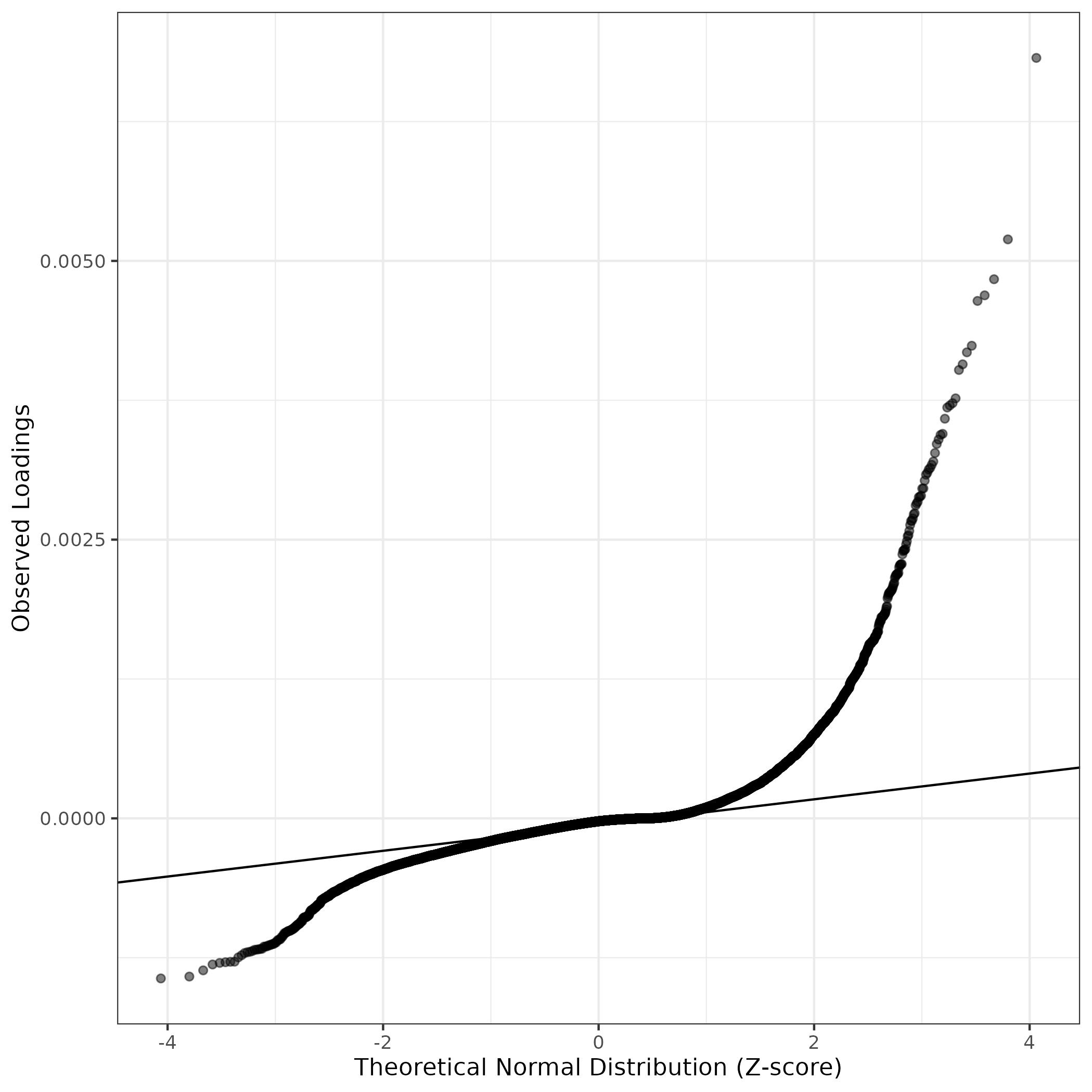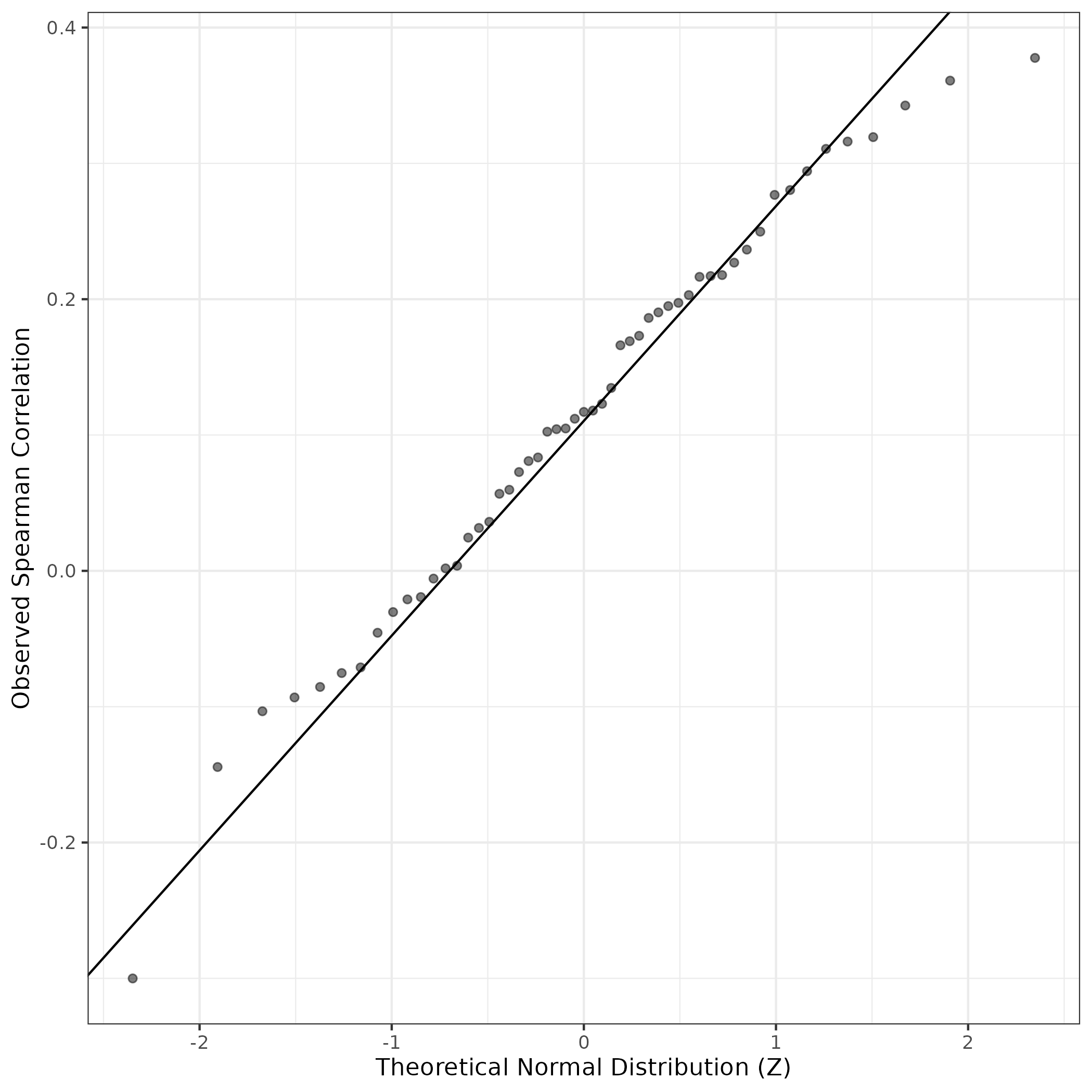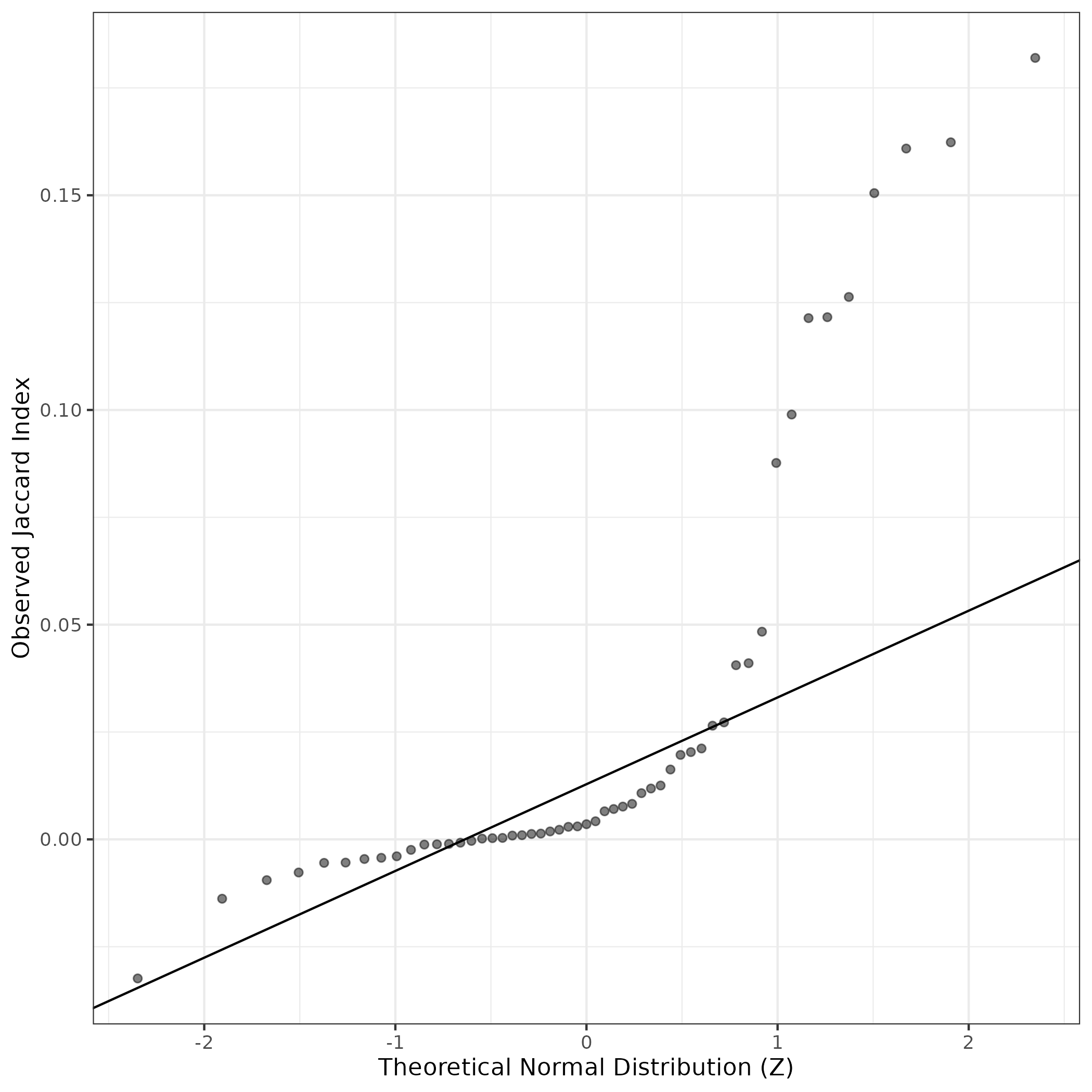 A similar QQ-plot as above, but only for instances where the H value is e.g. > 25, i.e. we are confident that the expression program is active above noise. Agreemenet between these binary vectors is tested using the Jaccard Index, with the P-values calculated by an exact test: