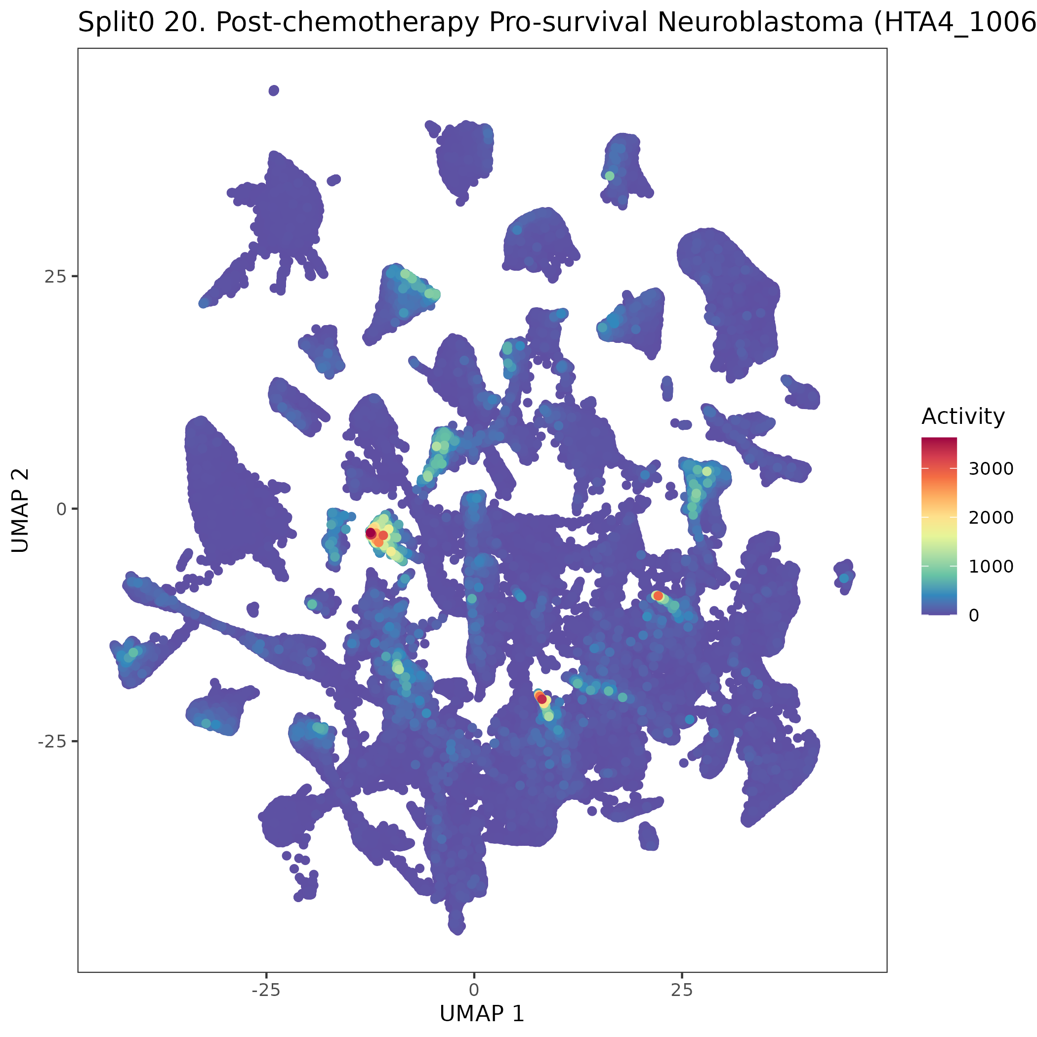 SCPs neuroblastoma unique (Olsen) Similar to above, but for genes unique to neuroblastoma SCP-like cells. Note FN1 is often used as a mesenchymal marker gene.: Wilcoxon ranksum test P-value for gene set overrepresentation: 9.10e-01 Mean rank of genes in gene set: 13298 Rank on gene expression program of genes in gene set: