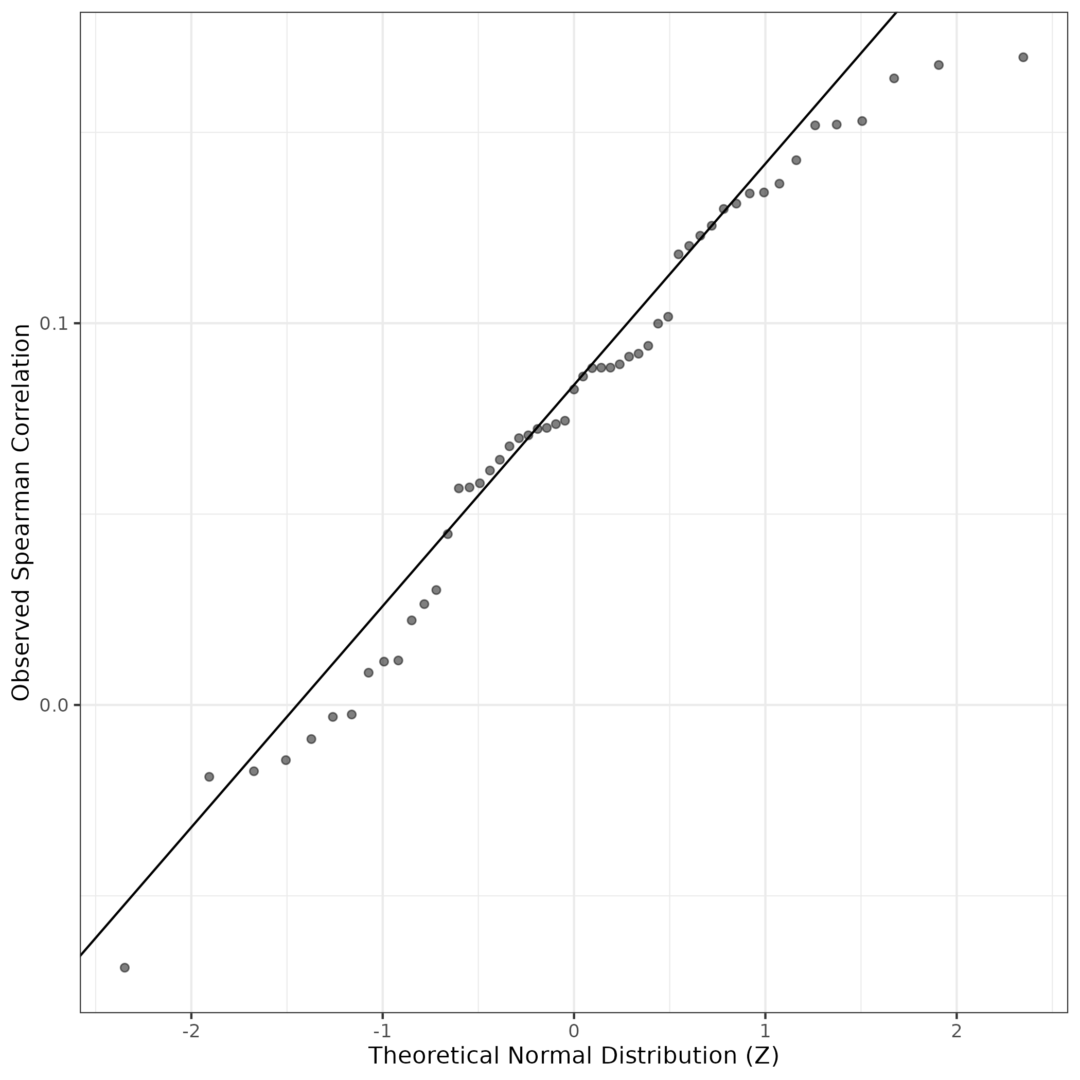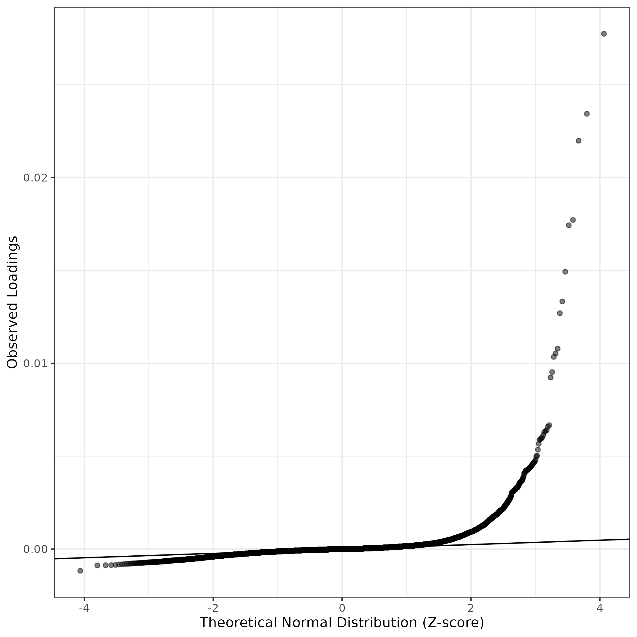 QQ-plot of gene loadings, averaged over both independent splits of the data