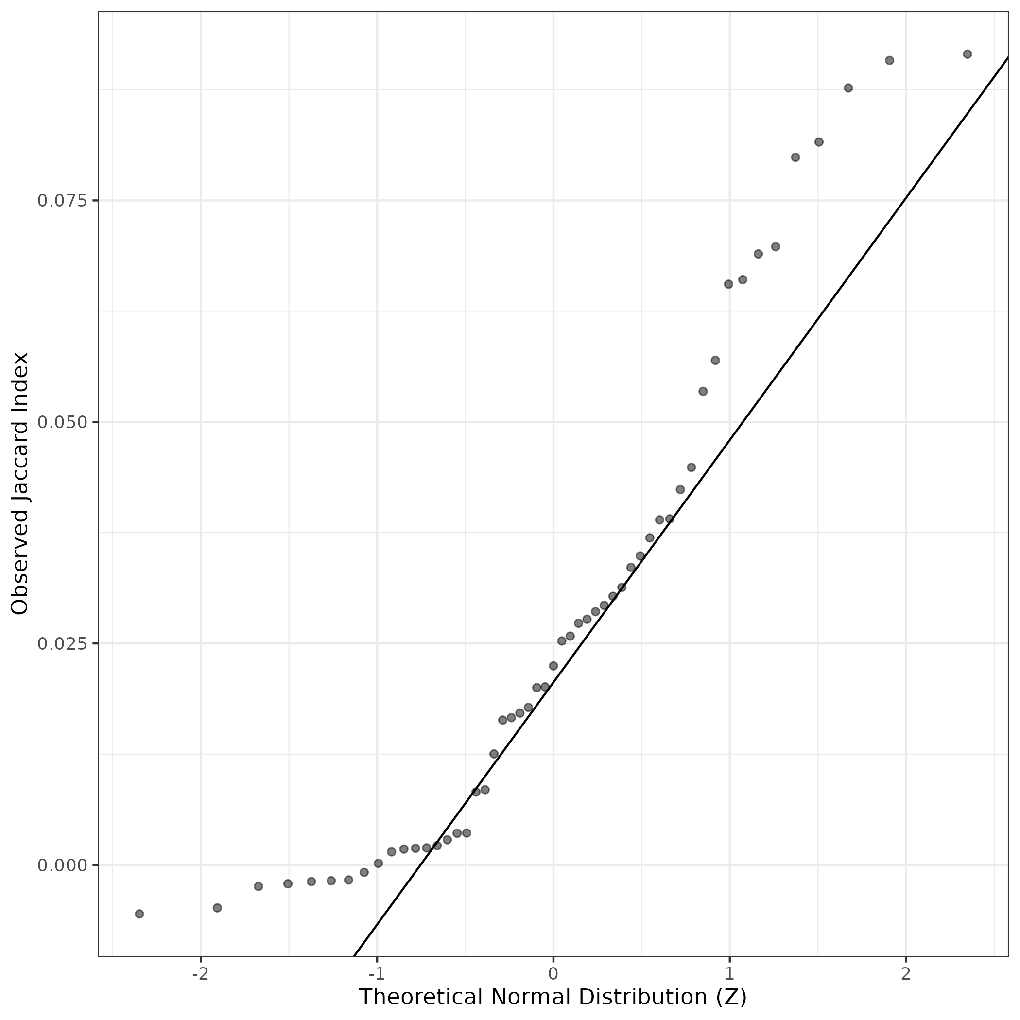 A similar QQ-plot as above, but only for instances where the H value is e.g. > 25, i.e. we are confident that the expression program is active above noise. Agreemenet between these binary vectors is tested using the Jaccard Index, with the P-values calculated by an exact test:
