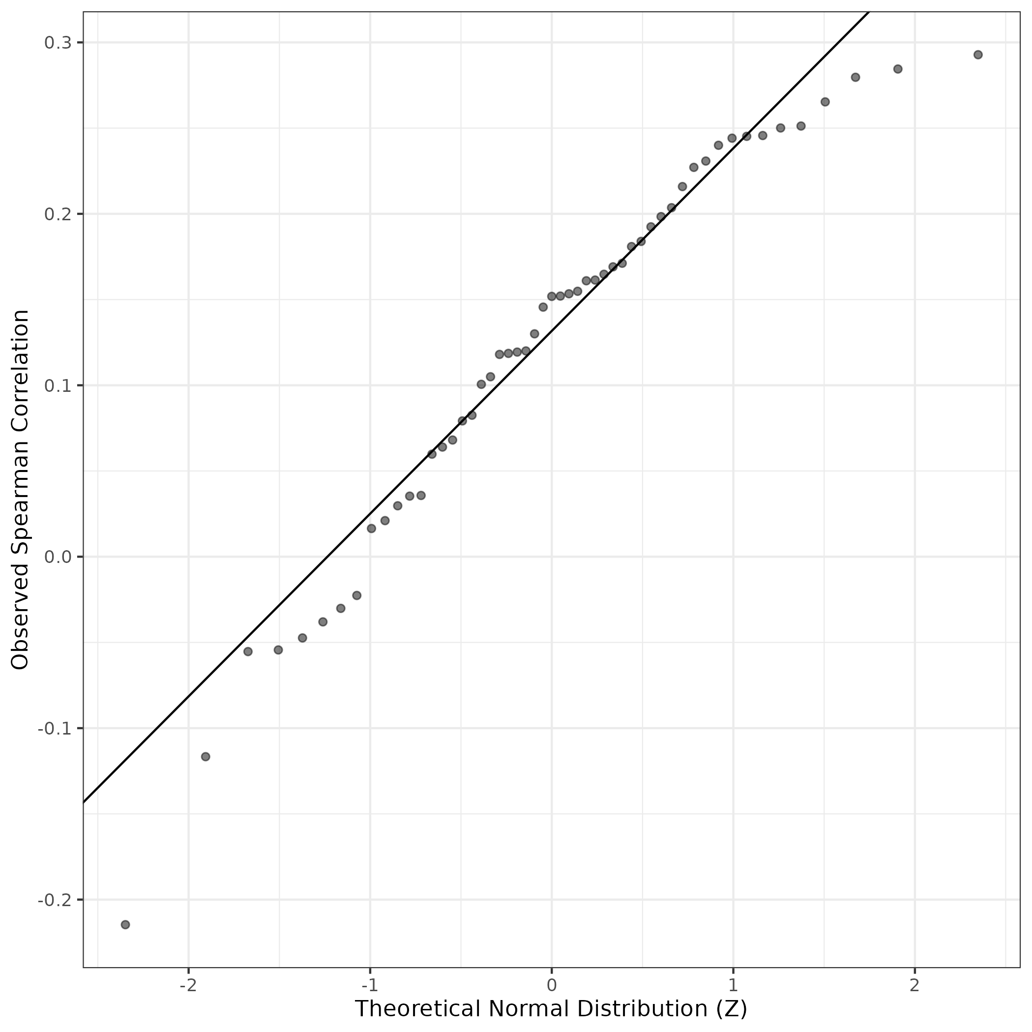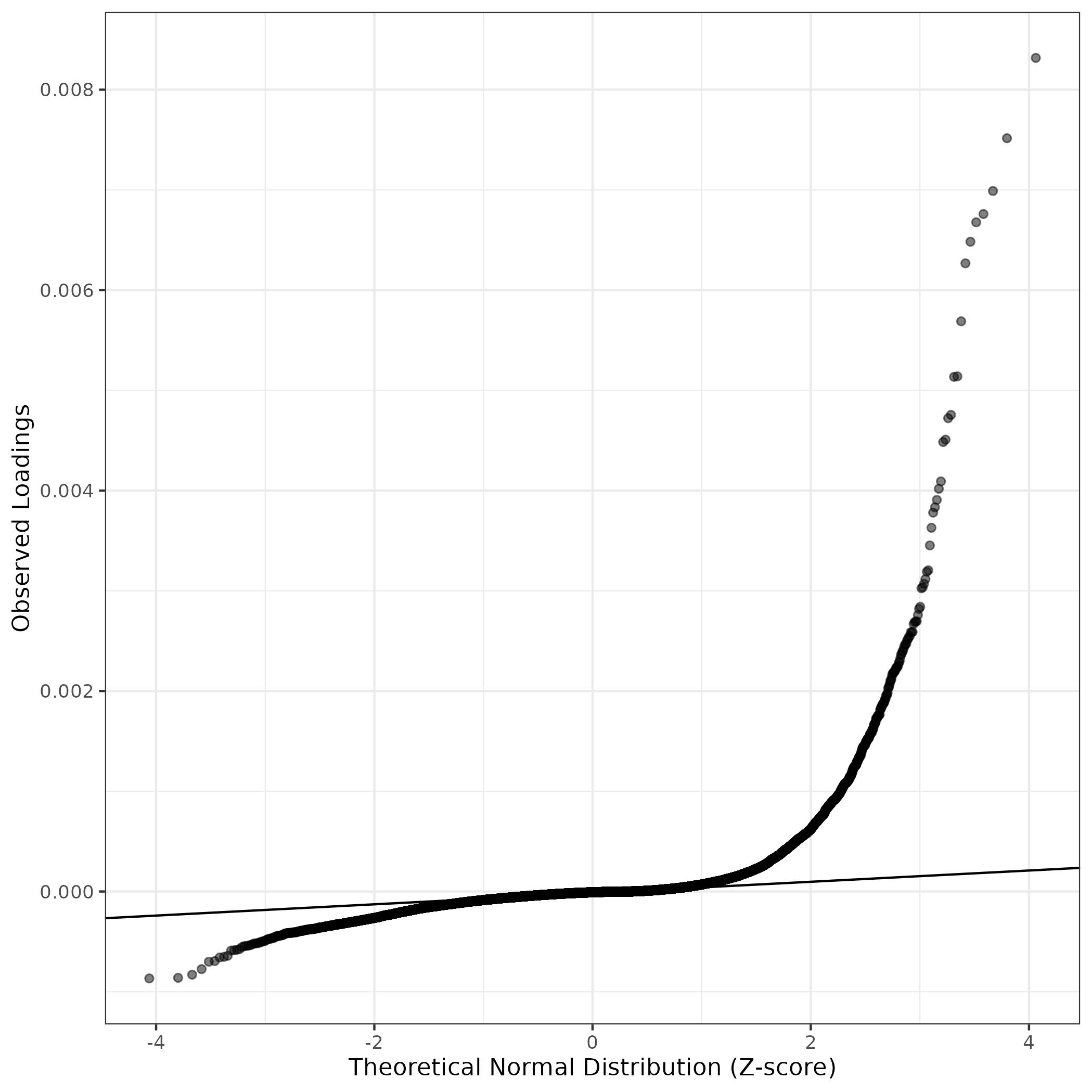 QQ-plot of gene loadings, averaged over both independent splits of the data