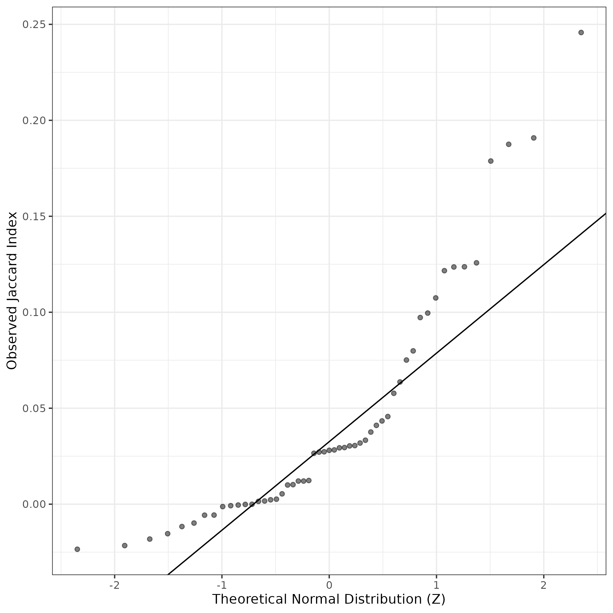A similar QQ-plot as above, but only for instances where the H value is e.g. > 25, i.e. we are confident that the expression program is active above noise. Agreemenet between these binary vectors is tested using the Jaccard Index, with the P-values calculated by an exact test: