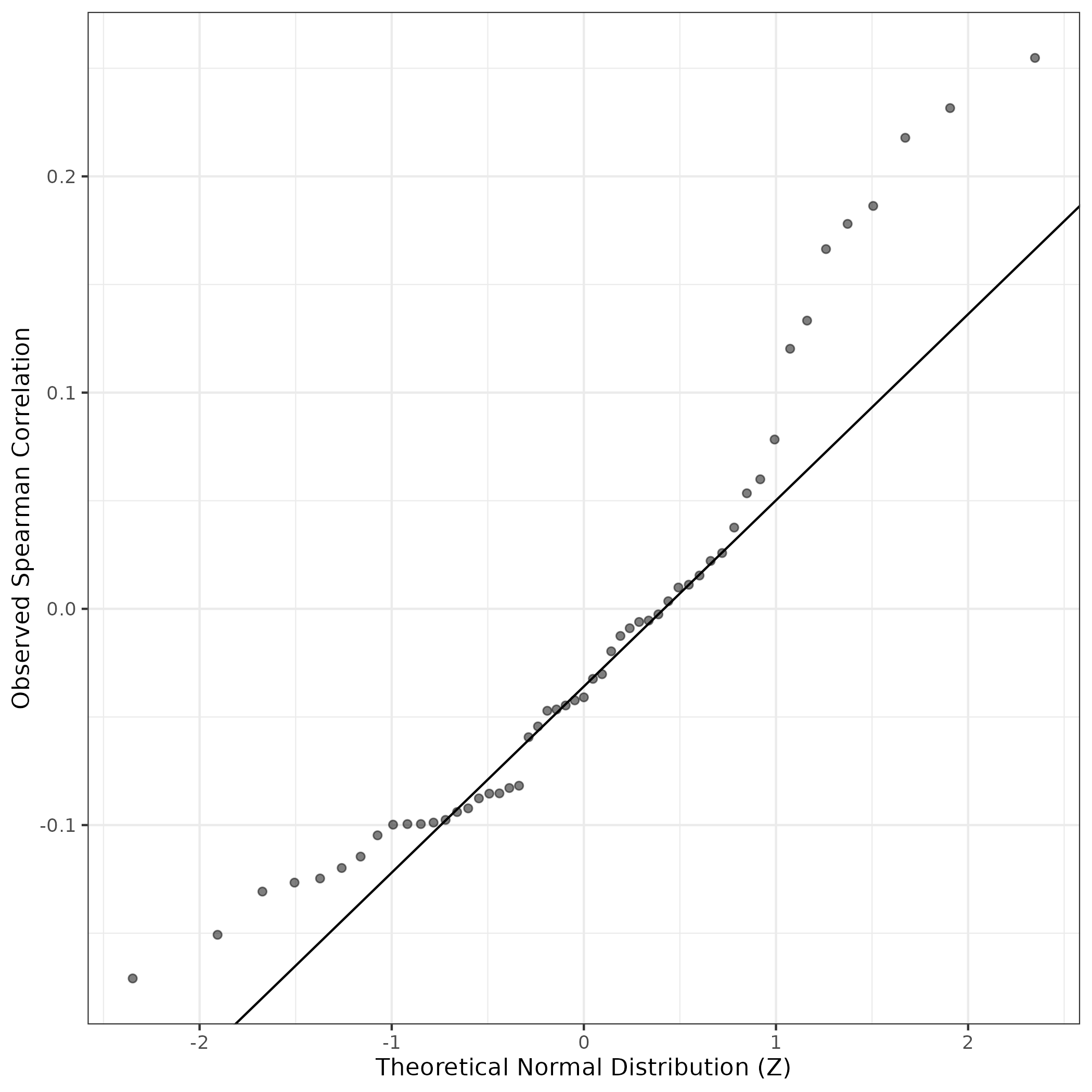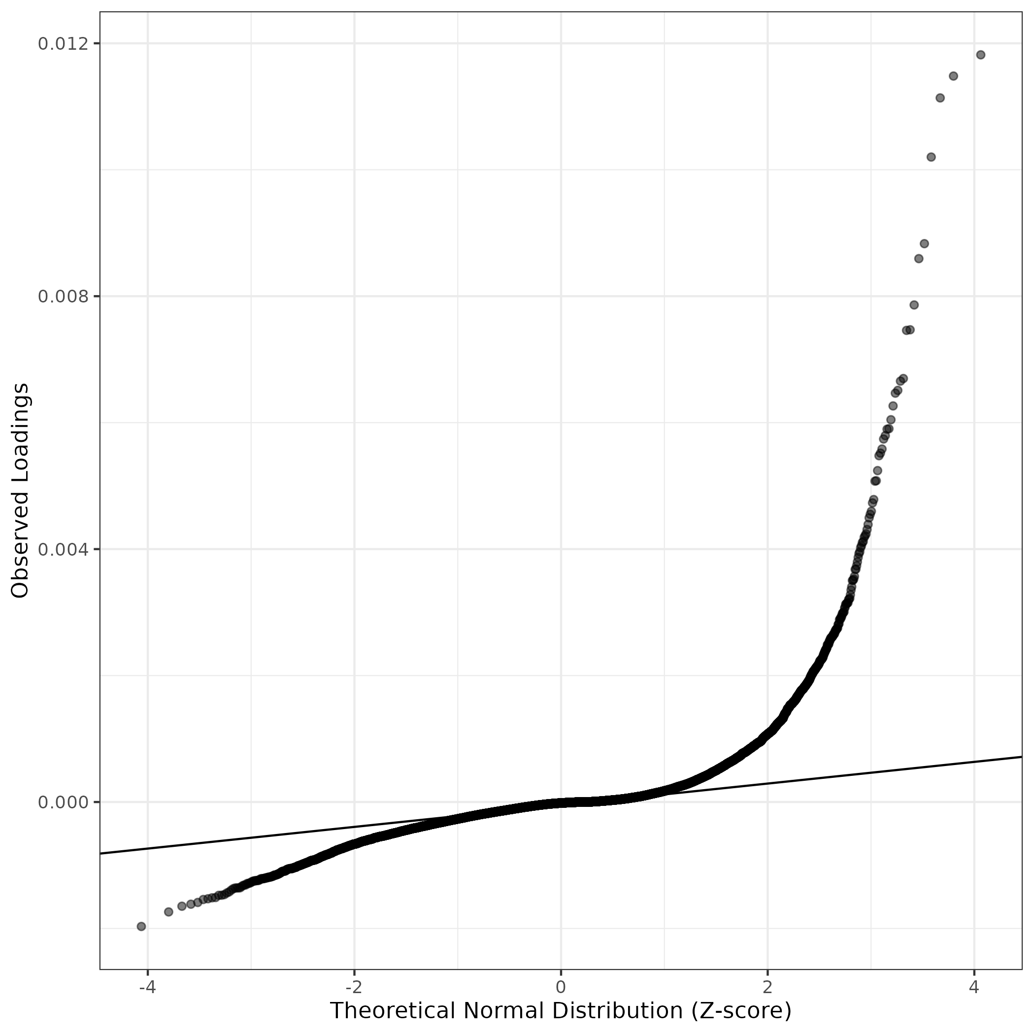 QQ-plot of gene loadings, averaged over both independent splits of the data