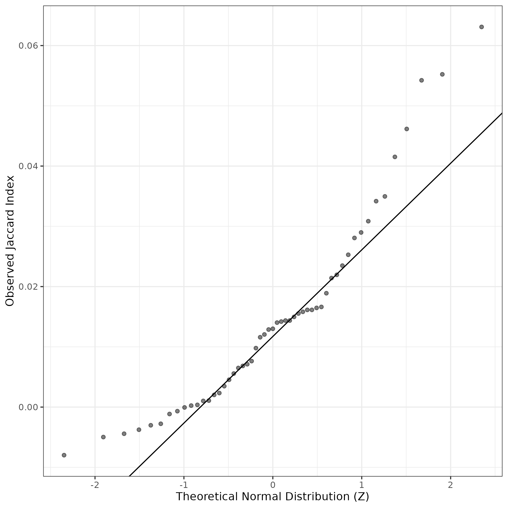 A similar QQ-plot as above, but only for instances where the H value is e.g. > 25, i.e. we are confident that the expression program is active above noise. Agreemenet between these binary vectors is tested using the Jaccard Index, with the P-values calculated by an exact test: