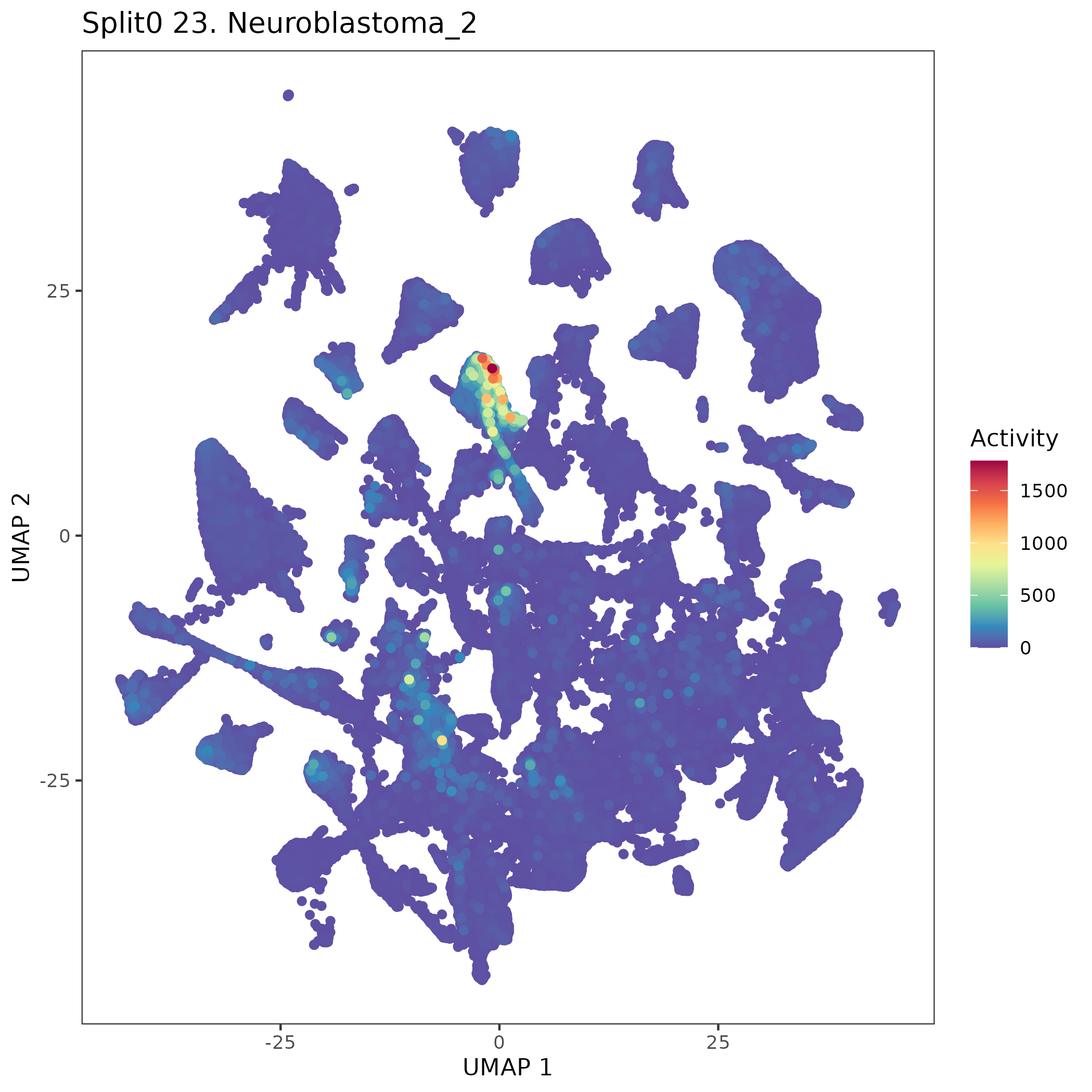 SCPs neuroblastoma unique (Olsen) Similar to above, but for genes unique to neuroblastoma SCP-like cells. Note FN1 is often used as a mesenchymal marker gene.: Wilcoxon ranksum test P-value for gene set overrepresentation: 9.53e-01 Mean rank of genes in gene set: 14047.29 Rank on gene expression program of genes in gene set: