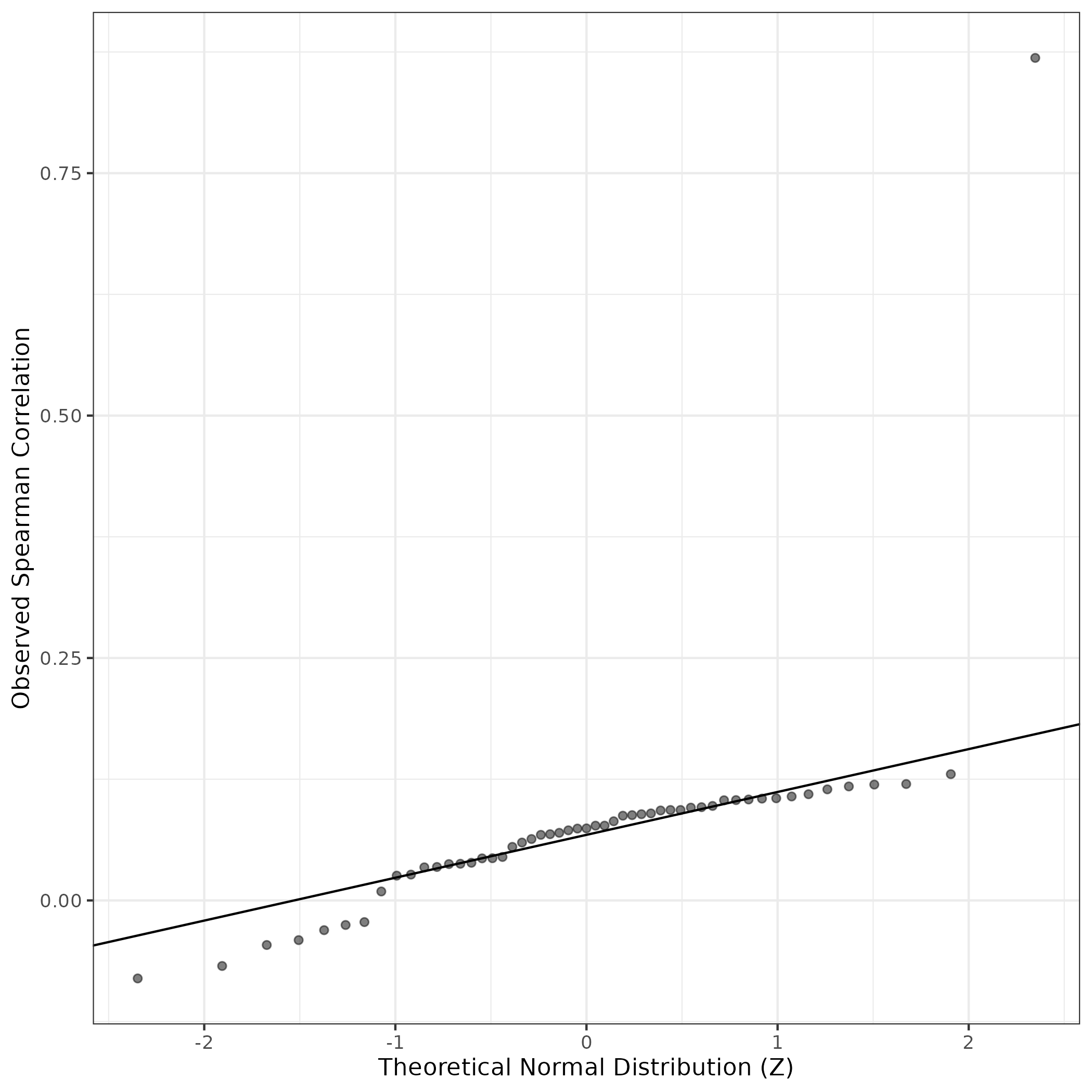 QQ-plot of gene loadings, averaged over both independent splits of the data