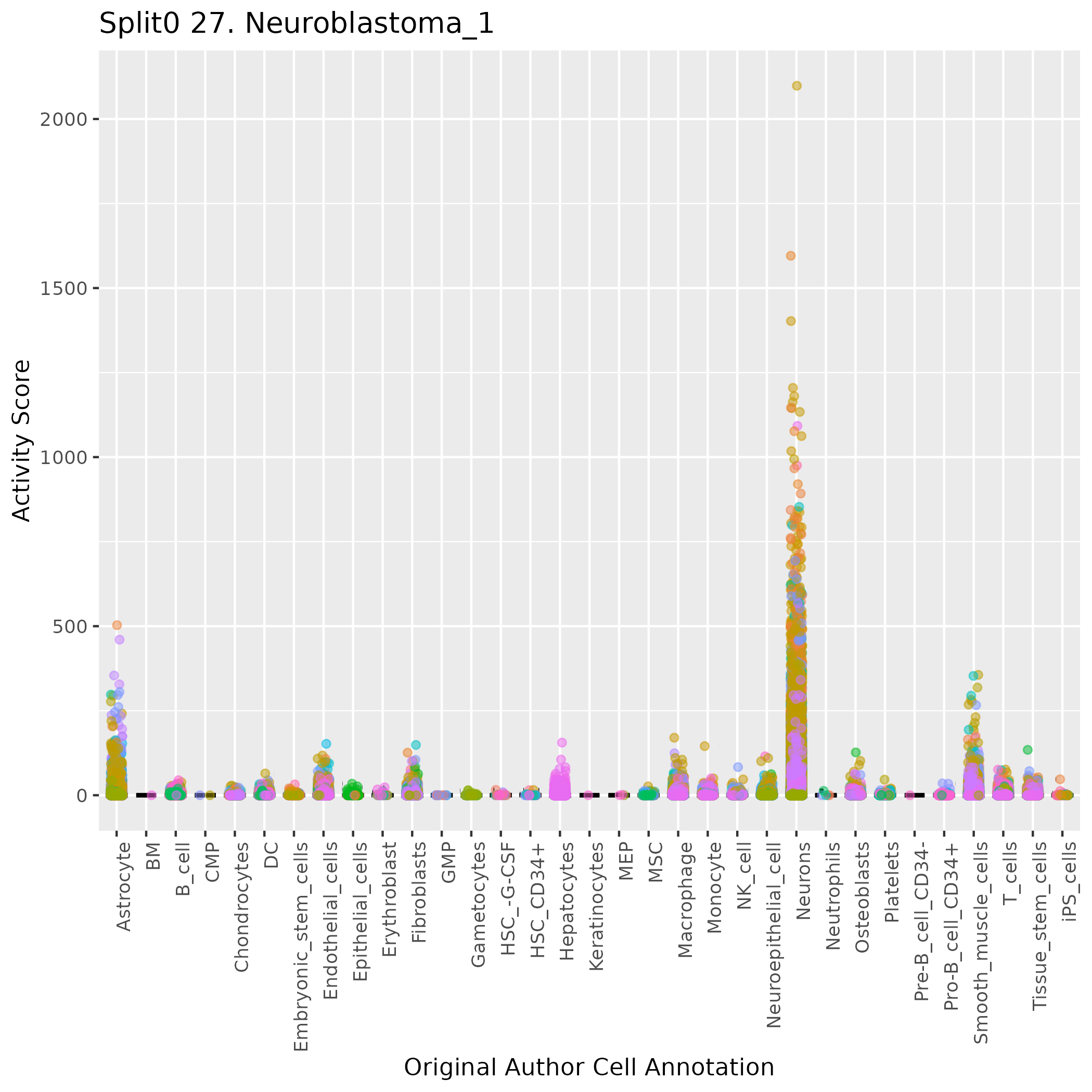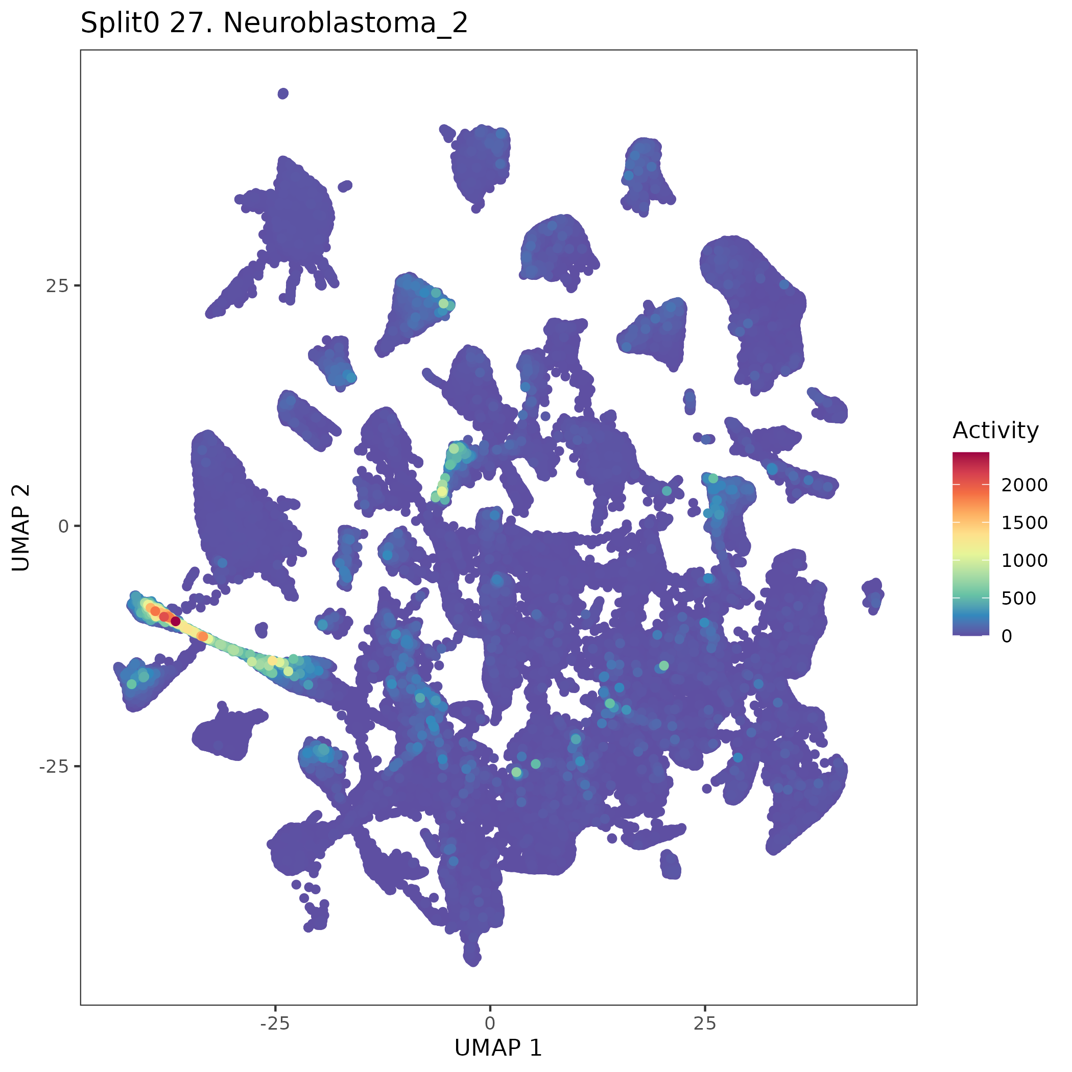 SCPs neuroblastoma unique (Olsen) Similar to above, but for genes unique to neuroblastoma SCP-like cells. Note FN1 is often used as a mesenchymal marker gene.: Wilcoxon ranksum test P-value for gene set overrepresentation: 9.19e-01 Mean rank of genes in gene set: 13437.14 Rank on gene expression program of genes in gene set: