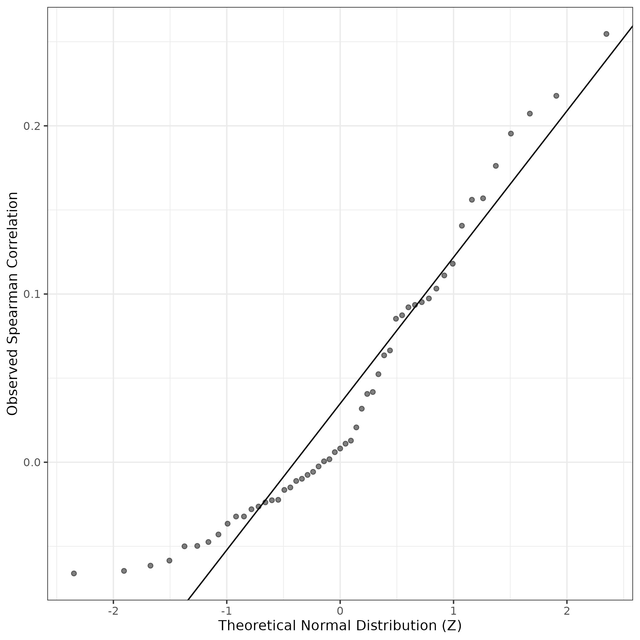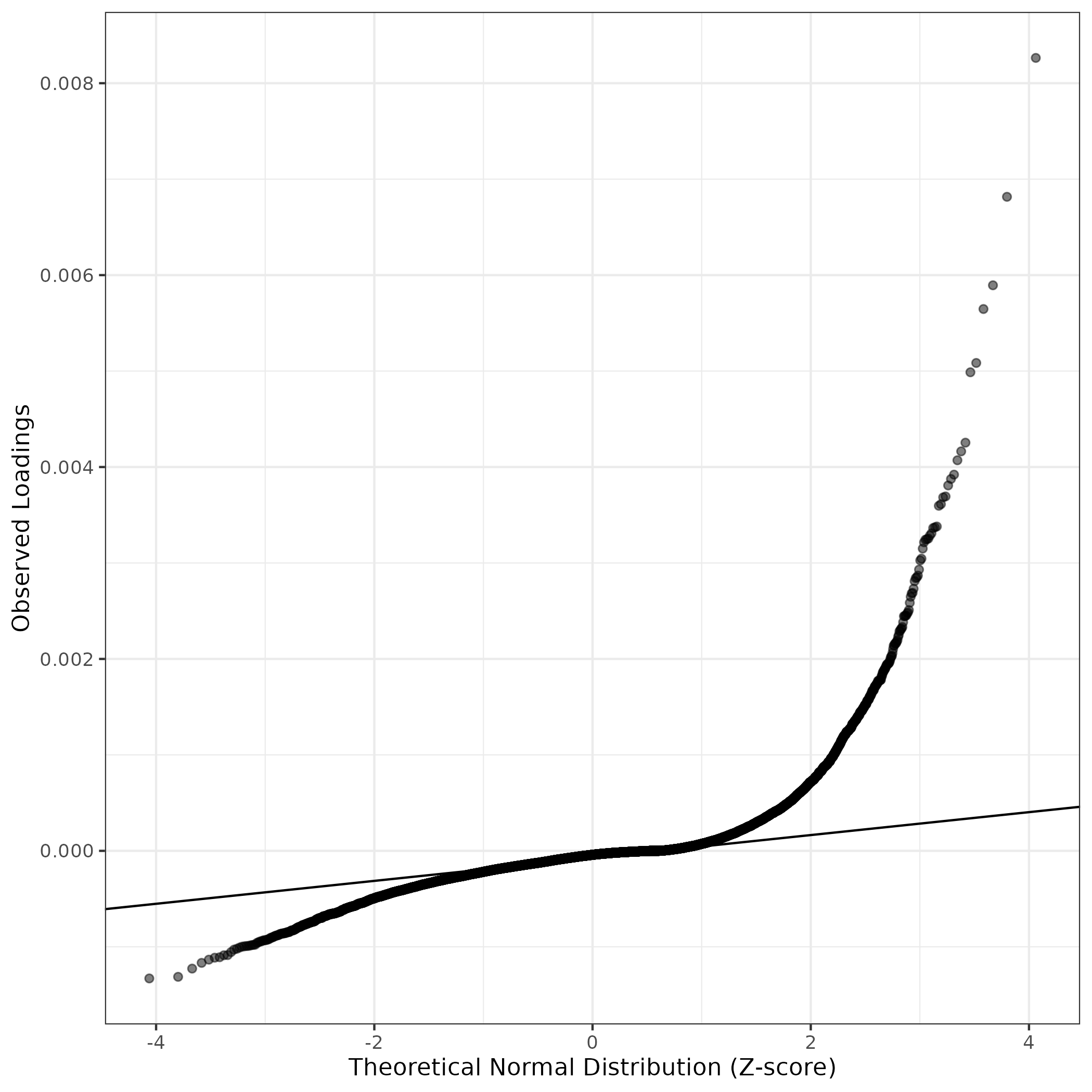 QQ-plot of gene loadings, averaged over both independent splits of the data