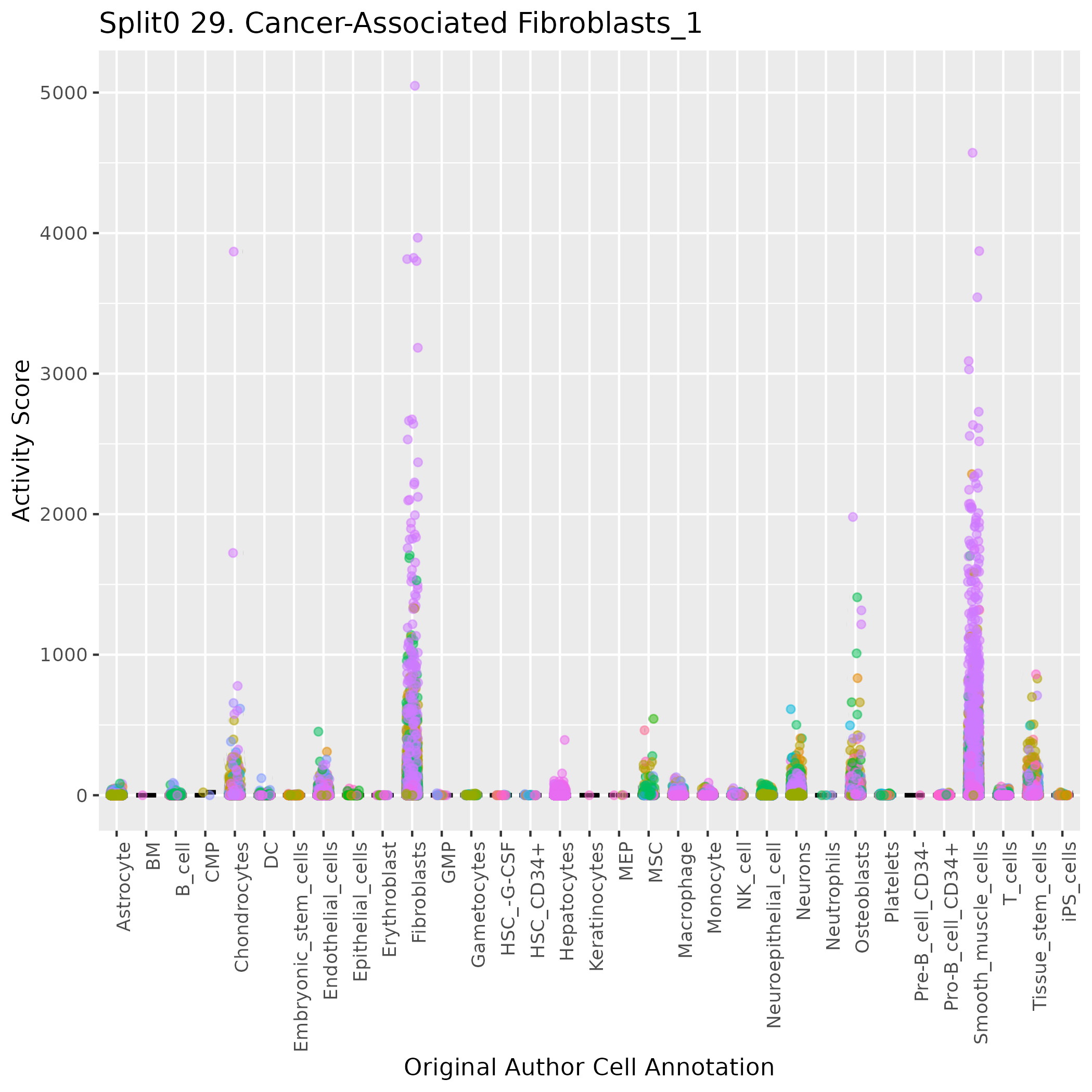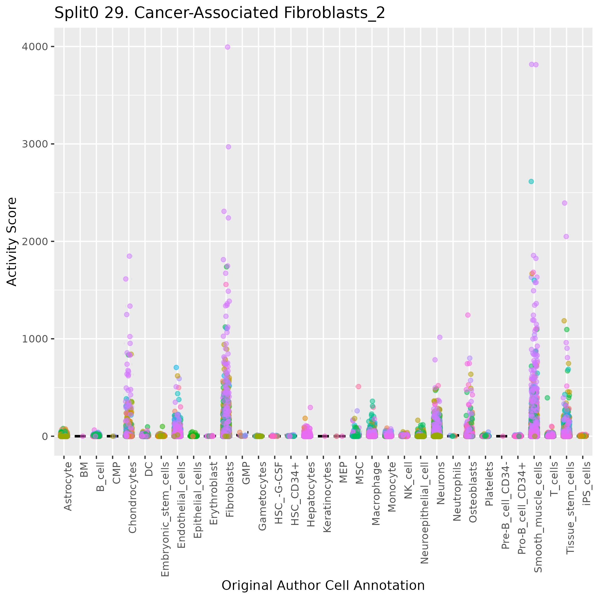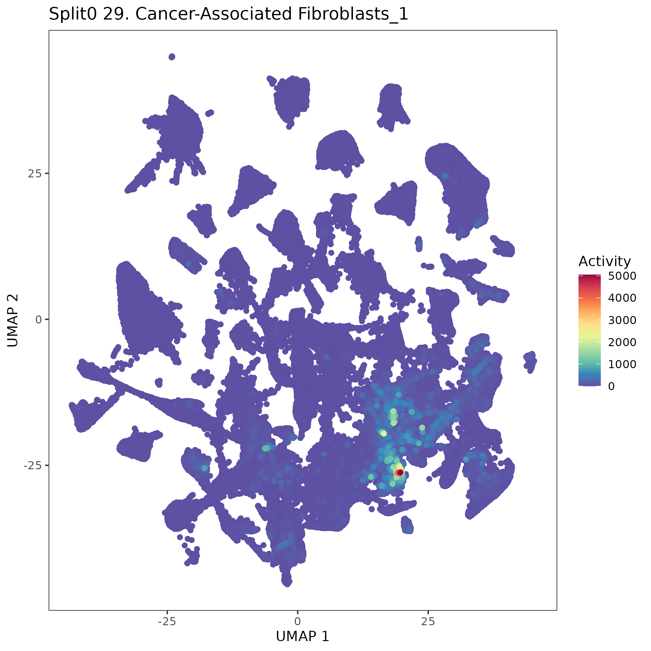 UMAP plots showing activity of gene expression program identified in GEP 29. Cancer-Associated Fibroblasts: