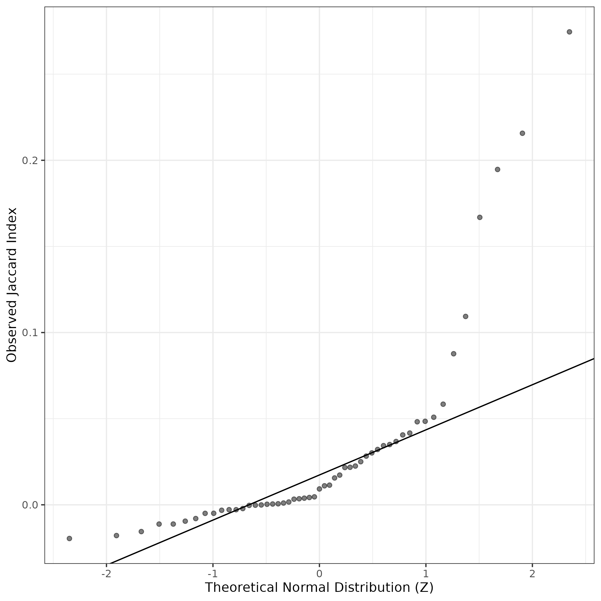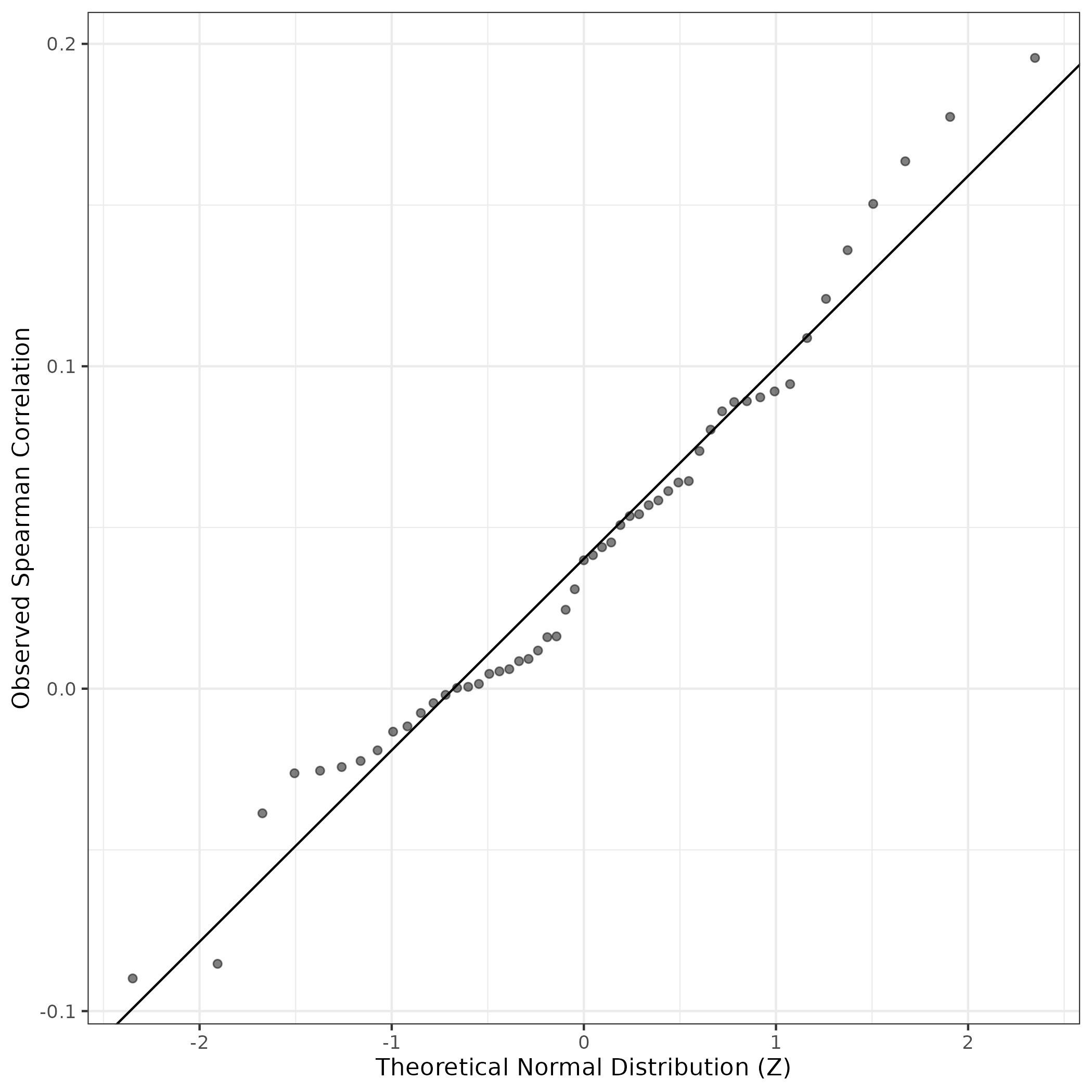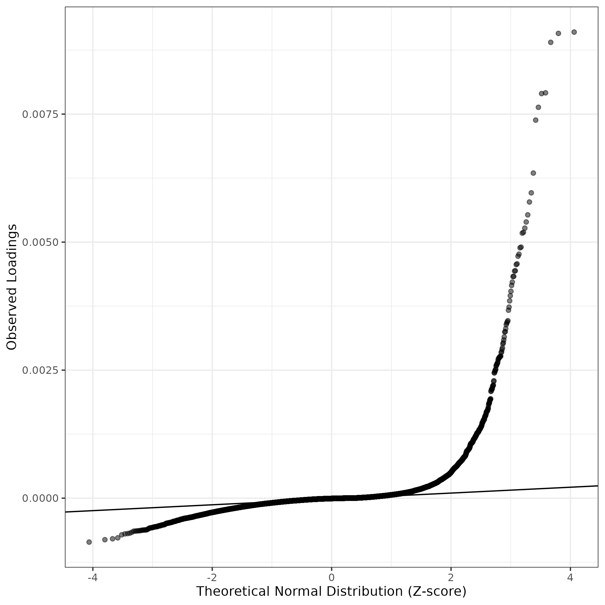 QQ-plot of gene loadings, averaged over both independent splits of the data