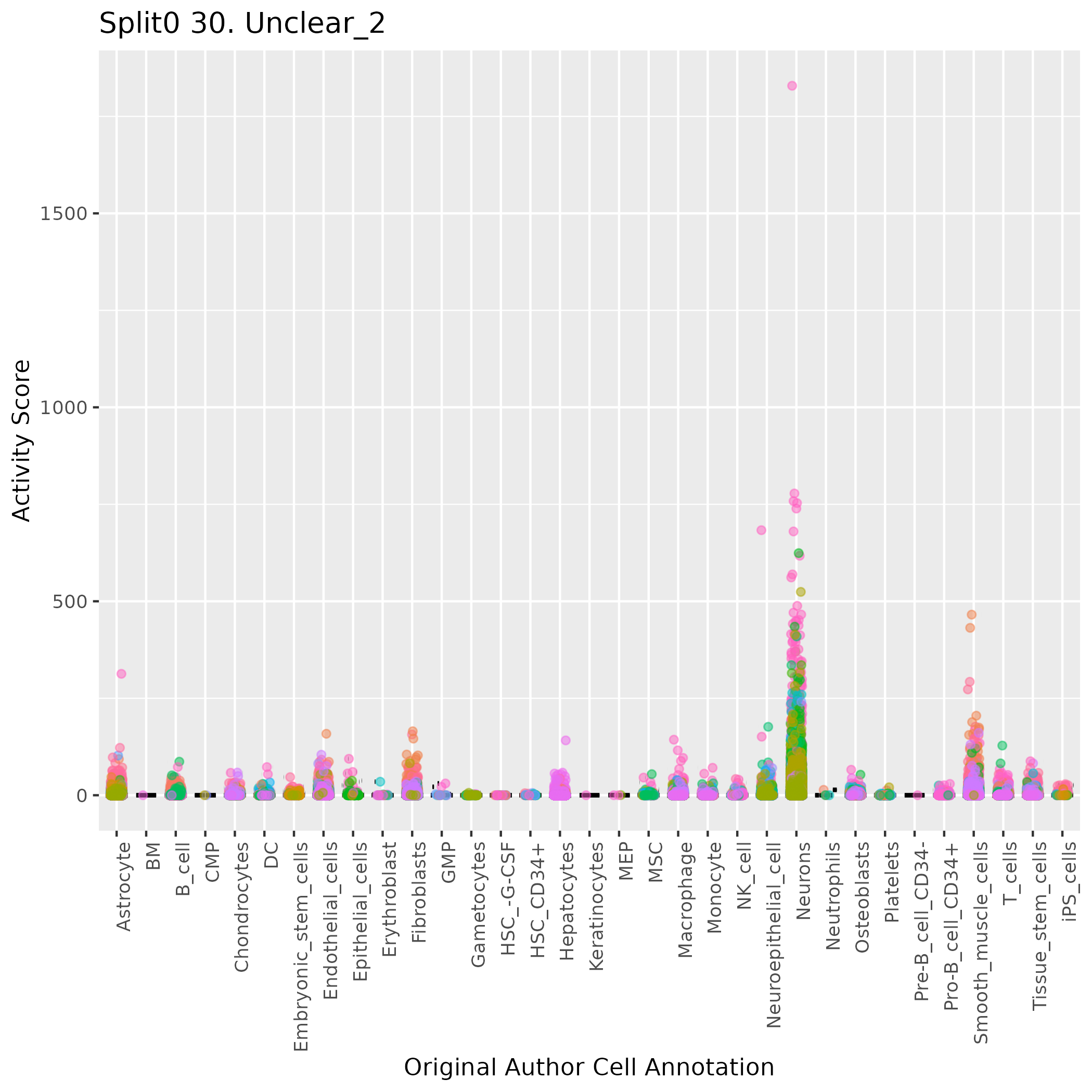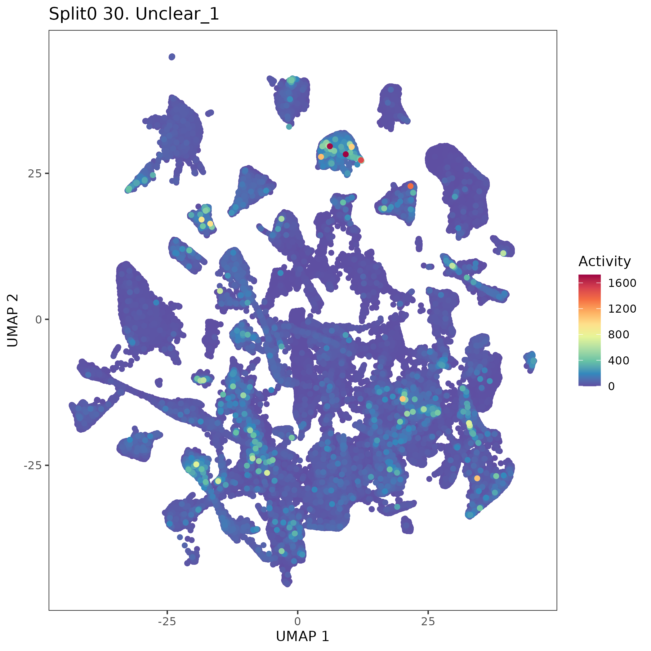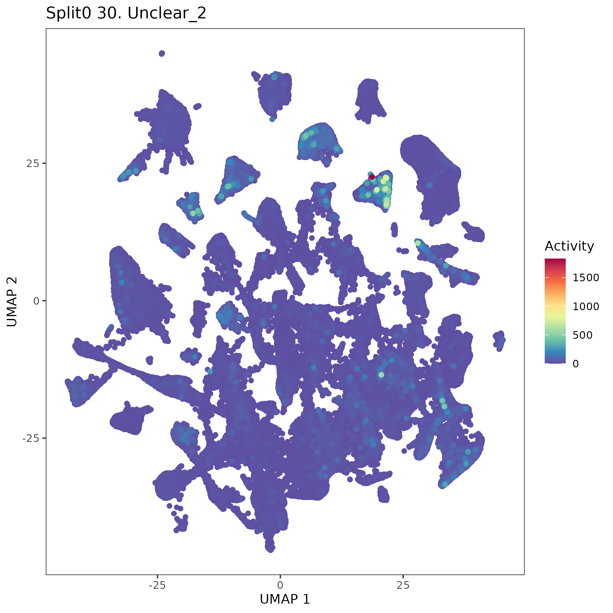 UMAP plots showing activity of gene expression program identified in GEP 30. Unclear: