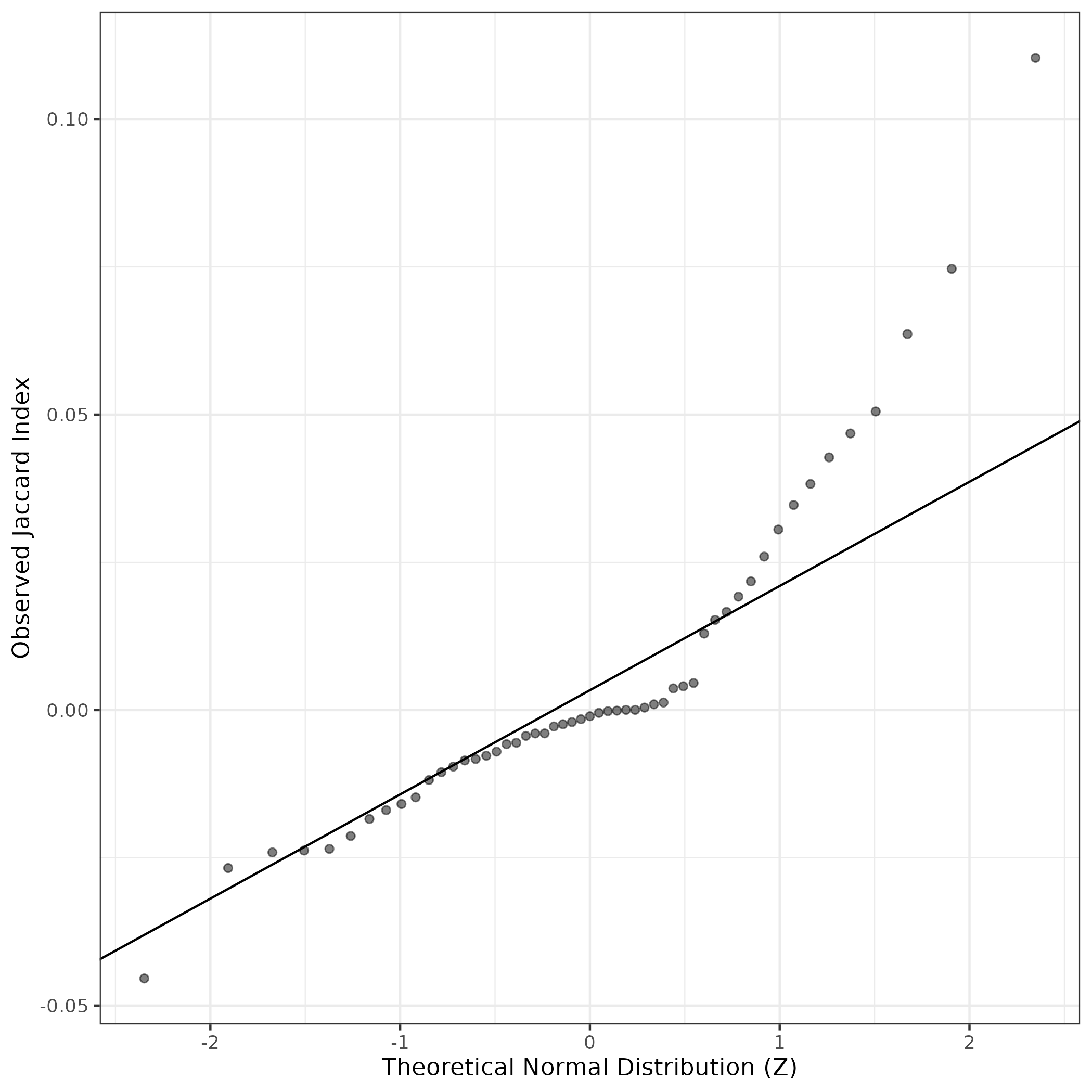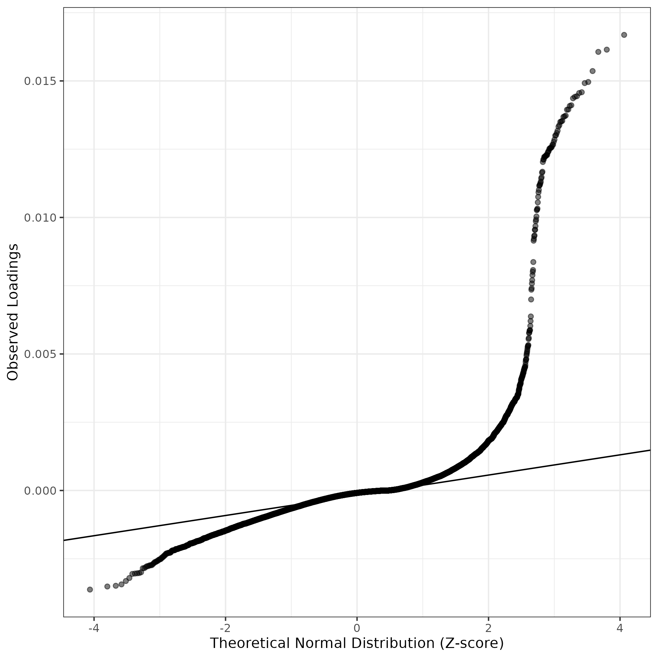 QQ-plot of gene loadings, averaged over both independent splits of the data