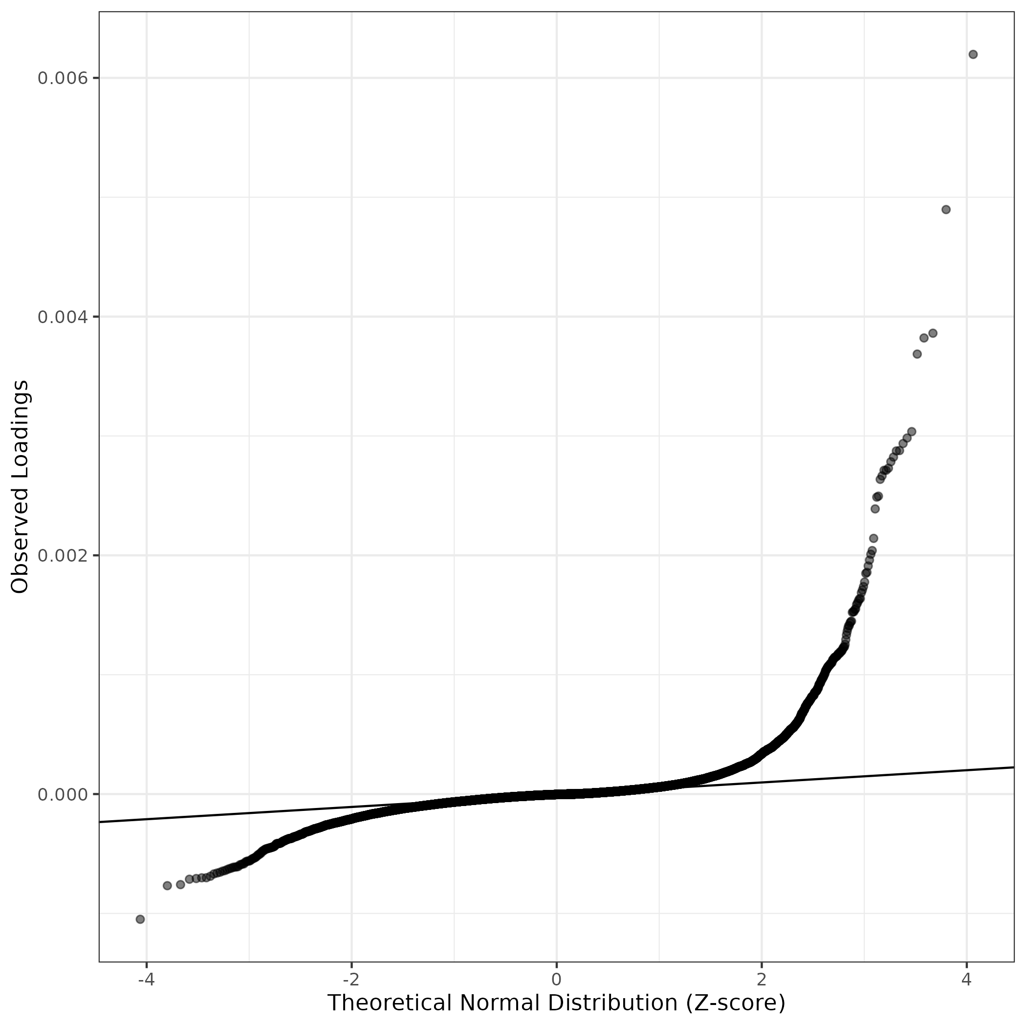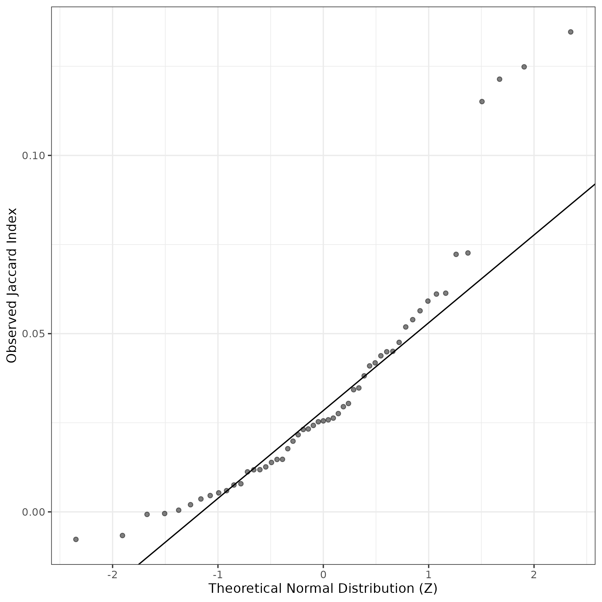 A similar QQ-plot as above, but only for instances where the H value is e.g. > 25, i.e. we are confident that the expression program is active above noise. Agreemenet between these binary vectors is tested using the Jaccard Index, with the P-values calculated by an exact test: