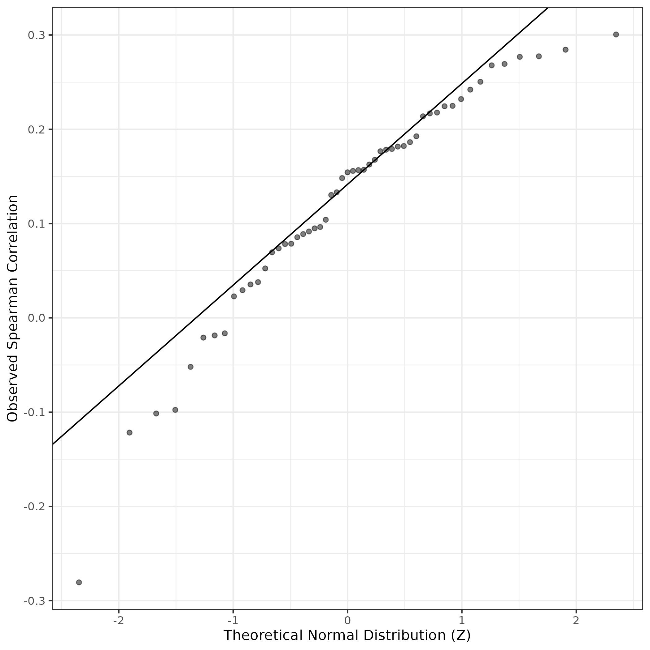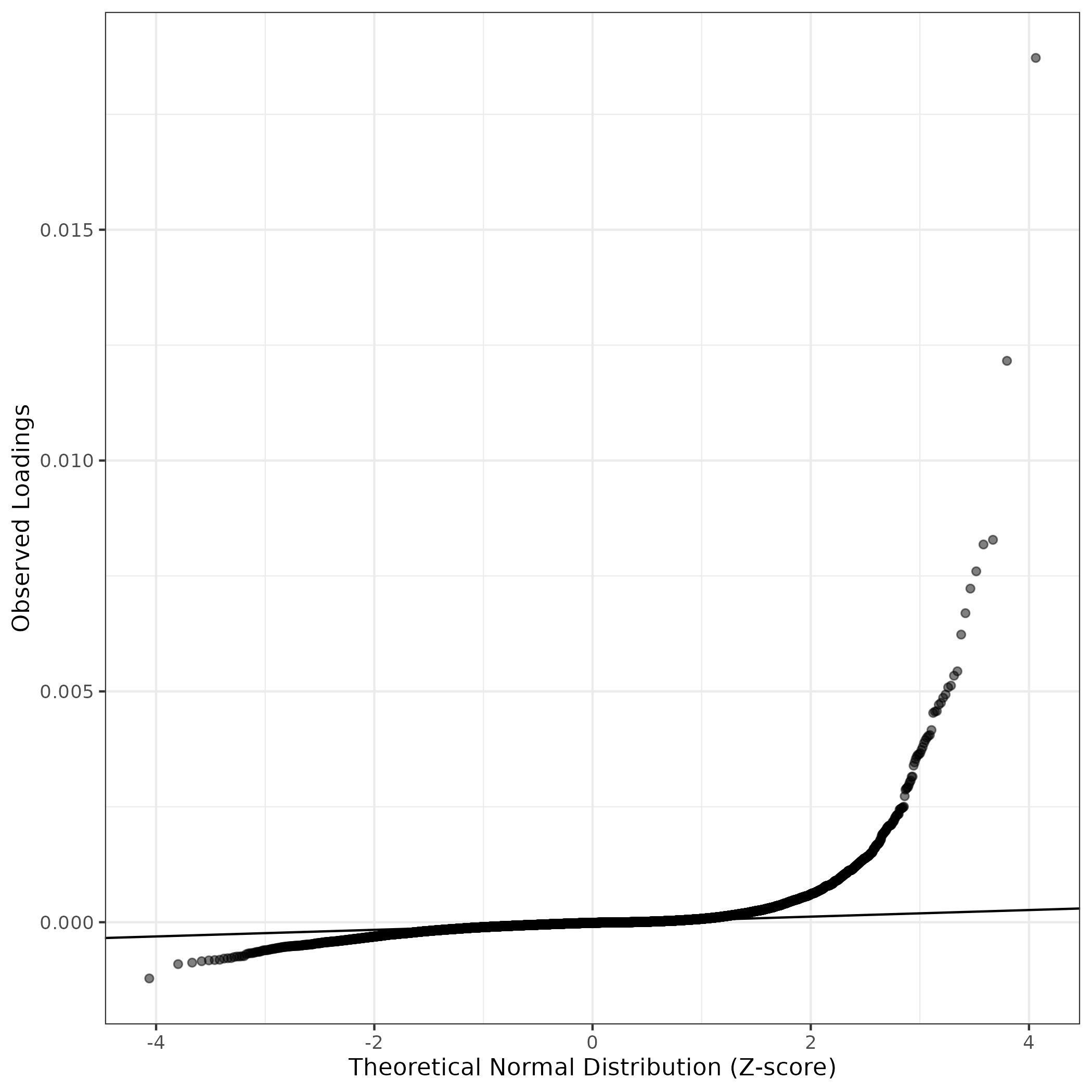 QQ-plot of gene loadings, averaged over both independent splits of the data