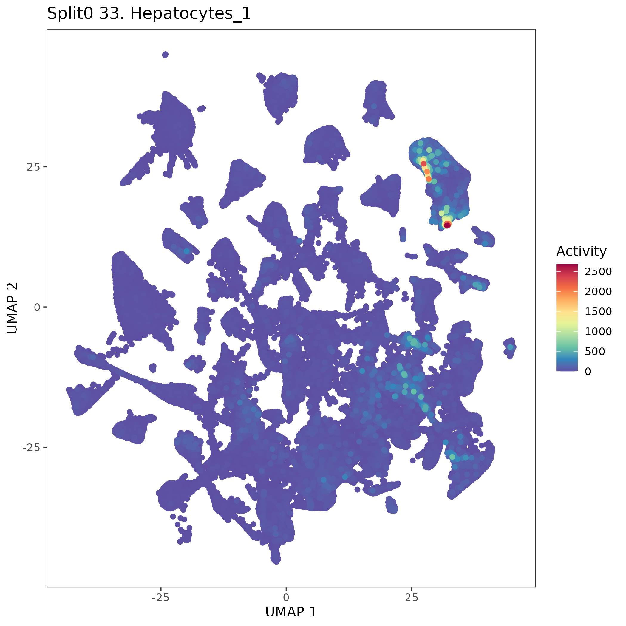 Hepatocytes (Jansky) Mentioned in the main text (Jansky et al, Nature Genetics (2021)), page 1, that ALB+ Hepatocytes were identified in their fetal adrenal glands, this is also highlighted in the UMAP plot on their Fig 1B. Additional genes also shown in their Extended data Figure 2D. The main text also speculated that these hepatocytes were probably derived from neighboring tissue, and hence artifactual, but there is no evidence presented for this.: Wilcoxon ranksum test P-value for gene set overrepresentation: 4.90e-02 Mean rank of genes in gene set: 4615.67 Rank on gene expression program of genes in gene set: