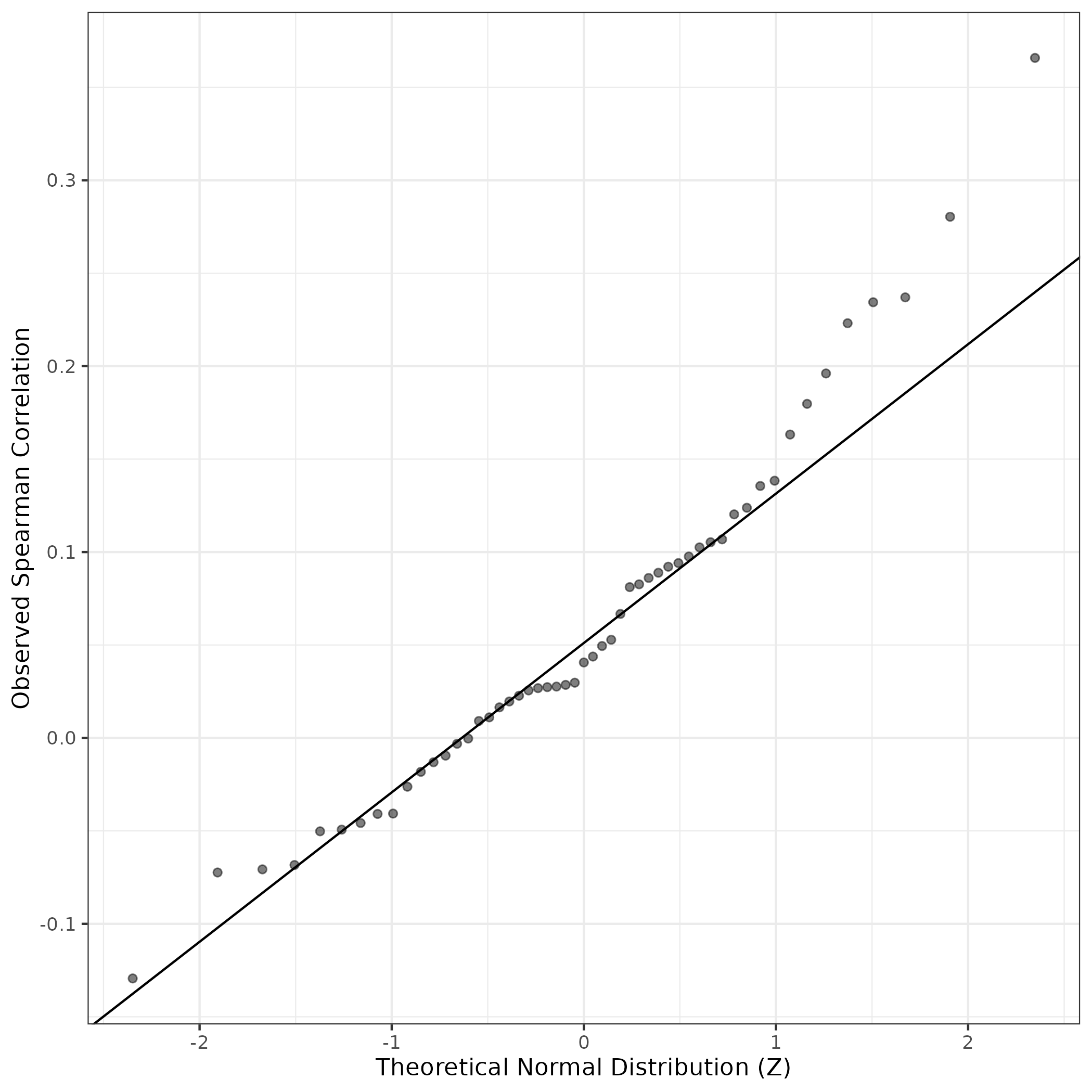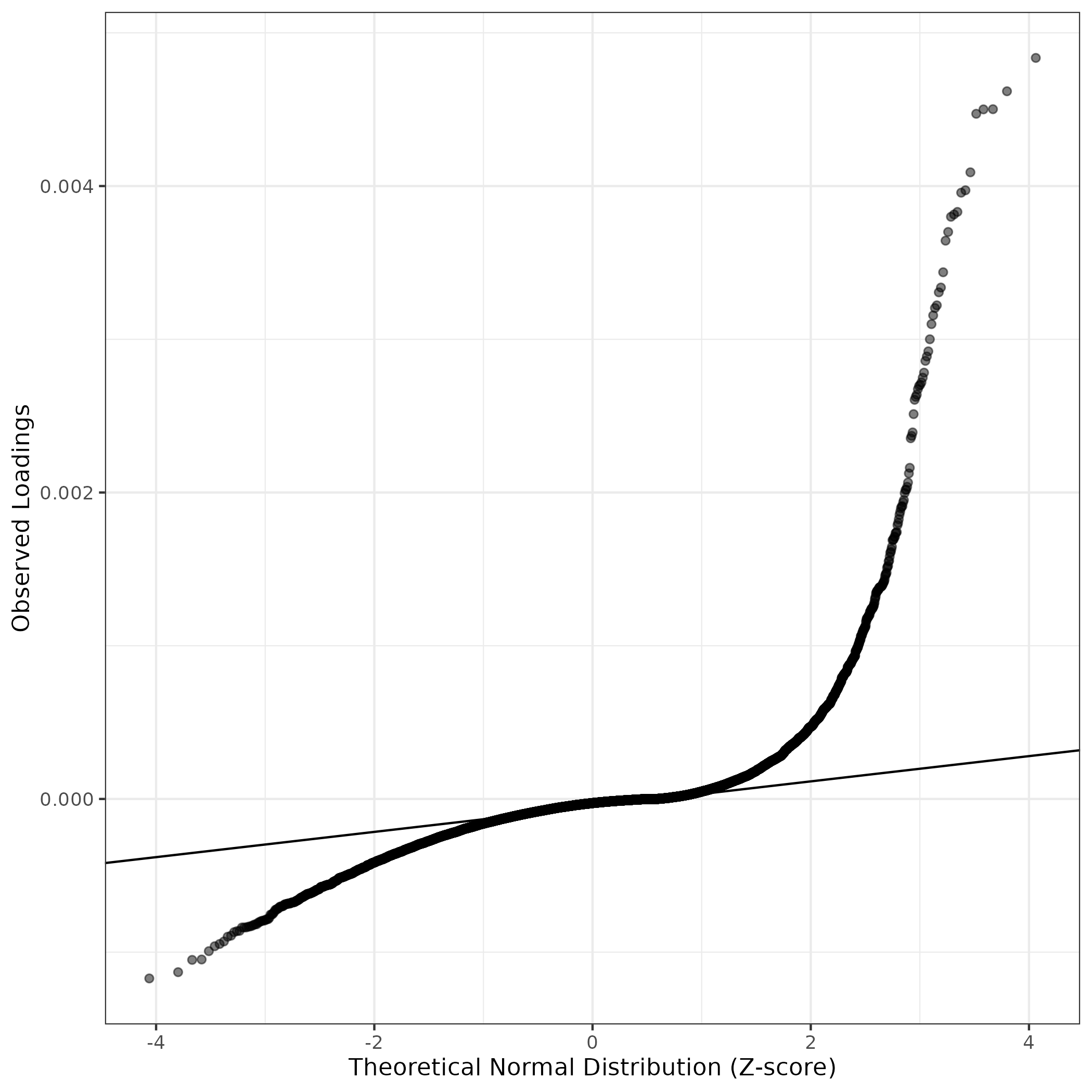 QQ-plot of gene loadings, averaged over both independent splits of the data