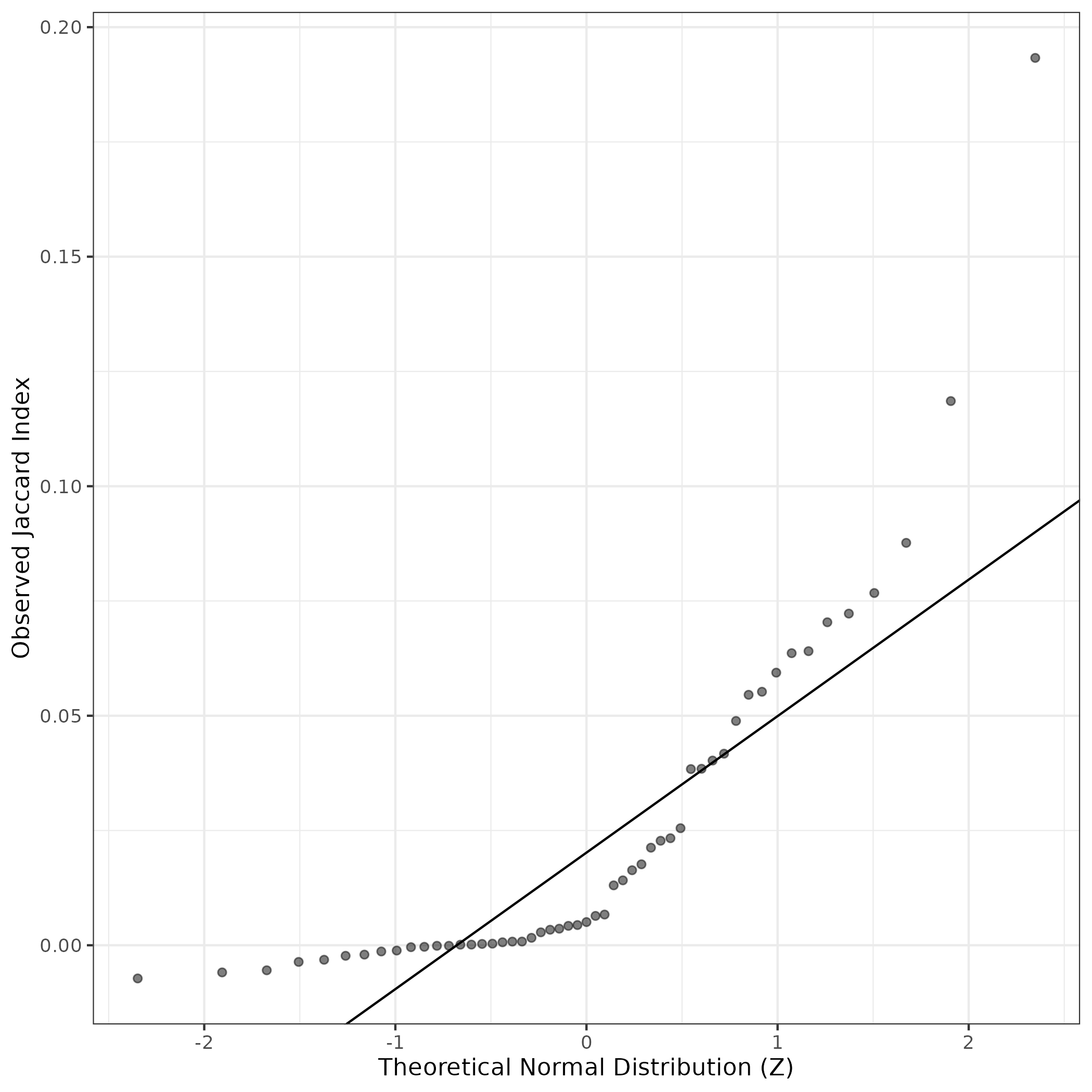 A similar QQ-plot as above, but only for instances where the H value is e.g. > 25, i.e. we are confident that the expression program is active above noise. Agreemenet between these binary vectors is tested using the Jaccard Index, with the P-values calculated by an exact test: