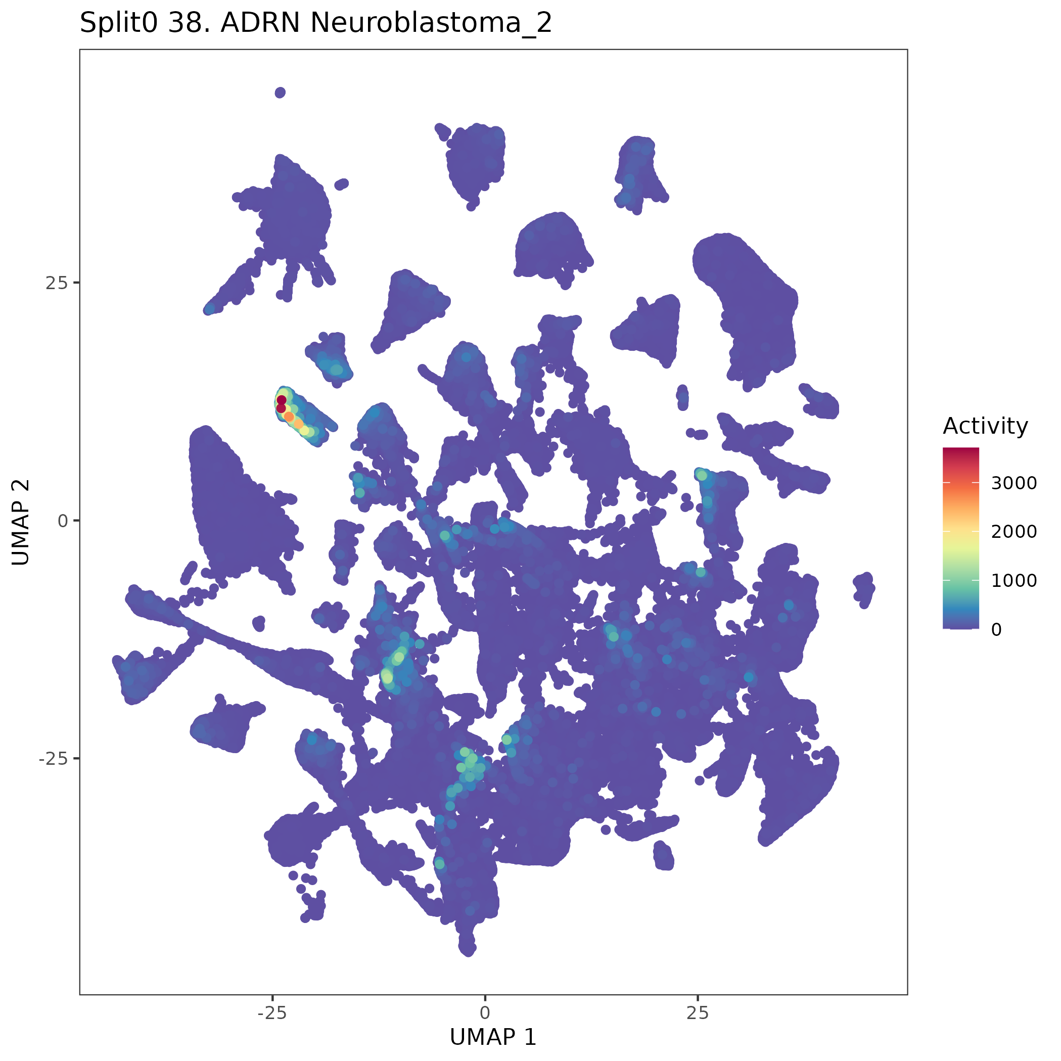 SCPs neuroblastoma unique (Olsen) Similar to above, but for genes unique to neuroblastoma SCP-like cells. Note FN1 is often used as a mesenchymal marker gene.: Wilcoxon ranksum test P-value for gene set overrepresentation: 5.59e-01 Mean rank of genes in gene set: 10625.71 Rank on gene expression program of genes in gene set: