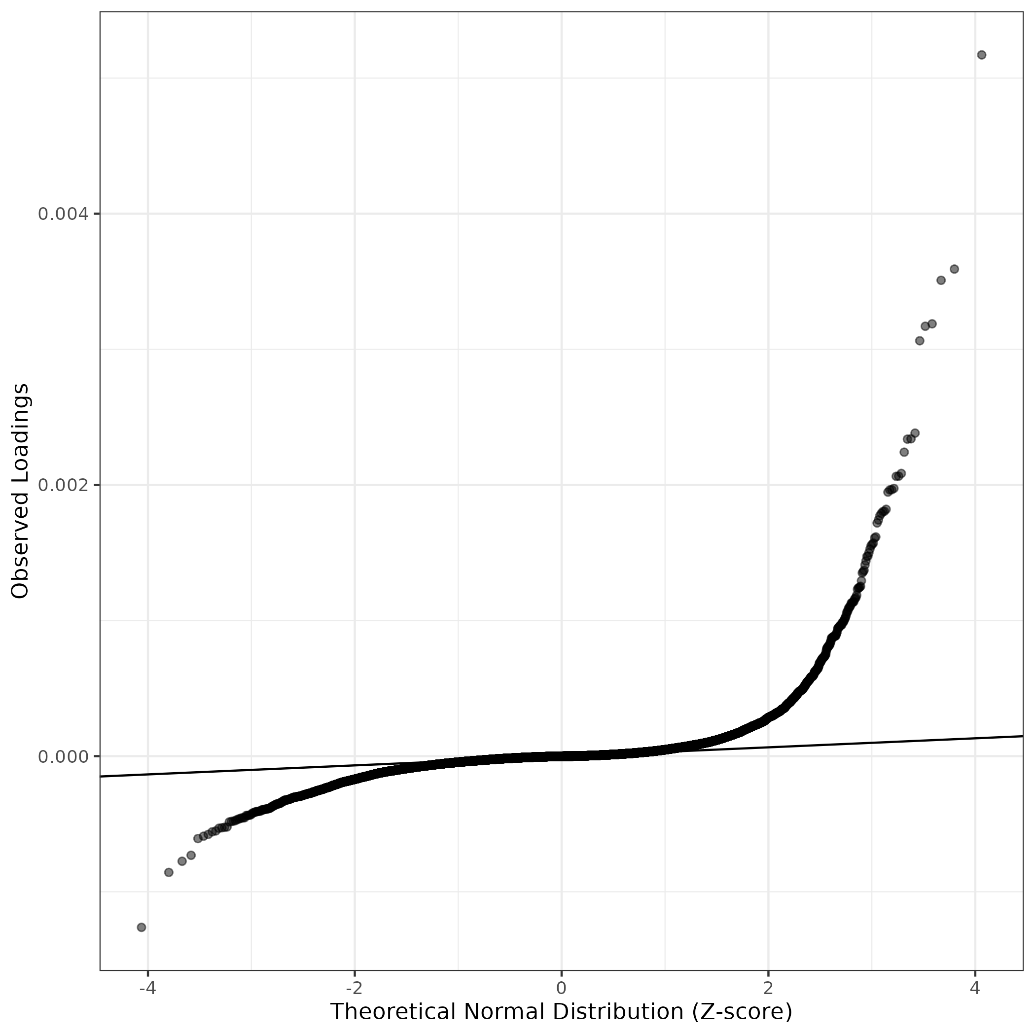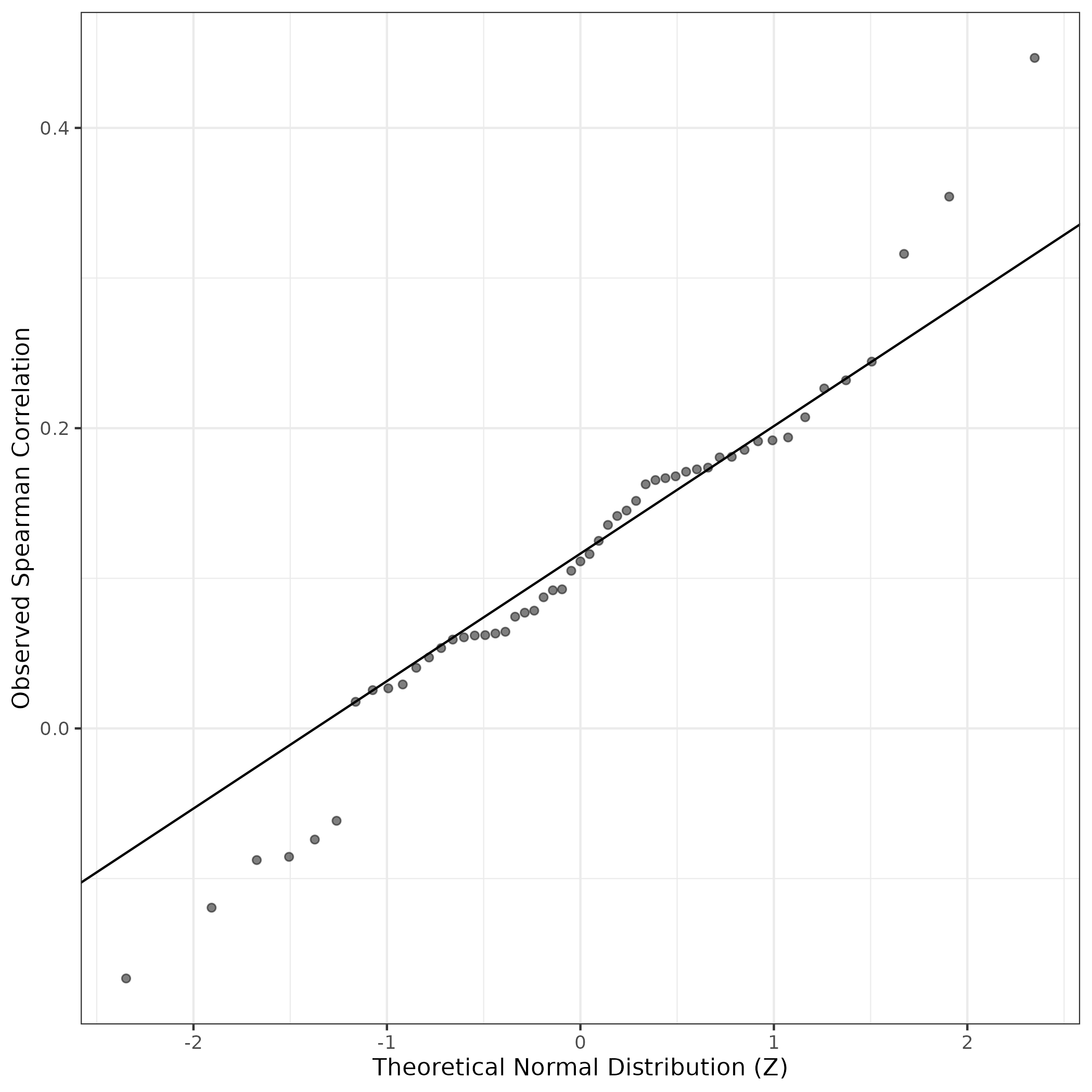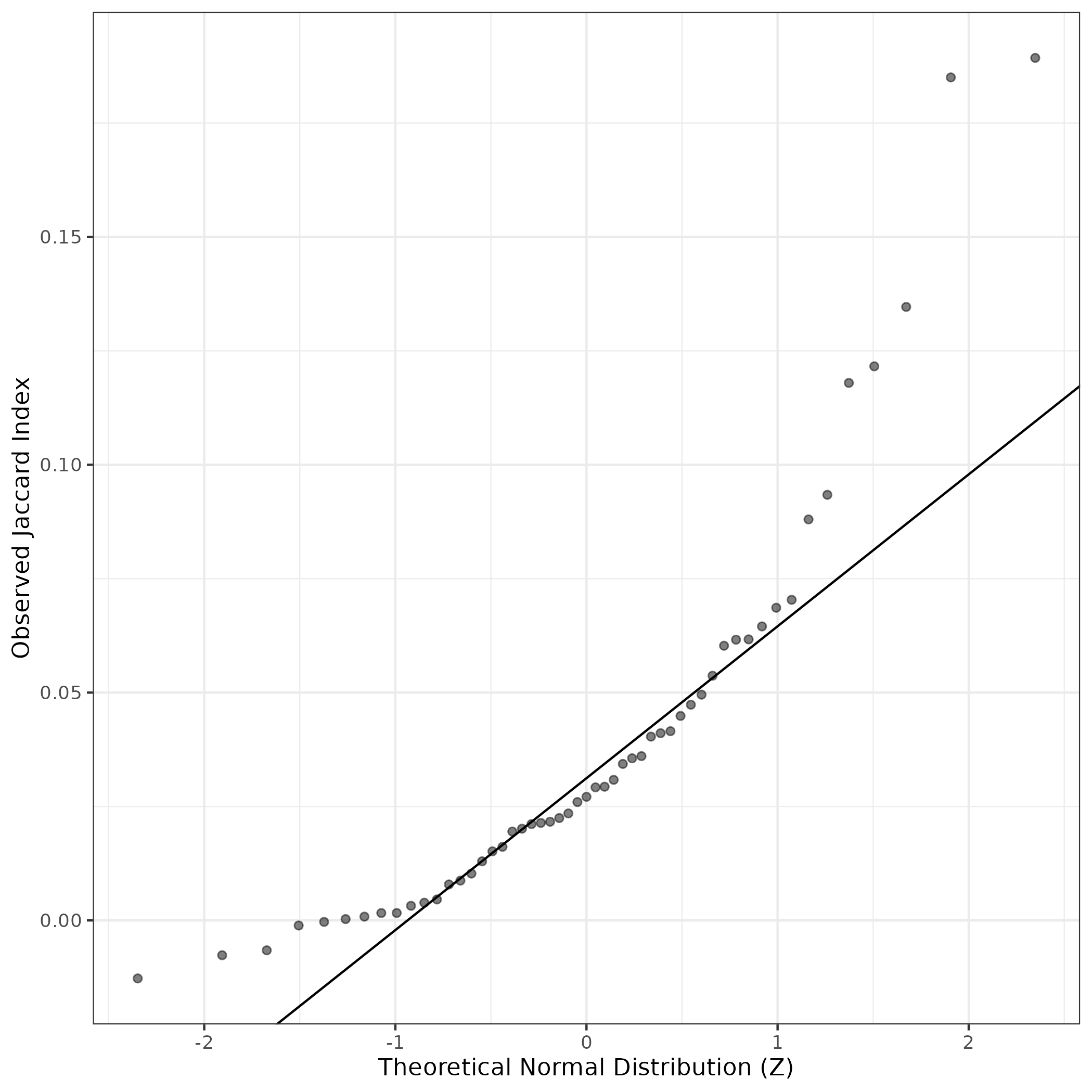 A similar QQ-plot as above, but only for instances where the H value is e.g. > 25, i.e. we are confident that the expression program is active above noise. Agreemenet between these binary vectors is tested using the Jaccard Index, with the P-values calculated by an exact test: