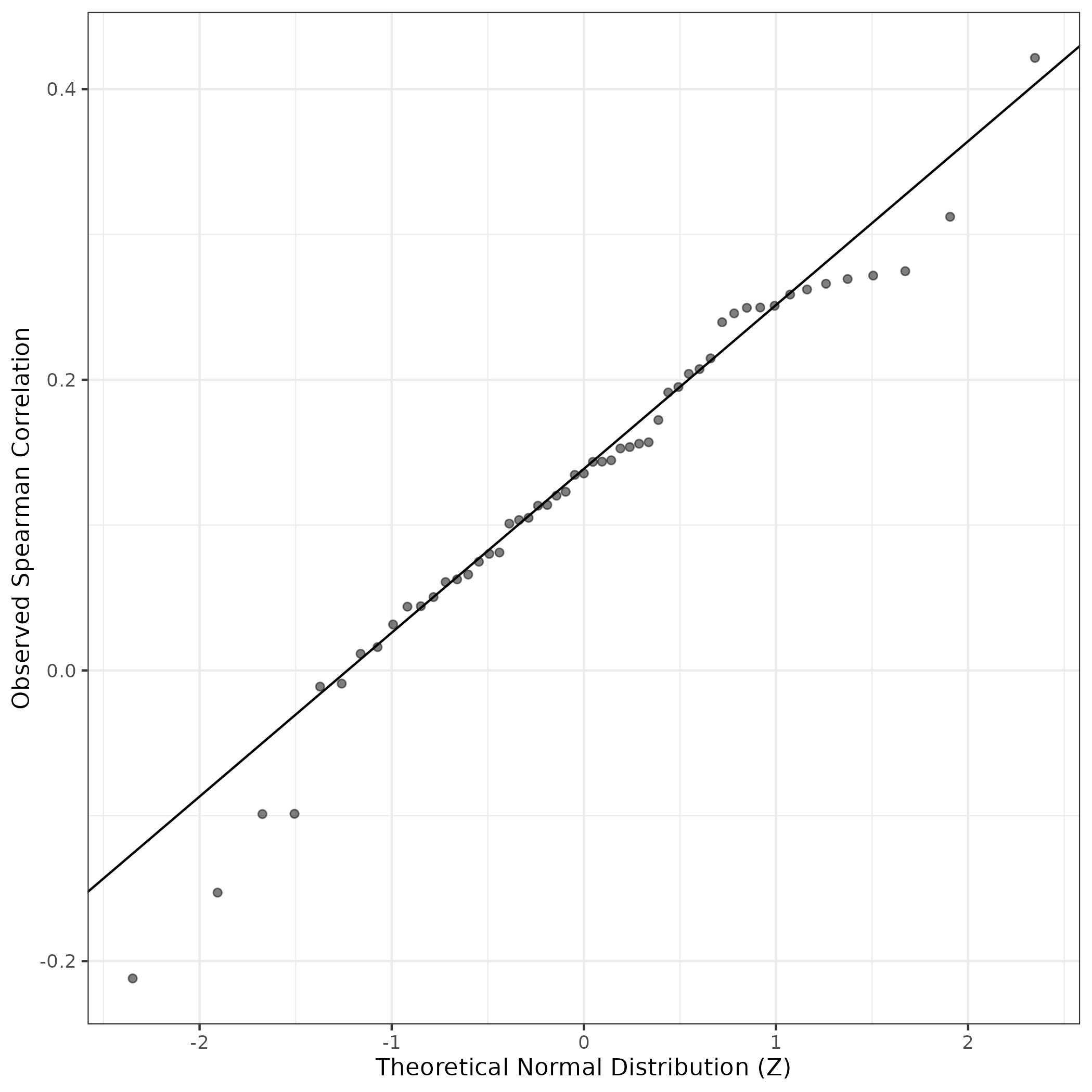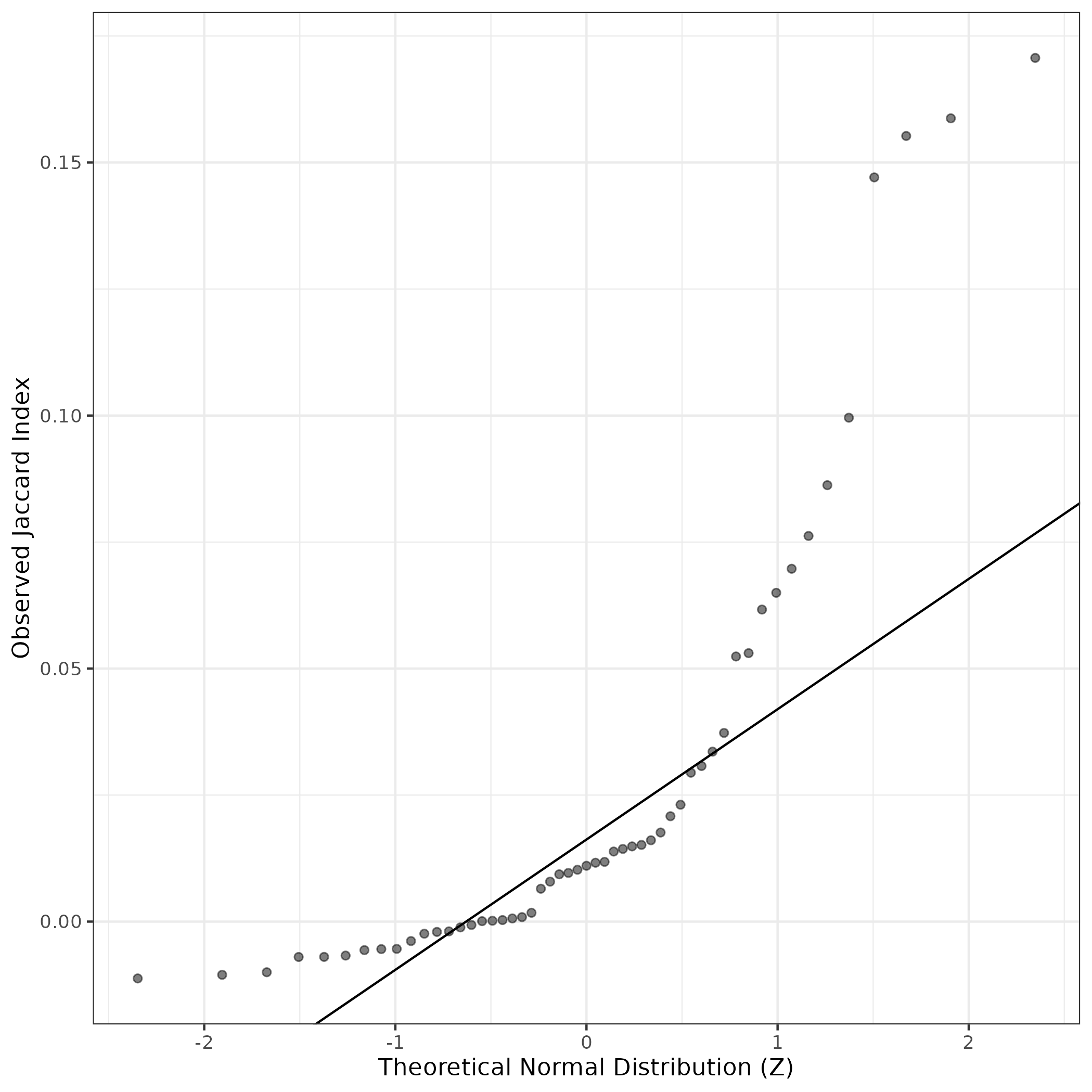 A similar QQ-plot as above, but only for instances where the H value is e.g. > 25, i.e. we are confident that the expression program is active above noise. Agreemenet between these binary vectors is tested using the Jaccard Index, with the P-values calculated by an exact test: