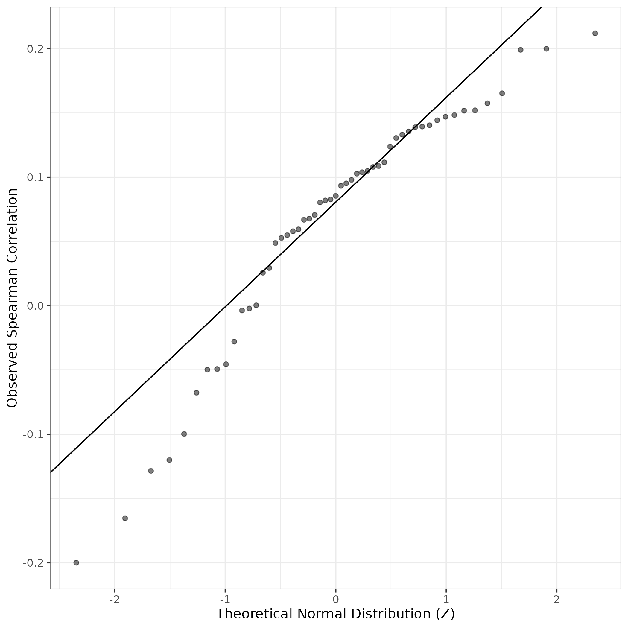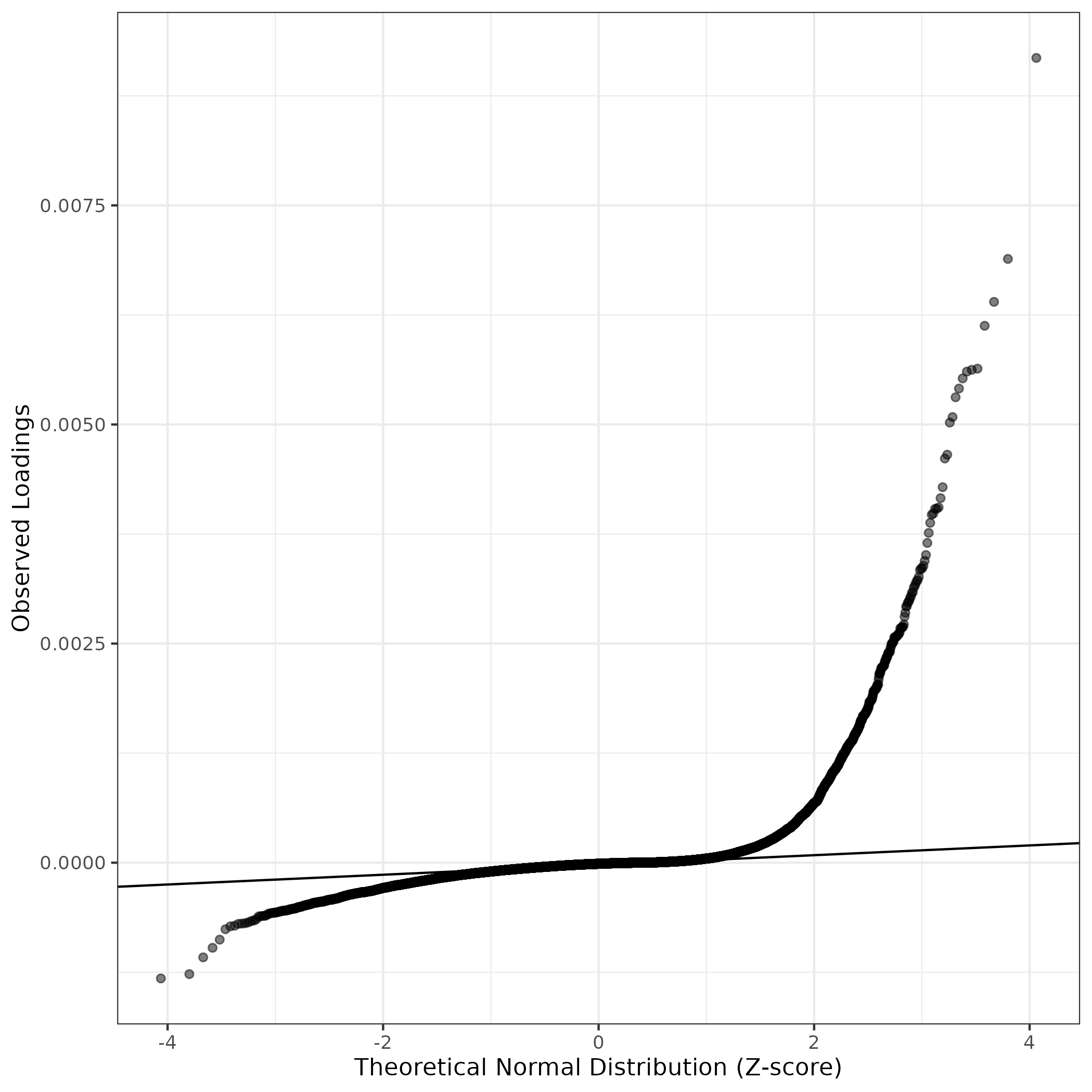 QQ-plot of gene loadings, averaged over both independent splits of the data
