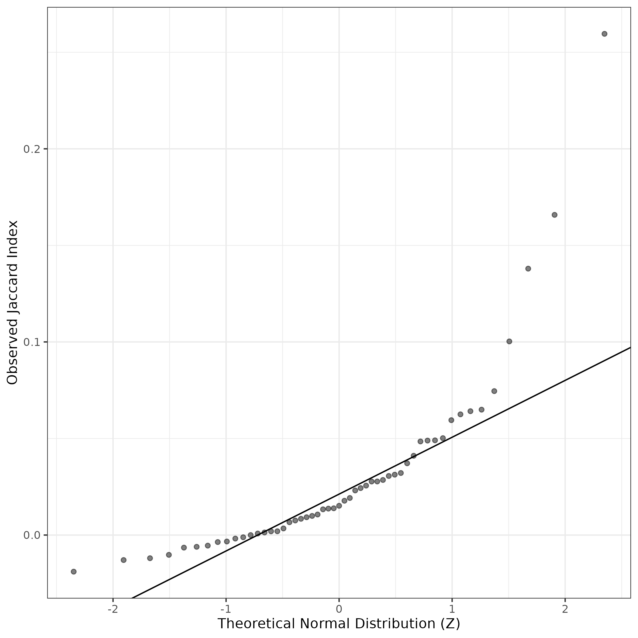 A similar QQ-plot as above, but only for instances where the H value is e.g. > 25, i.e. we are confident that the expression program is active above noise. Agreemenet between these binary vectors is tested using the Jaccard Index, with the P-values calculated by an exact test: