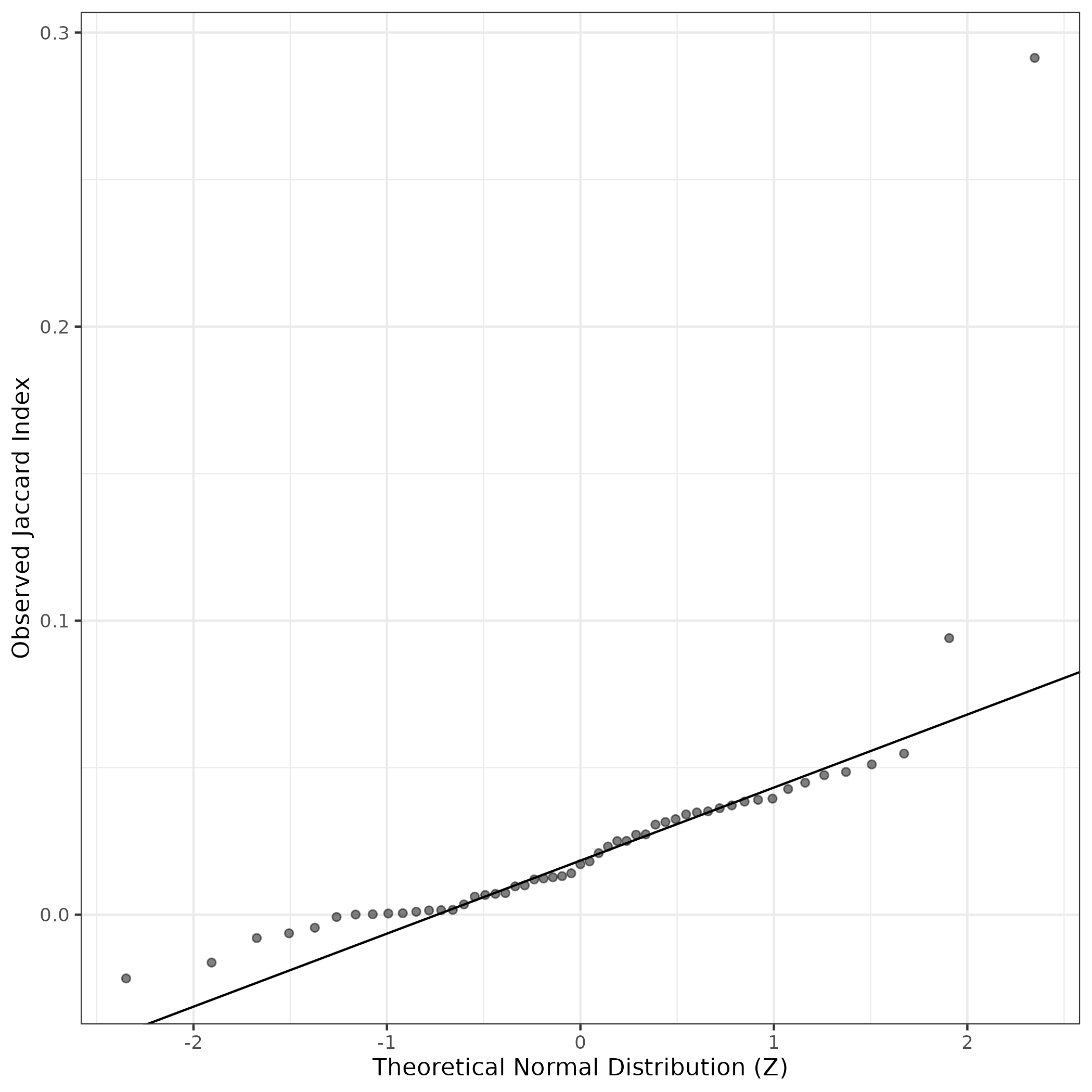 A similar QQ-plot as above, but only for instances where the H value is e.g. > 25, i.e. we are confident that the expression program is active above noise. Agreemenet between these binary vectors is tested using the Jaccard Index, with the P-values calculated by an exact test: