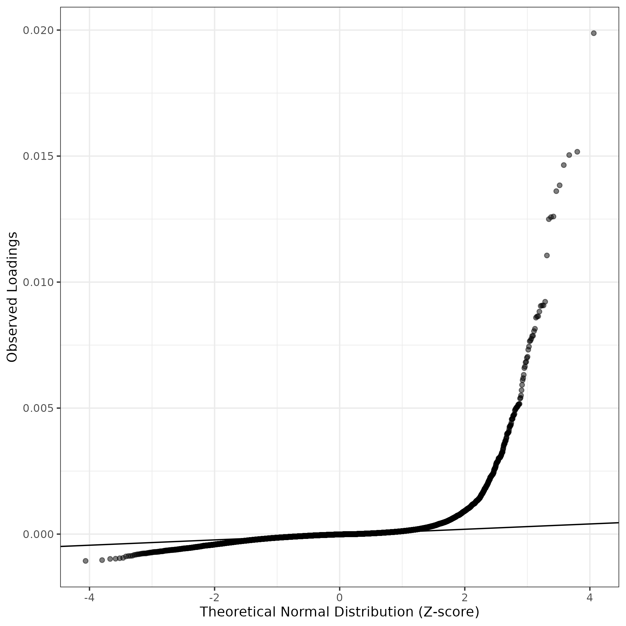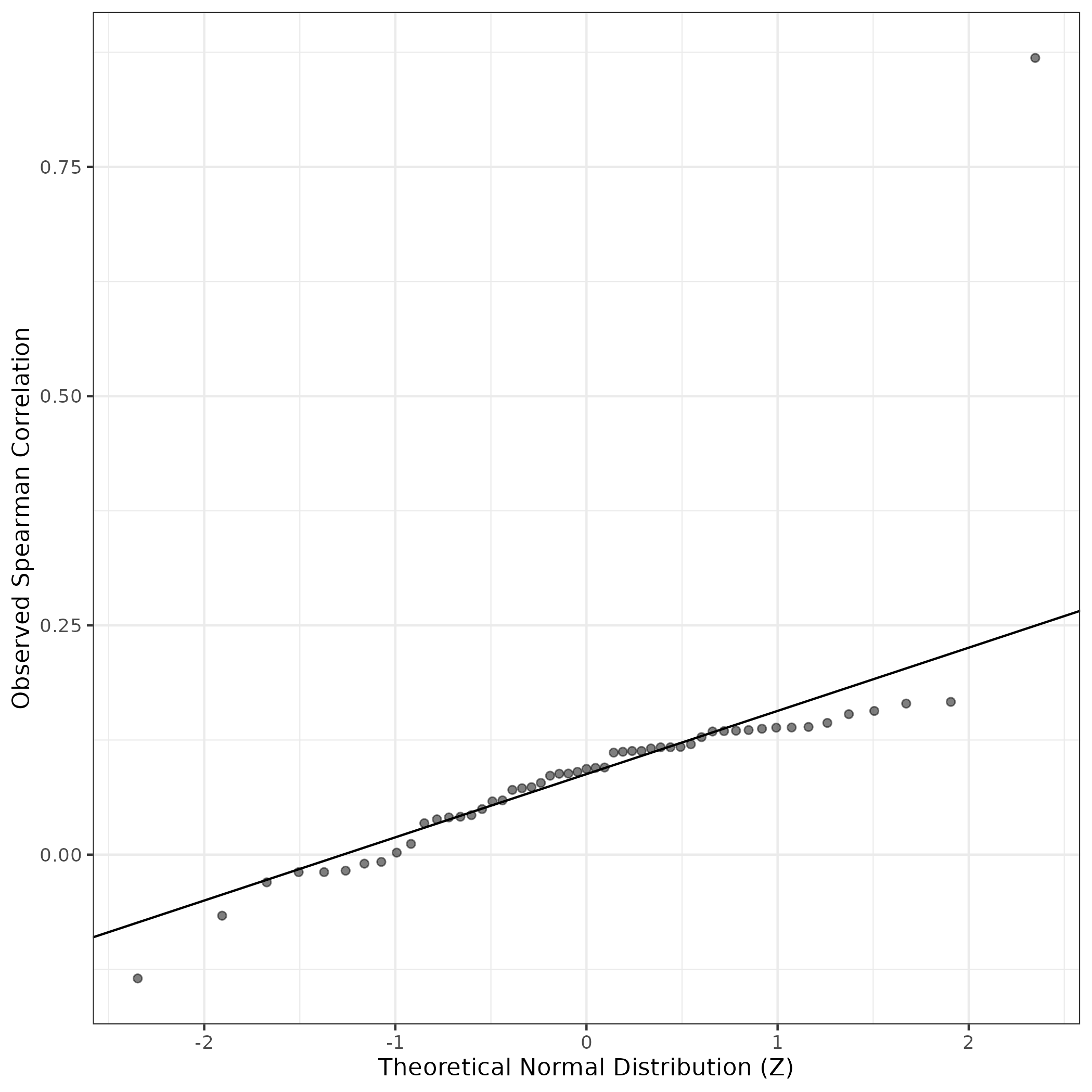 A similar QQ-plot as above, but only for instances where the H value is e.g. > 25, i.e. we are confident that the expression program is active above noise. Agreemenet between these binary vectors is tested using the Jaccard Index, with the P-values calculated by an exact test: