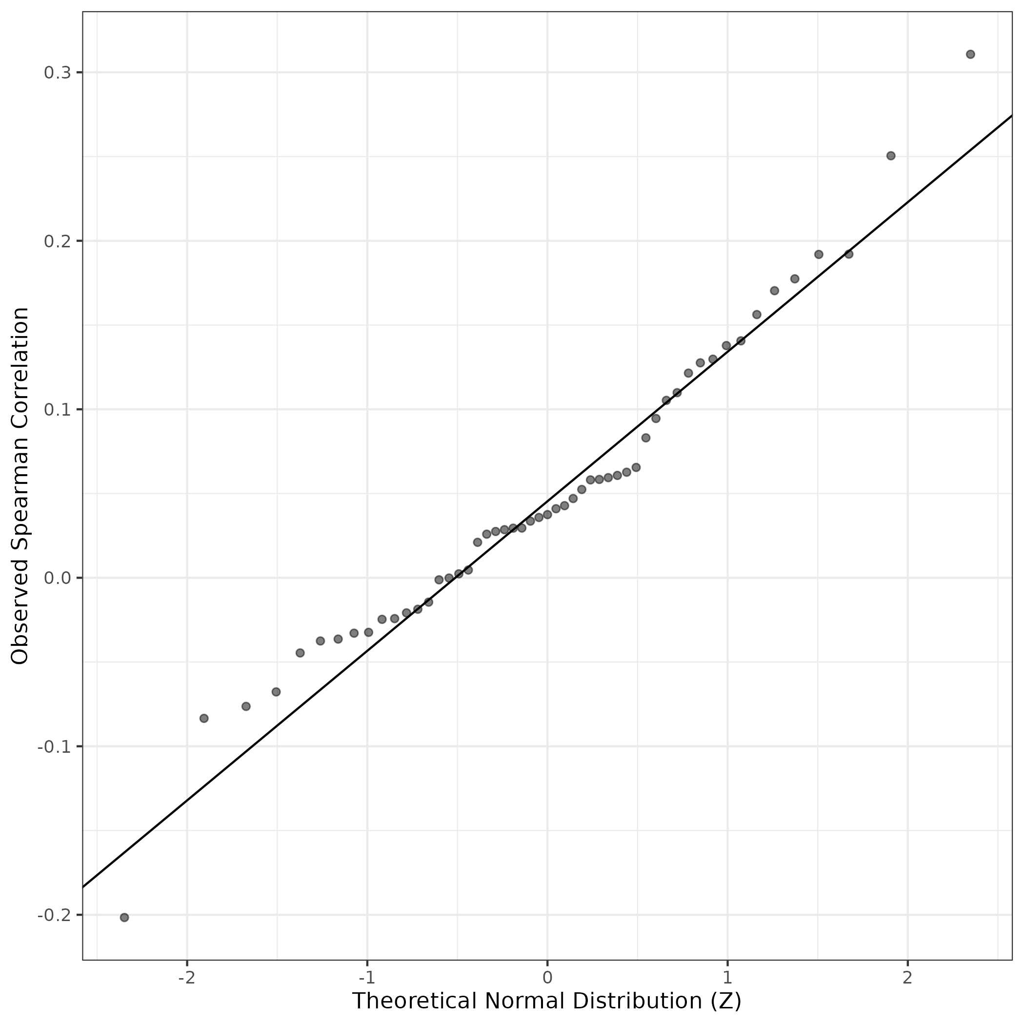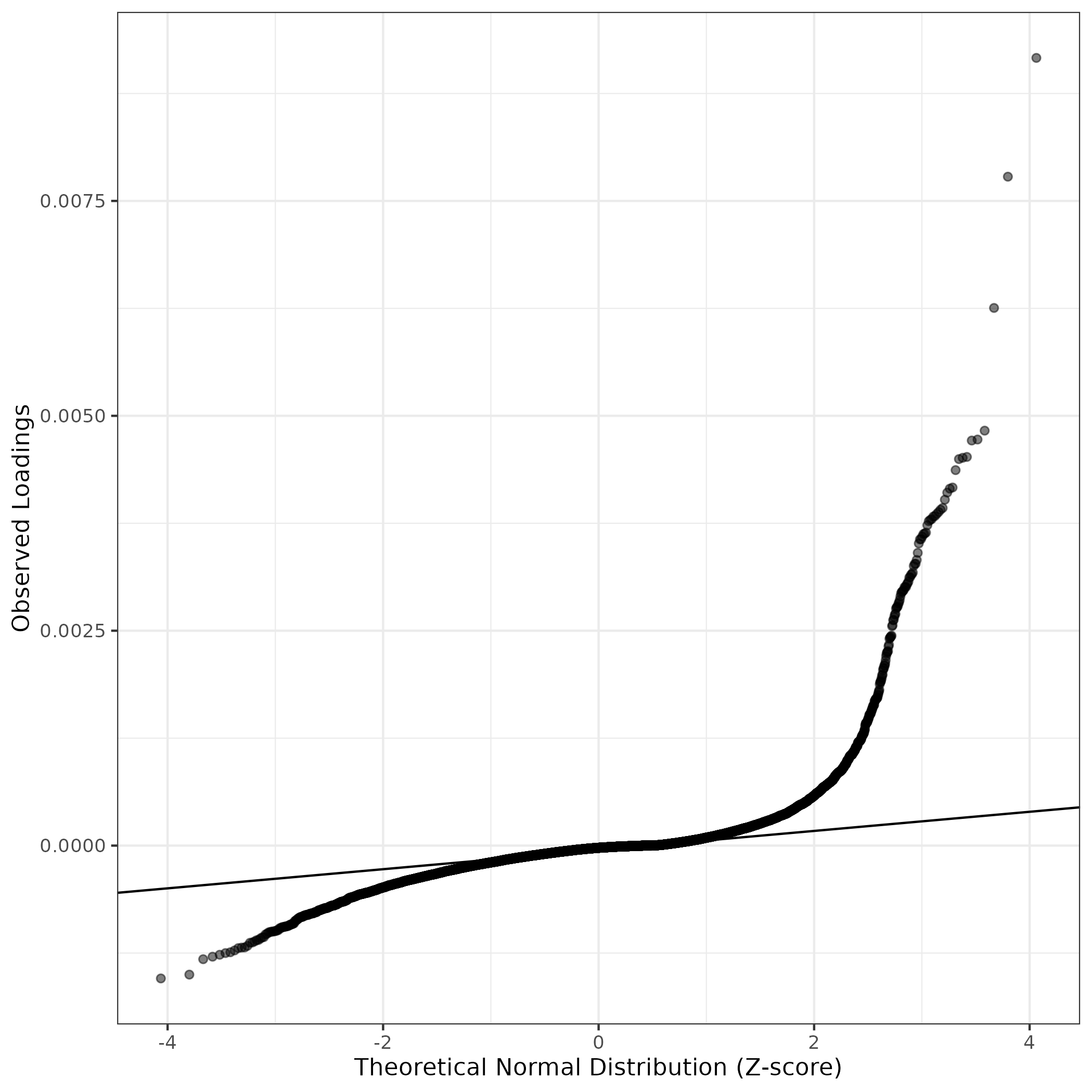 QQ-plot of gene loadings, averaged over both independent splits of the data