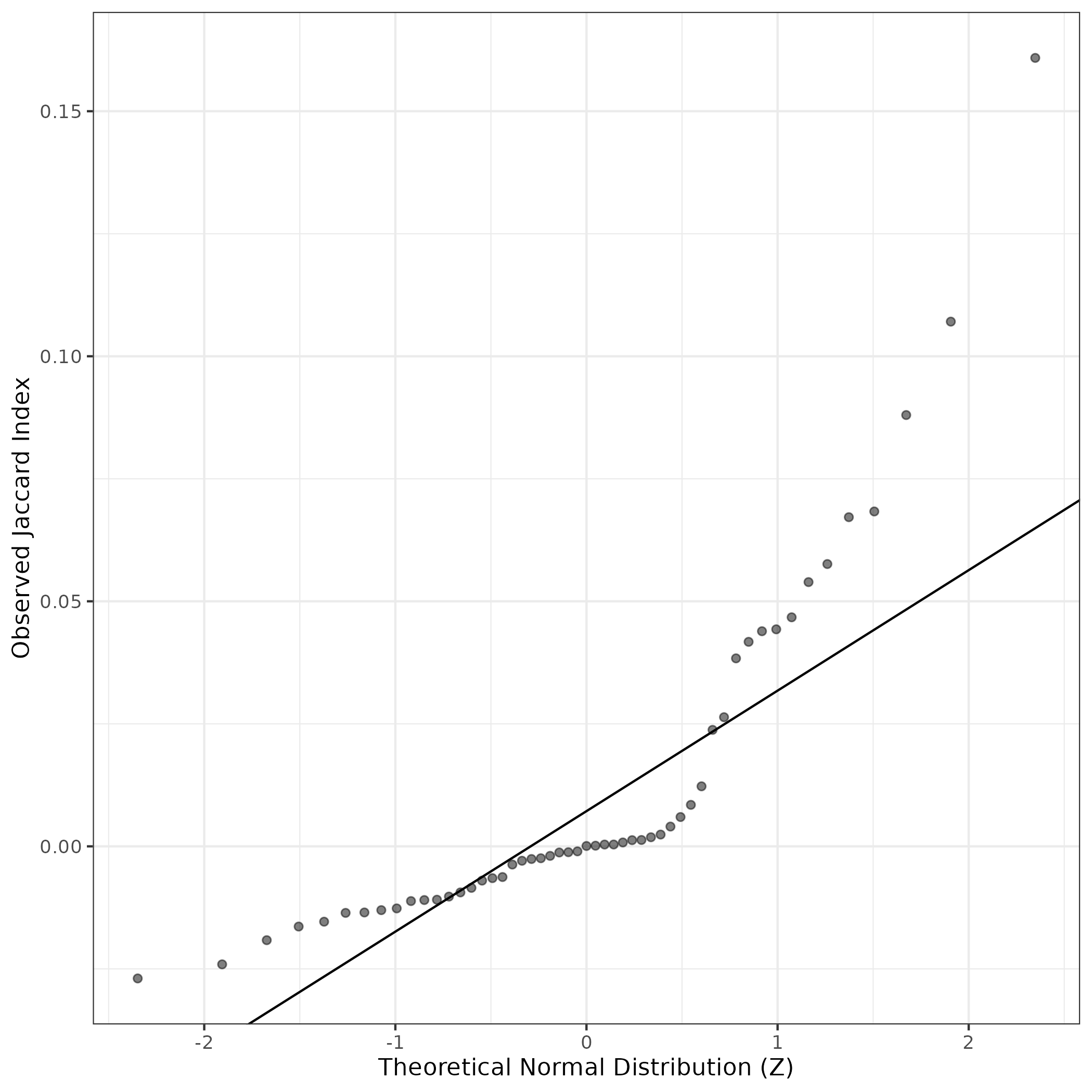 A similar QQ-plot as above, but only for instances where the H value is e.g. > 25, i.e. we are confident that the expression program is active above noise. Agreemenet between these binary vectors is tested using the Jaccard Index, with the P-values calculated by an exact test: