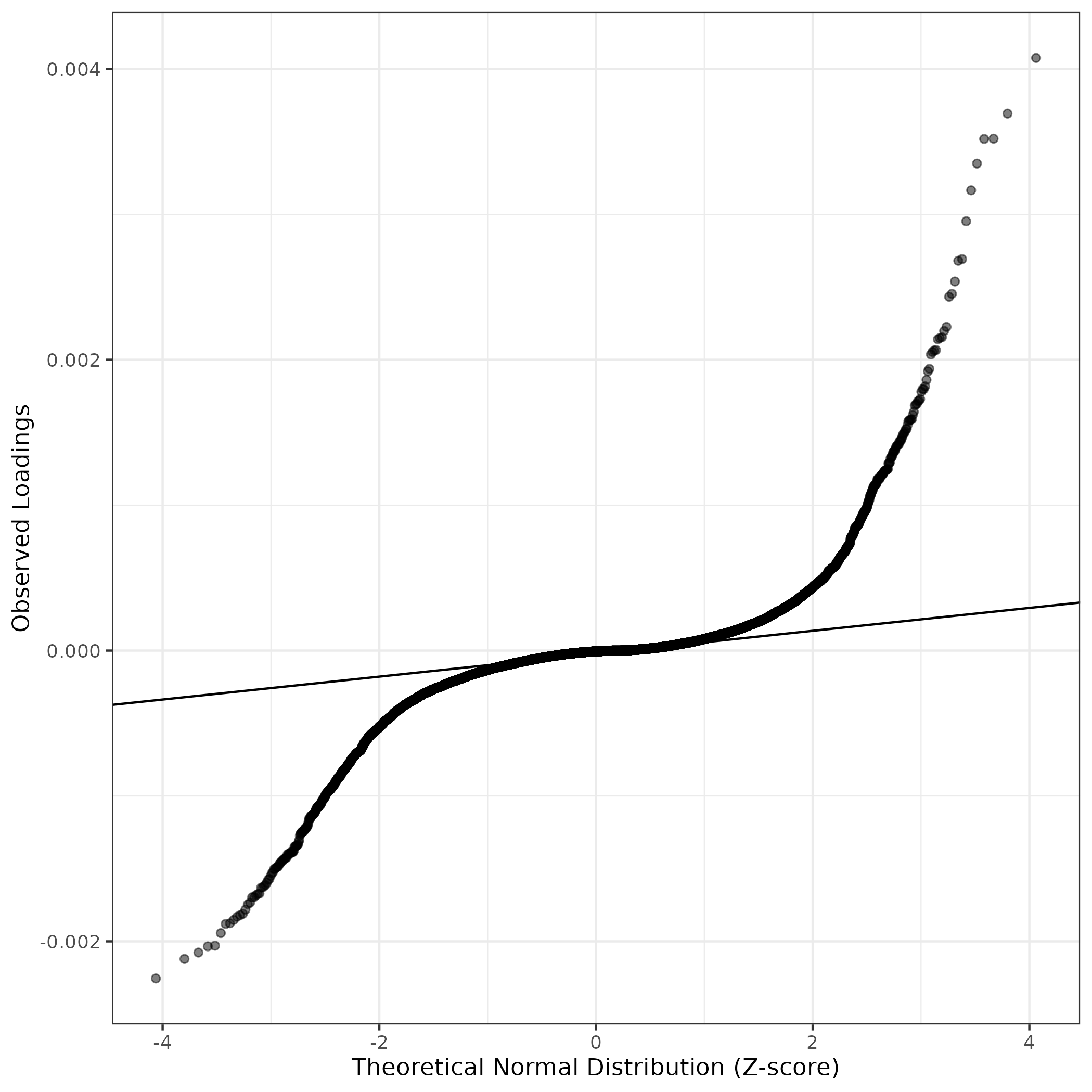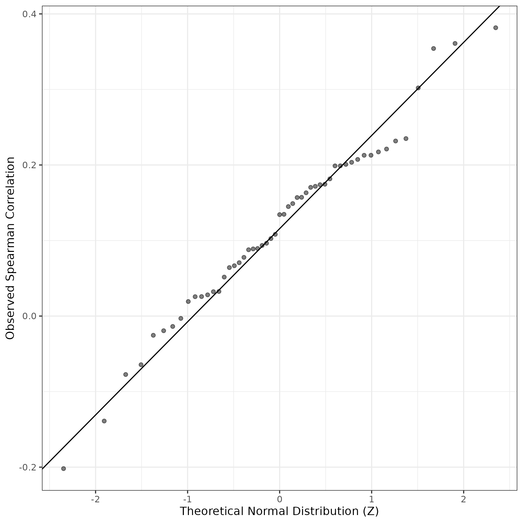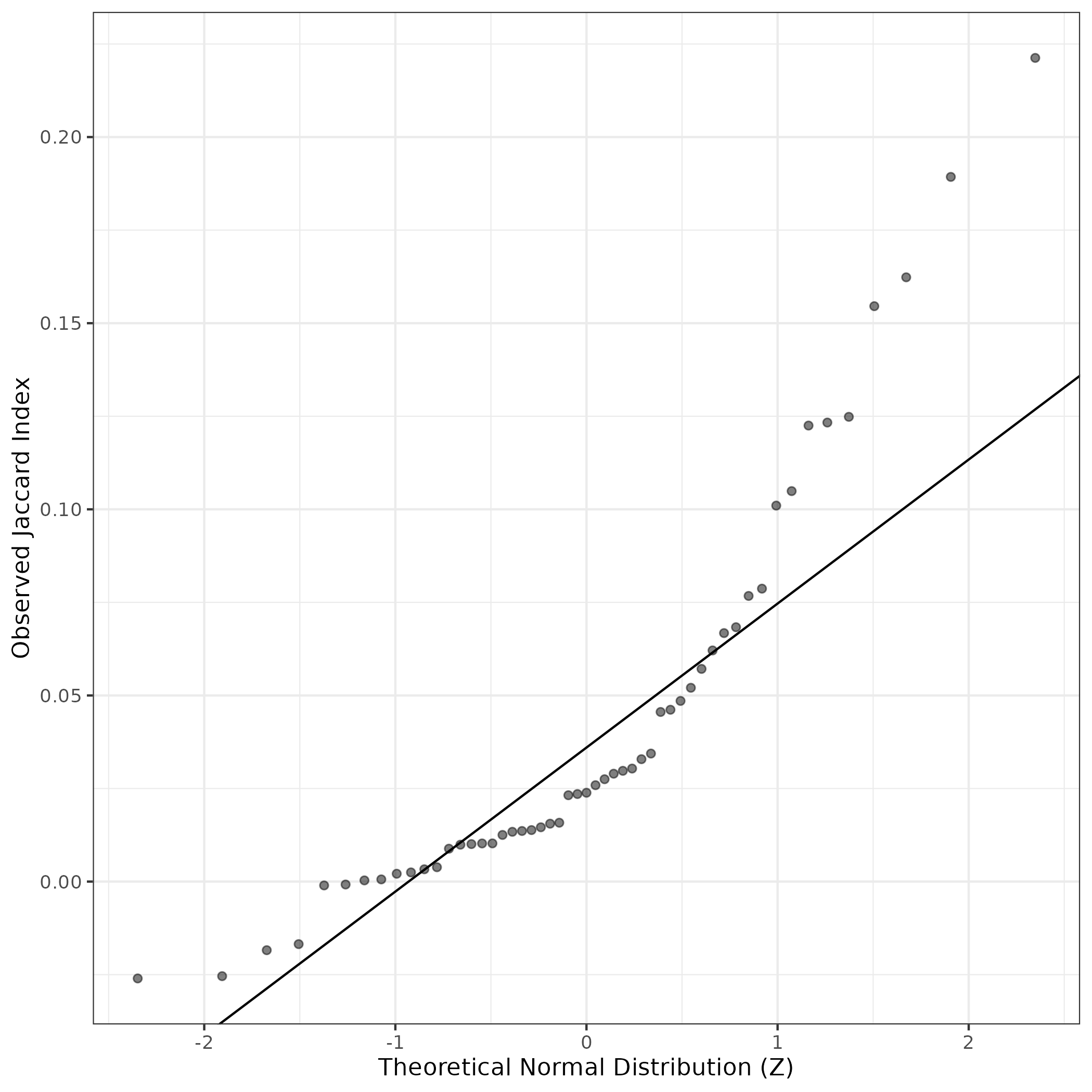 A similar QQ-plot as above, but only for instances where the H value is e.g. > 25, i.e. we are confident that the expression program is active above noise. Agreemenet between these binary vectors is tested using the Jaccard Index, with the P-values calculated by an exact test: