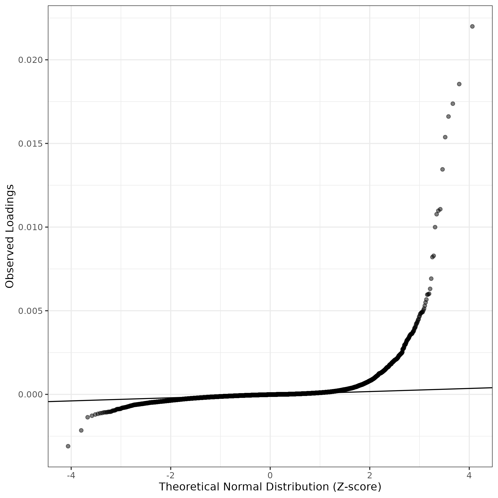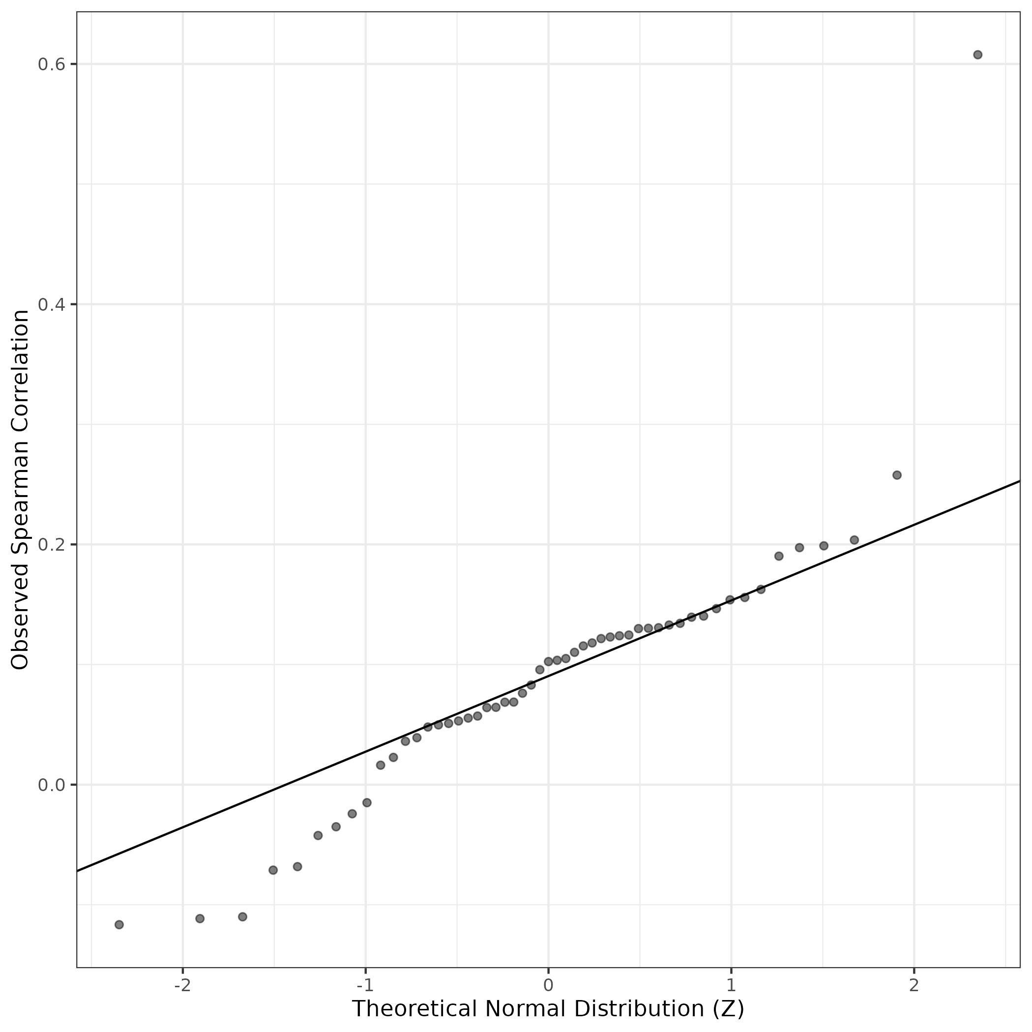 A similar QQ-plot as above, but only for instances where the H value is e.g. > 25, i.e. we are confident that the expression program is active above noise. Agreemenet between these binary vectors is tested using the Jaccard Index, with the P-values calculated by an exact test: