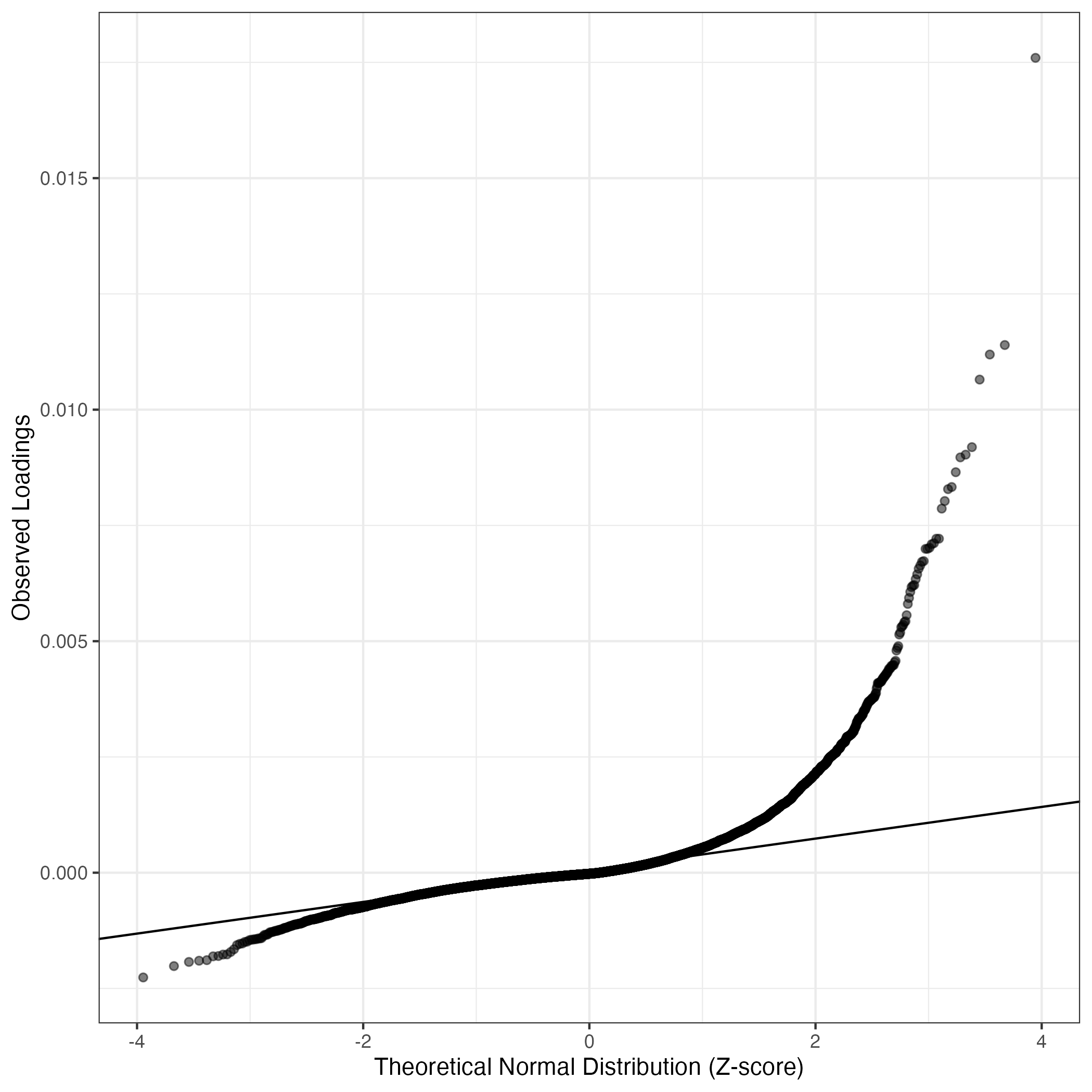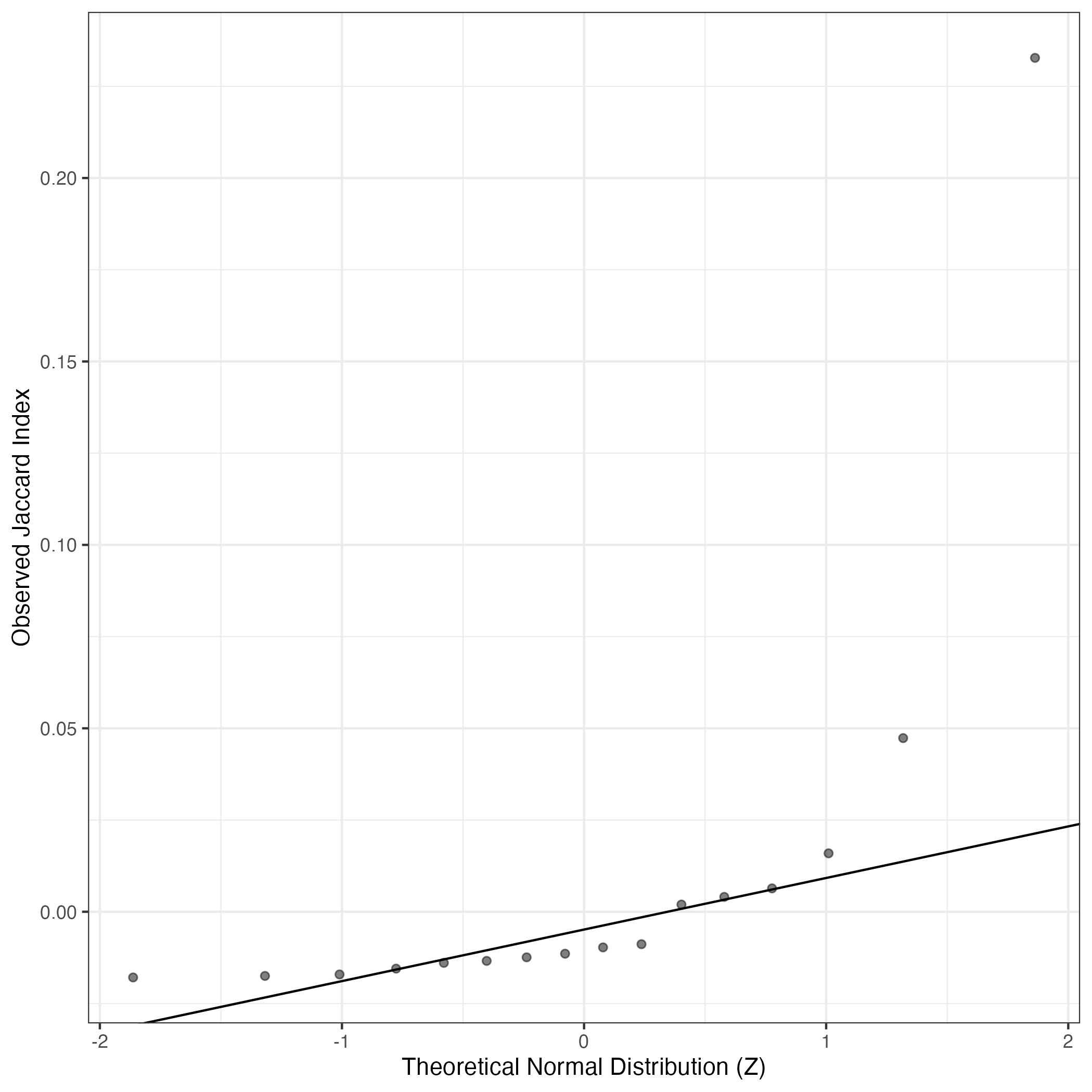A similar QQ-plot as above, but only for instances where the H value is e.g. > 25, i.e. we are confident that the expression program is active above noise. Agreemenet between these binary vectors is tested using the Jaccard Index, with the P-values calculated by an exact test: