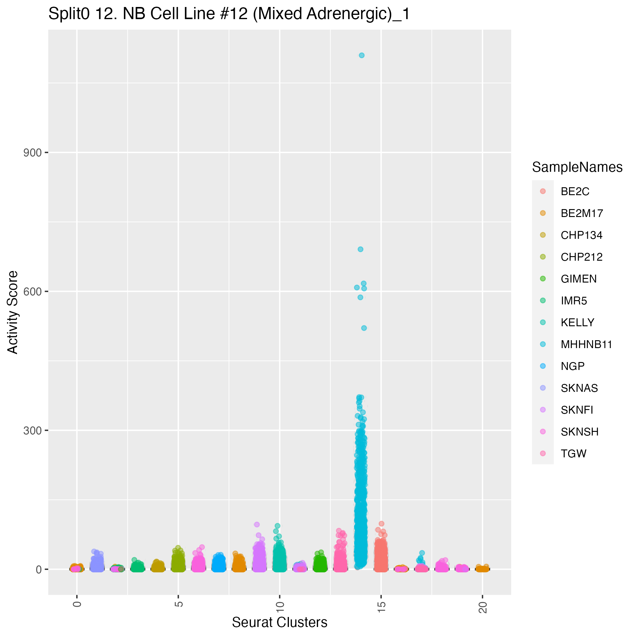 Adrenergic proliferating cluster (Olsen) Stated on pages 6 and 7 of the main text of Olsen et al. https://www.biorxiv.org/content/10.1101/2020.05.04.077057v1 - it is argued that upon reanalysis of the adrenergic neuroblastoma cells, there is further heterogeneity, grouped into proliferating, mature and immature cell populations. These genes were found as markers for proliferating adrenergic cells: Wilcoxon ranksum test P-value for gene set overrepresentation: 5.64e-01 Mean rank of genes in gene set: 6690 Rank on gene expression program of genes in gene set: