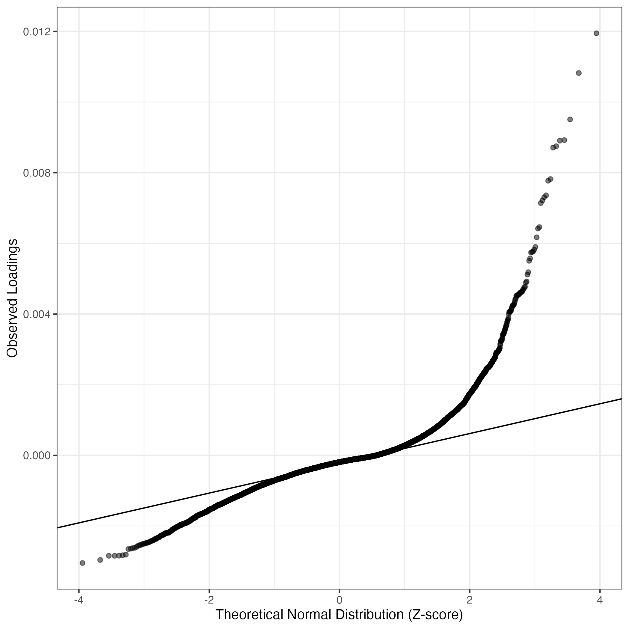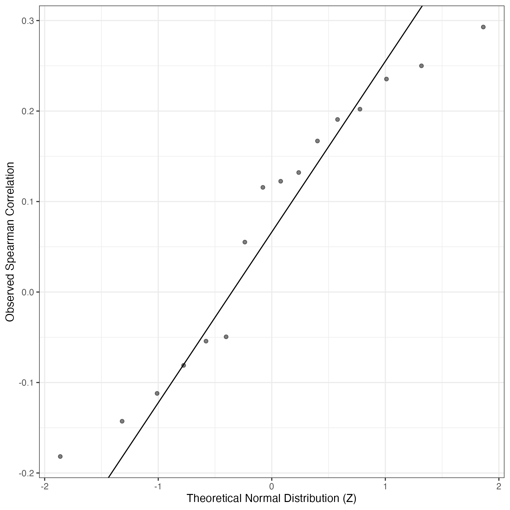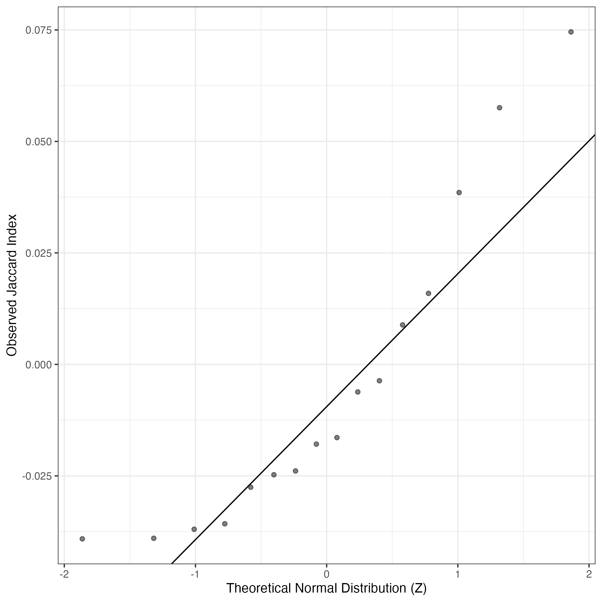 A similar QQ-plot as above, but only for instances where the H value is e.g. > 25, i.e. we are confident that the expression program is active above noise. Agreemenet between these binary vectors is tested using the Jaccard Index, with the P-values calculated by an exact test: