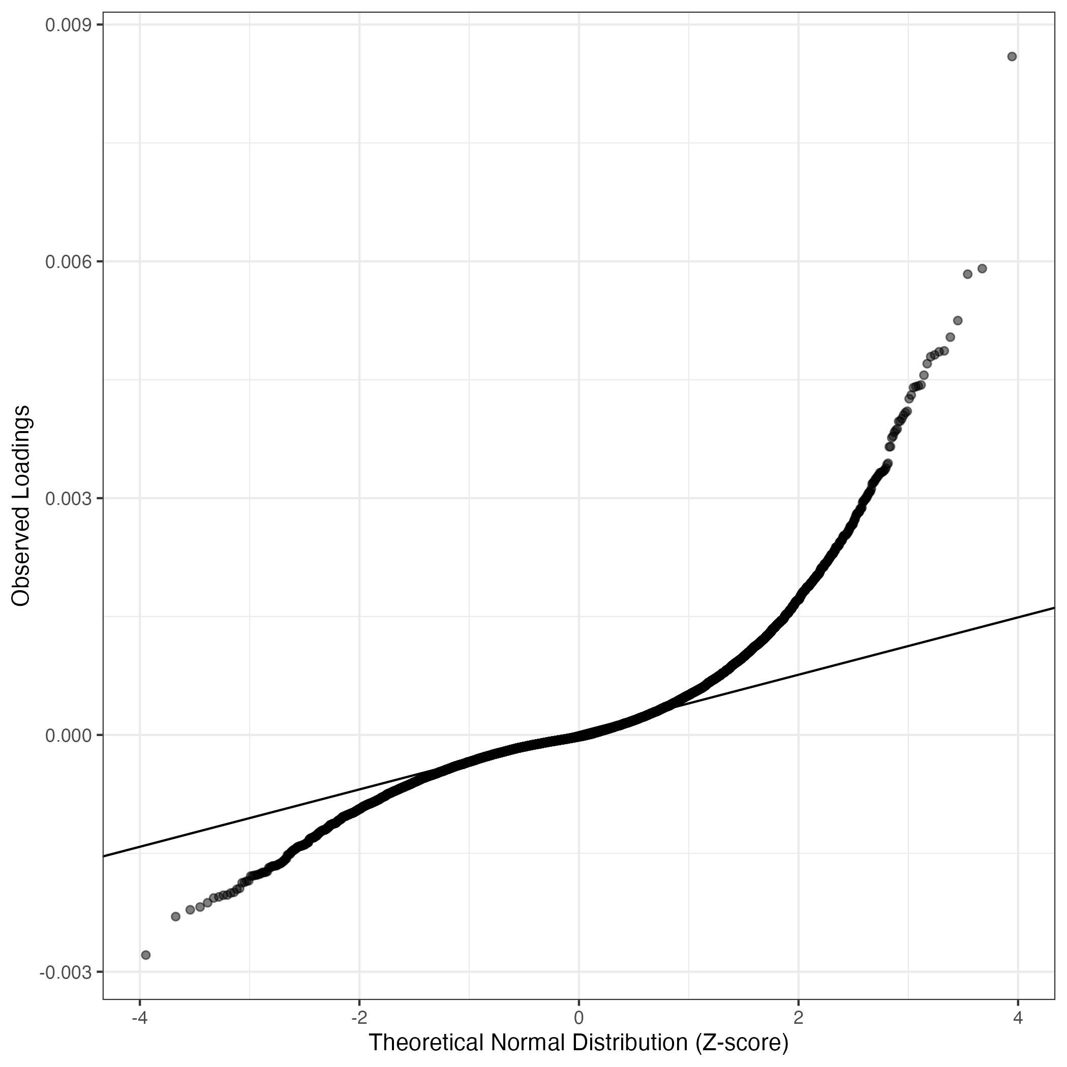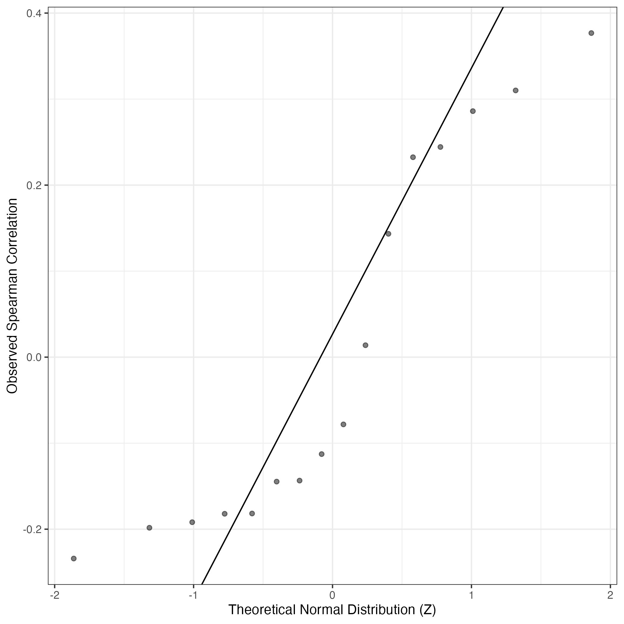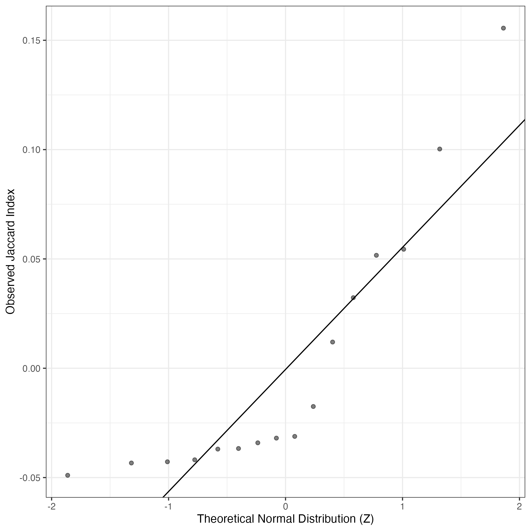 A similar QQ-plot as above, but only for instances where the H value is e.g. > 25, i.e. we are confident that the expression program is active above noise. Agreemenet between these binary vectors is tested using the Jaccard Index, with the P-values calculated by an exact test: